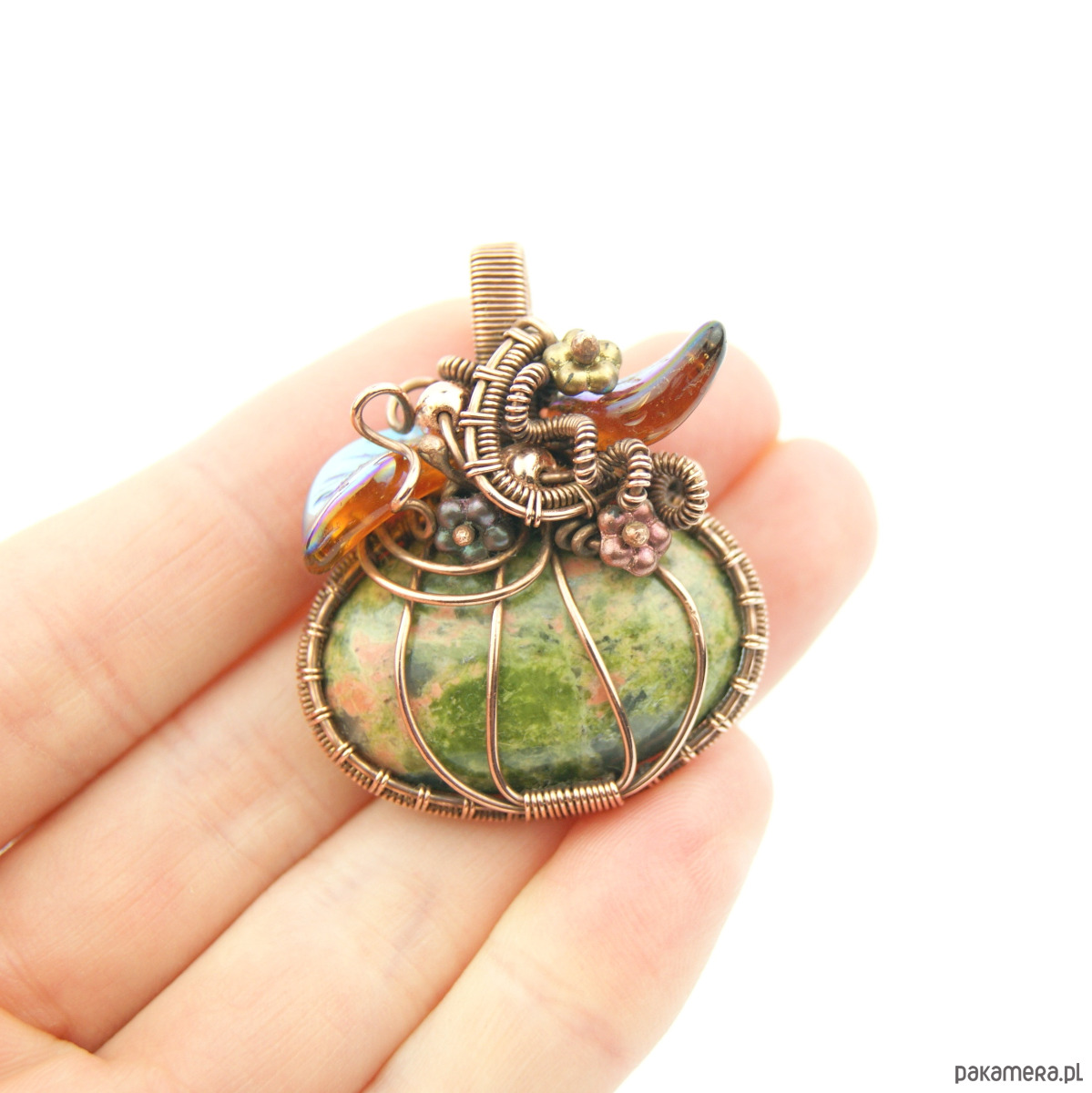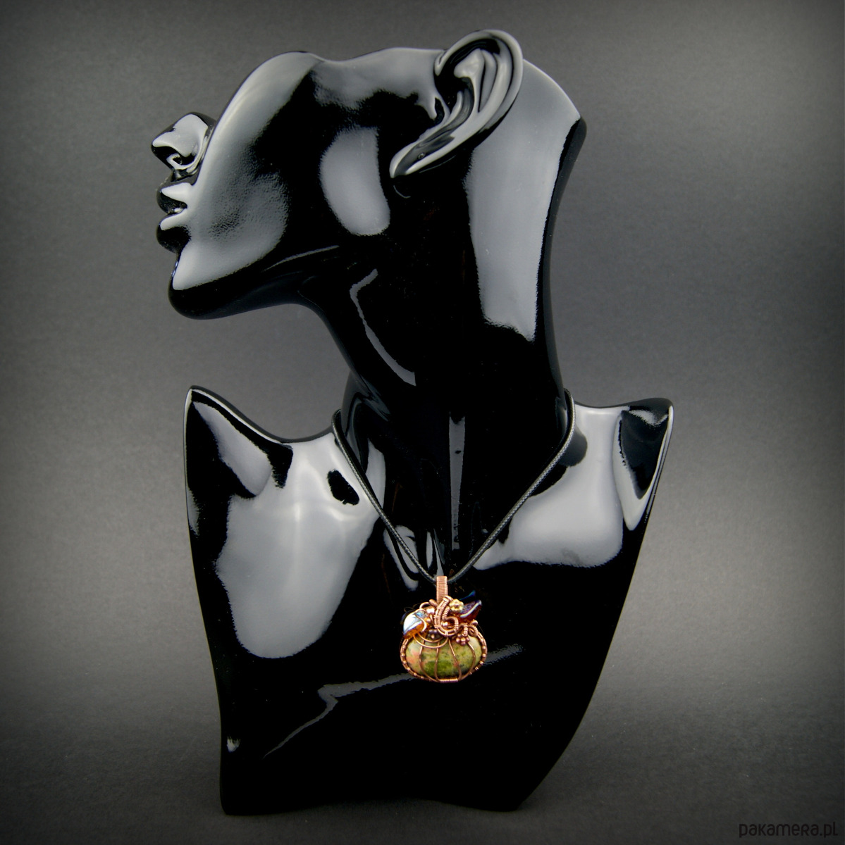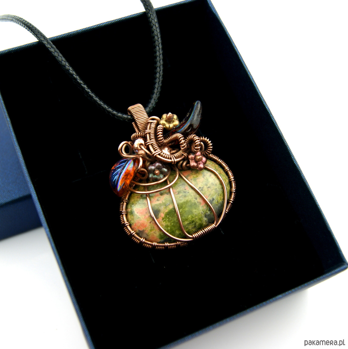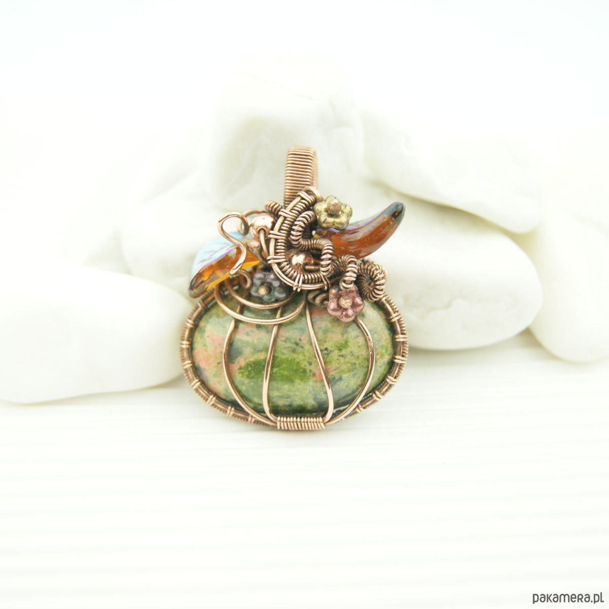 Wisiorek ma formę nawiązującą do jesiennej dyni, powstał z kamienia (unakitu) w kolorze zieleni i pomarańczu. Całość opleciono misternie miedzią, w której połyskują złote hematyty i szklane, opalizujące listki.