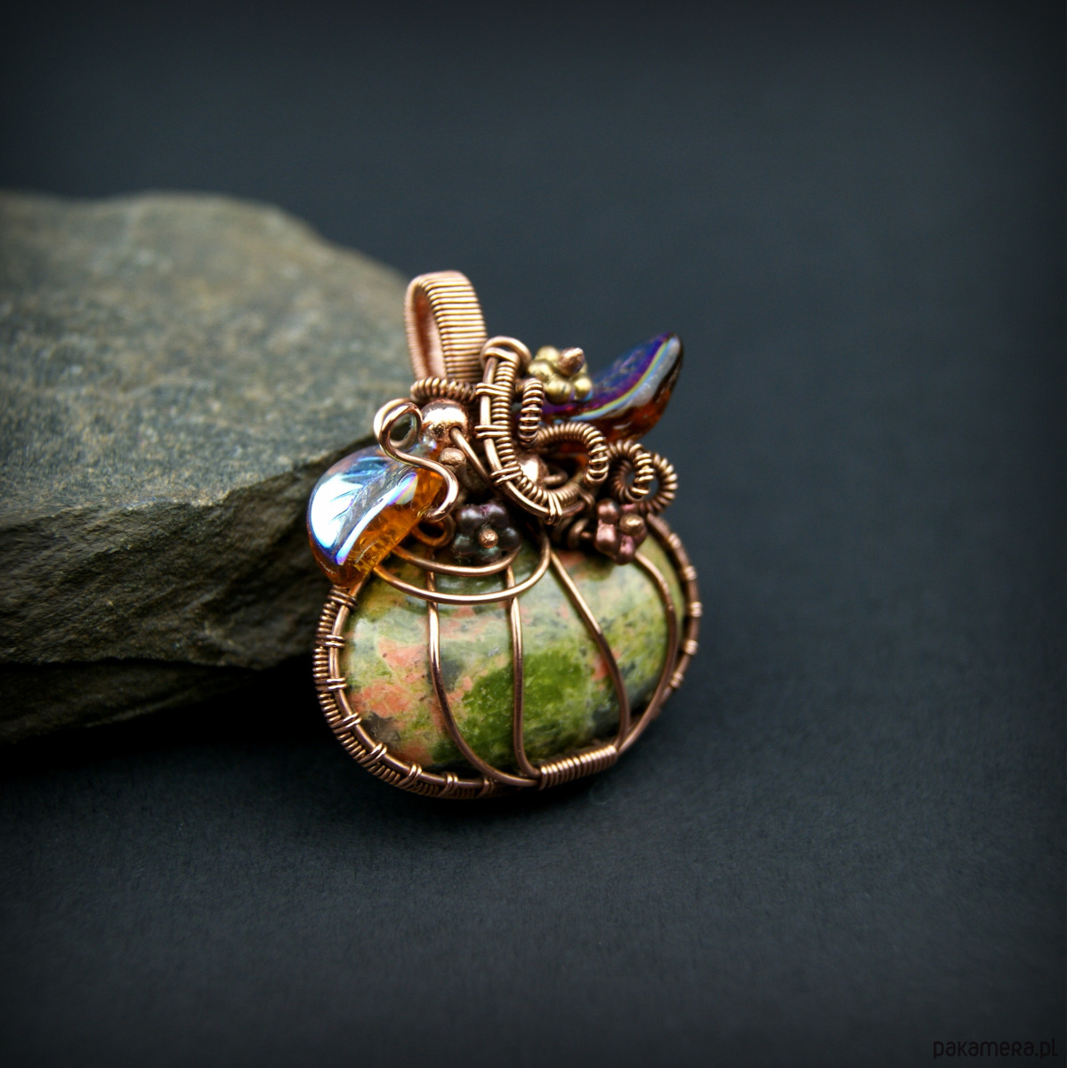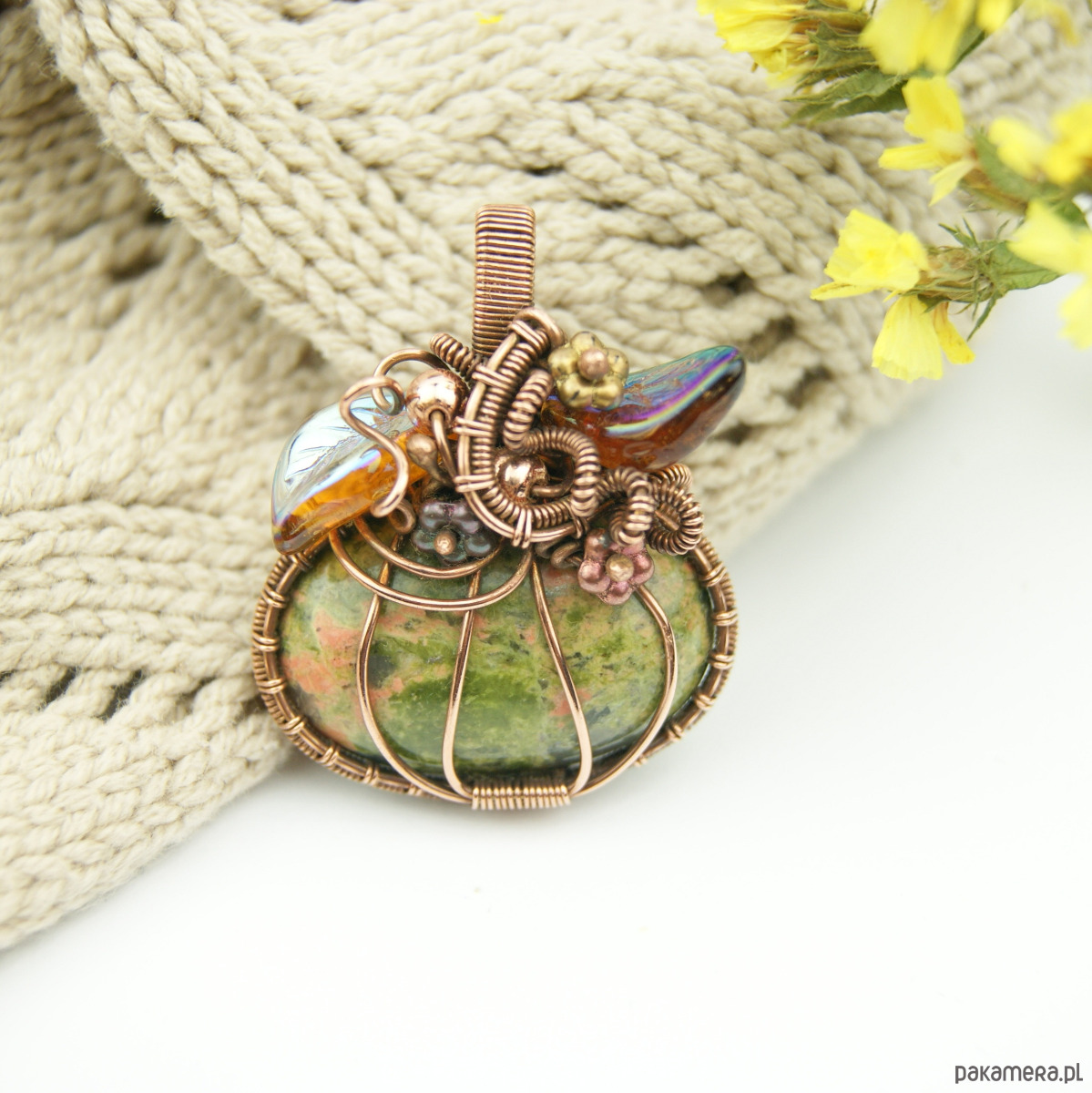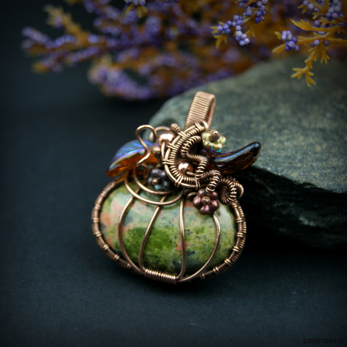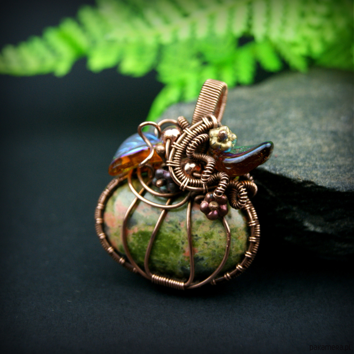 Wisiorek ma formę nawiązującą do jesiennej dyni, powstał z kamienia (unakitu) w kolorze zieleni i pomarańczu. Całość opleciono misternie miedzią, w której połyskują złote hematyty i szklane, opalizujące listki.
