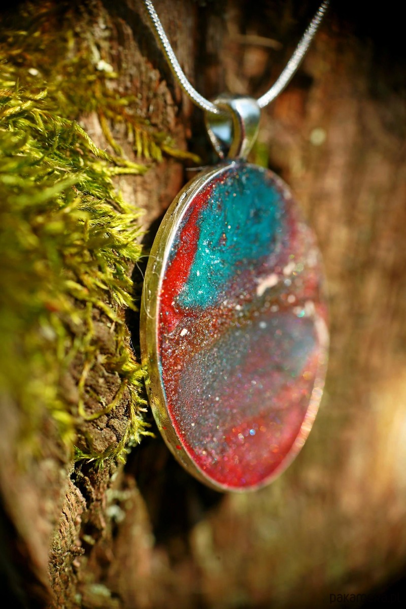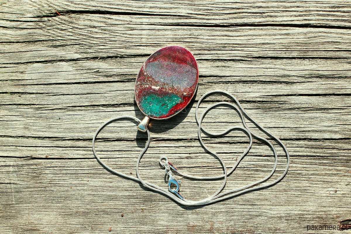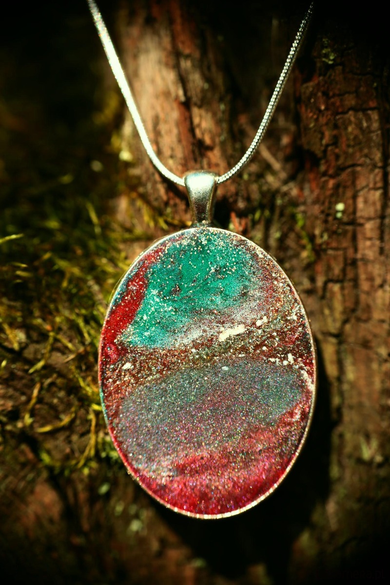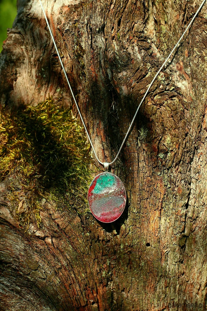 Ten owalny wisiorek to miniaturowy pejzaż zamknięty pod gładką taflą żywicy, który mieni się tysiącem świetlistych drobin. Wygląda jak kadr uchwycony z odległej planety lub przekrój rzadkiego minerału. Kompozycja opiera się na przenikaniu chłodnego szmaragdu i morskiej zieleni z głęboką, niemal bordową czerwienią.