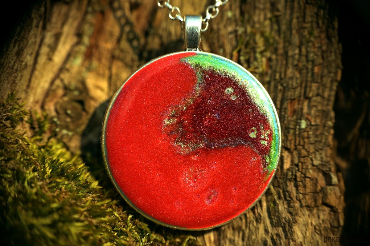 Ten wisiorek przypomina mikroskopijny wybuch supernowej uwięziony w kropli przejrzystej żywicy. To kompozycja, w której elegancja formy spotyka się z nieokiełznaną energią barw. Centralna część wisiorka to pulsująca, głęboka czerwień o satynowym połysku. Wygląda jak płynna materia, która wciąż jeszcze nie zdążyła zastygnąć, emanując ciepłem i intensywnością. Przez krawędź naczynia wdziera się chłodny, elektryzujący błękit i zieleń. Ten kontrastujący akcent wygląda jak światło przebijające się przez mrok, nadając całości wymiaru mistycznego, niemal magicznego.