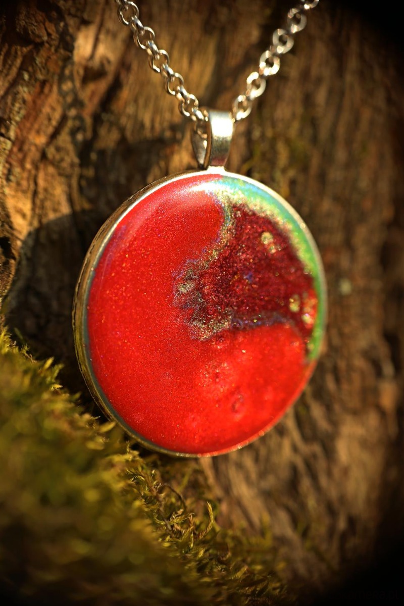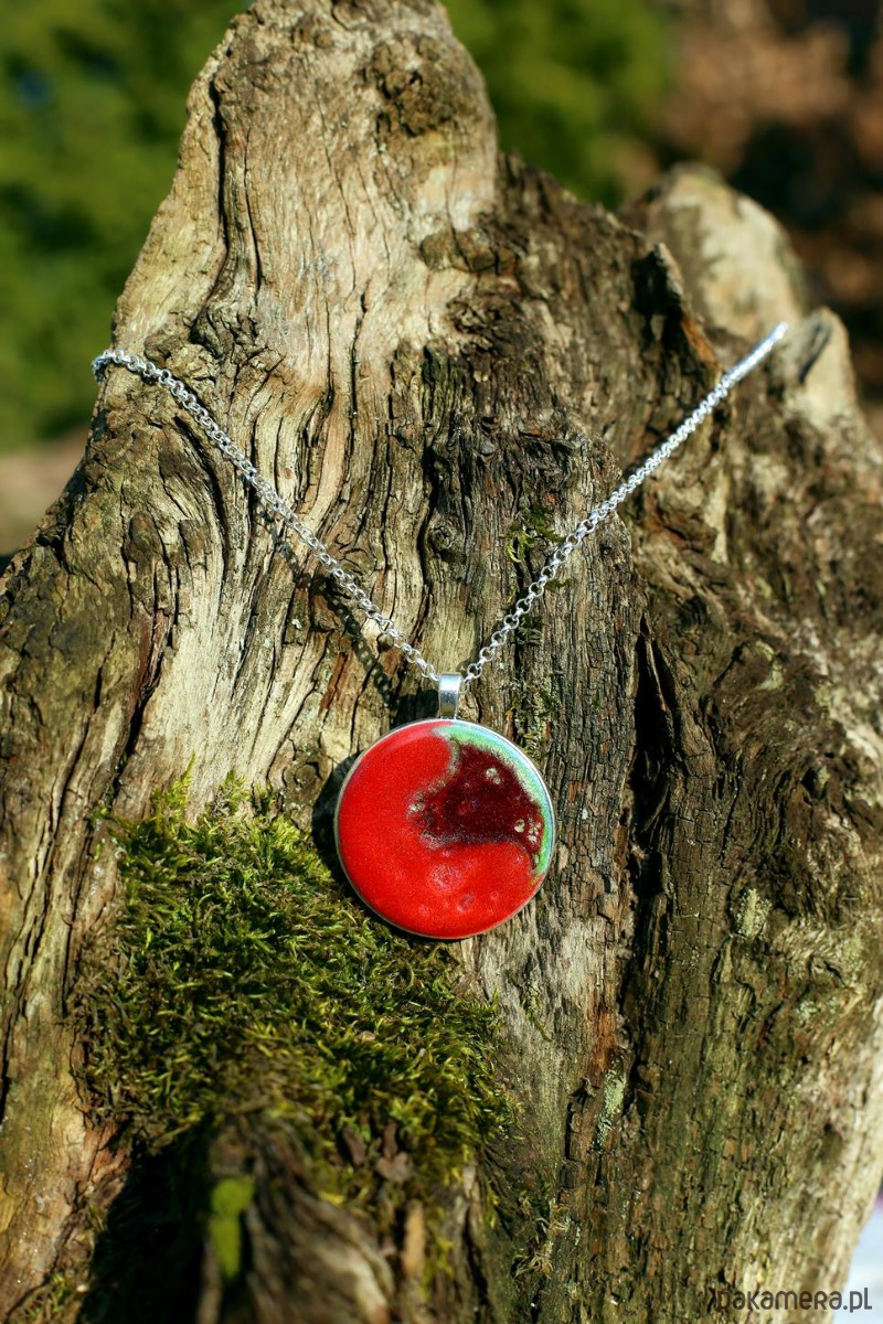 Wisiorek zrobiony jest z żywicy epoksydowej z dodatkiem barwników i pigmentów i zawieszony jest na pięknym łańcuszku. Jego wymiary: śr. - 40 mm, dł. łańcuszka - 60 cm.