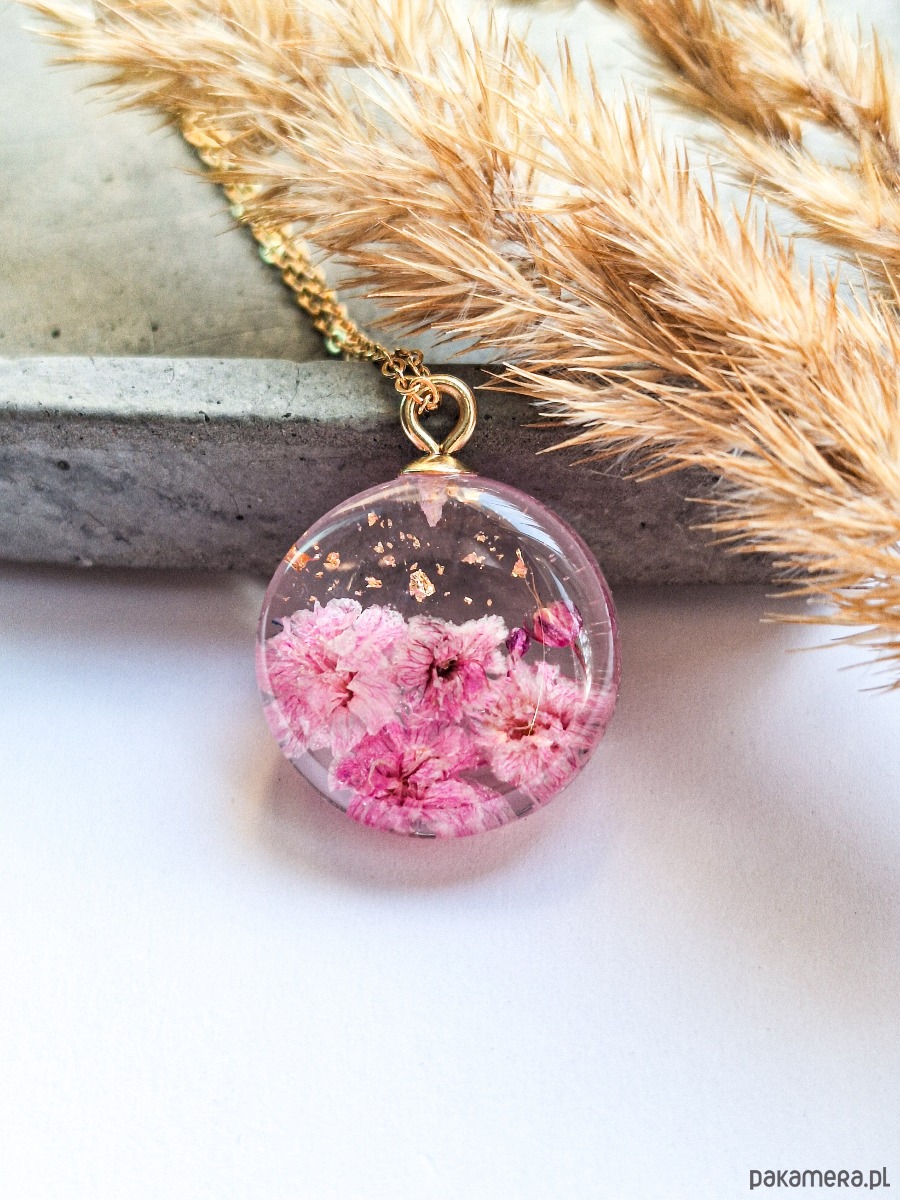Uroczy wisiorek z zatopionymi kwiatami różowej gipsówki i płatkami złota. Wykonany z wysokiej klasy żywicy, która nie zmienia koloru pod wpływem promieniowania uv oraz wysokiej jakości stali chirurgicznej. Dostępny jest też taki sam wisiorek w większym rozmiarze, kolczyki i bransoletka.