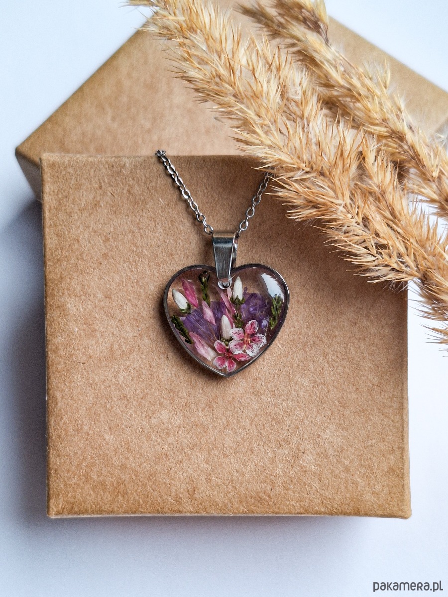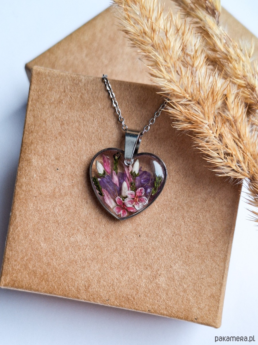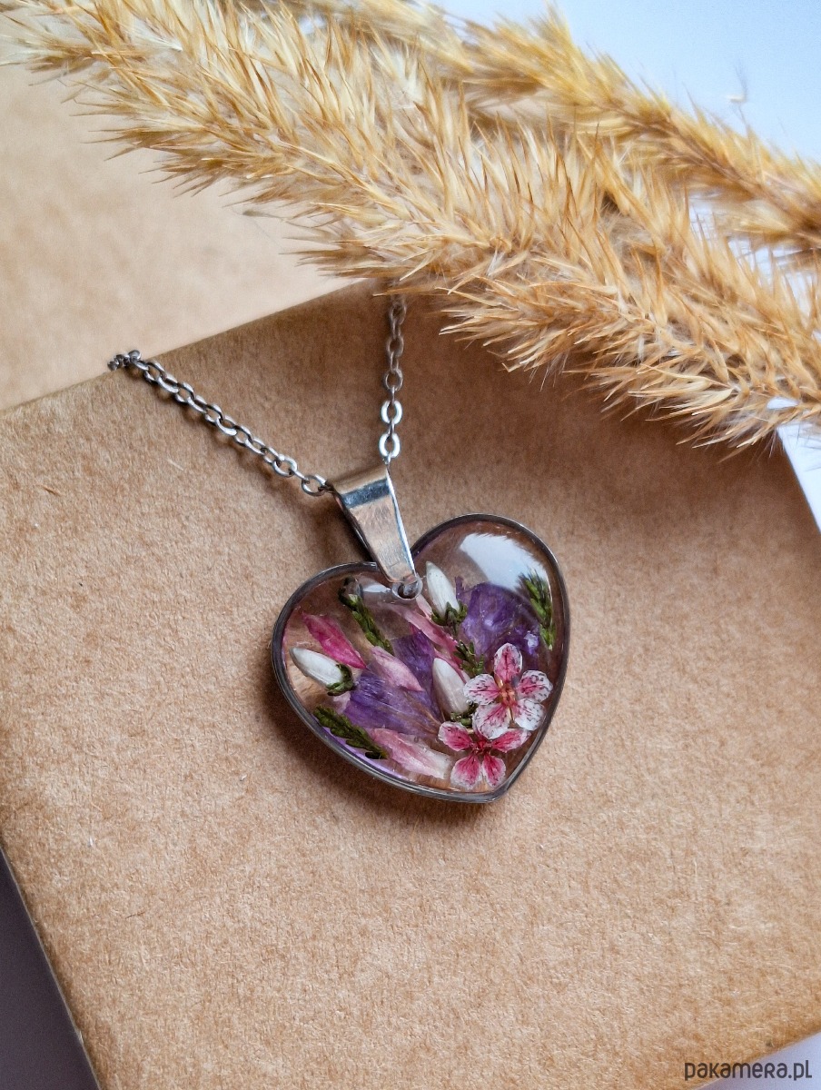 Uroczy wisiorek w kształcie serca z zatopionymi kwiatami. Wykonany z wysokiej klasy żywicy, która nie zmienia koloru pod wpływem promieniowania uv oraz wysokiej jakości stali chirurgicznej.