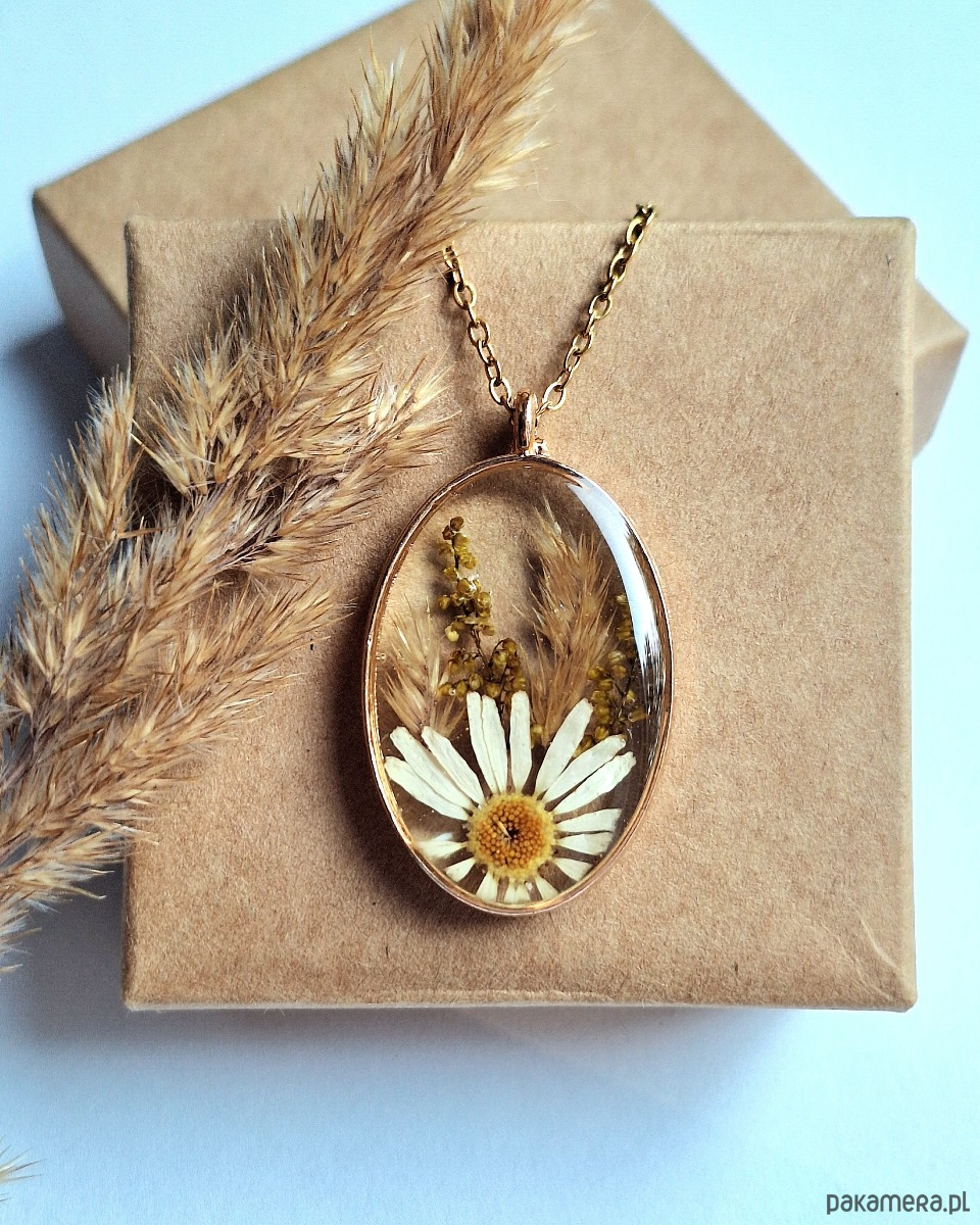 Uroczy wisiorek z zatopionymi kwiatami polnymi. Wykonany z wysokiej klasy żywicy, która nie zmienia koloru pod wpływem promieniowania uv oraz wysokiej jakości stali chirurgicznej.