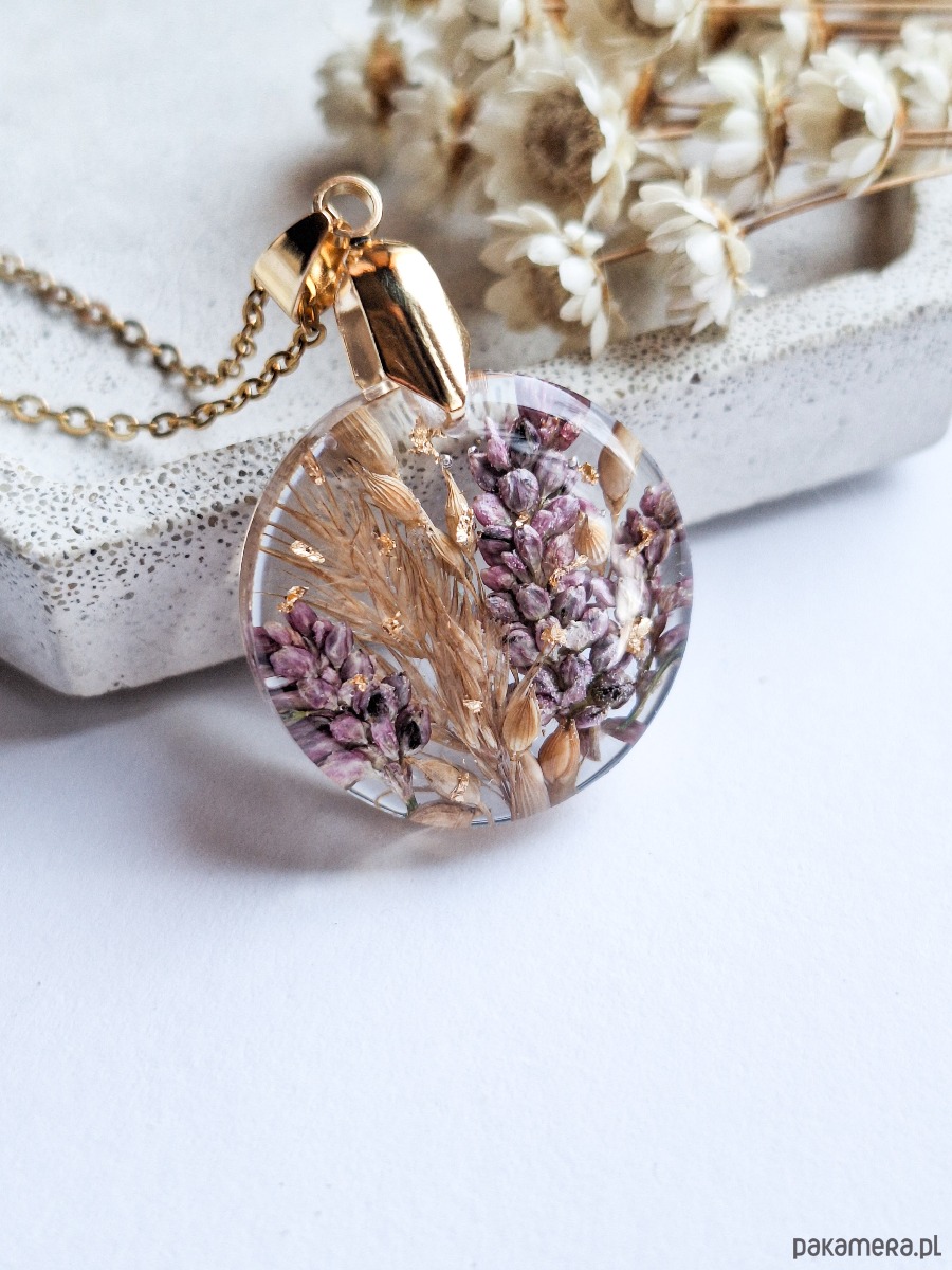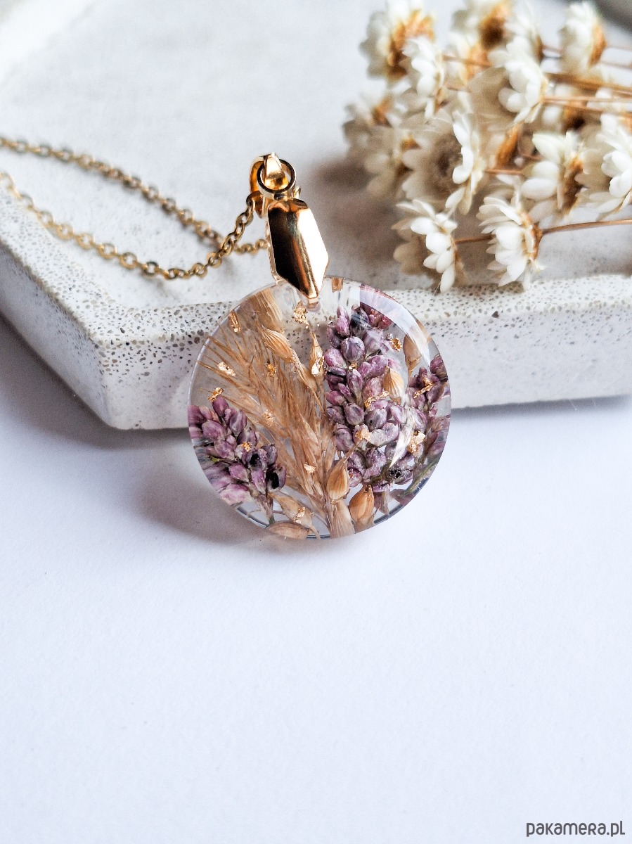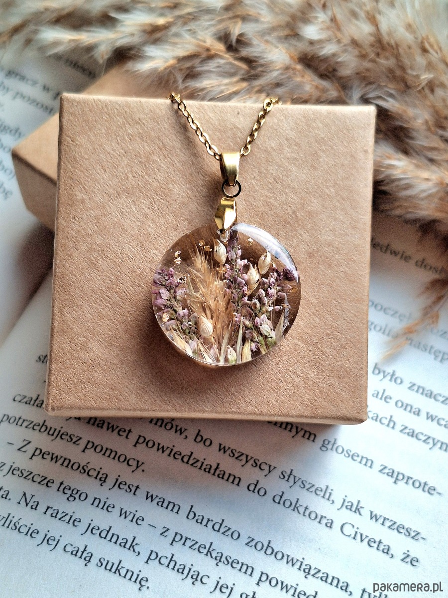 Uroczy wisiorek z zatopionymi kwiatami polnymi i płatkami złota. Wykonany z wysokiej klasy żywicy, która nie zmienia koloru pod wpływem promieniowania uv oraz wysokiej jakości stali chirurgicznej.