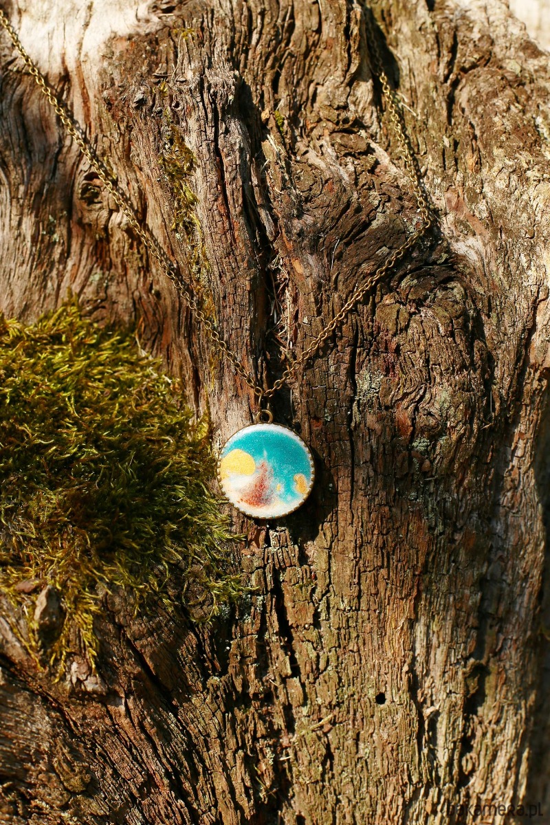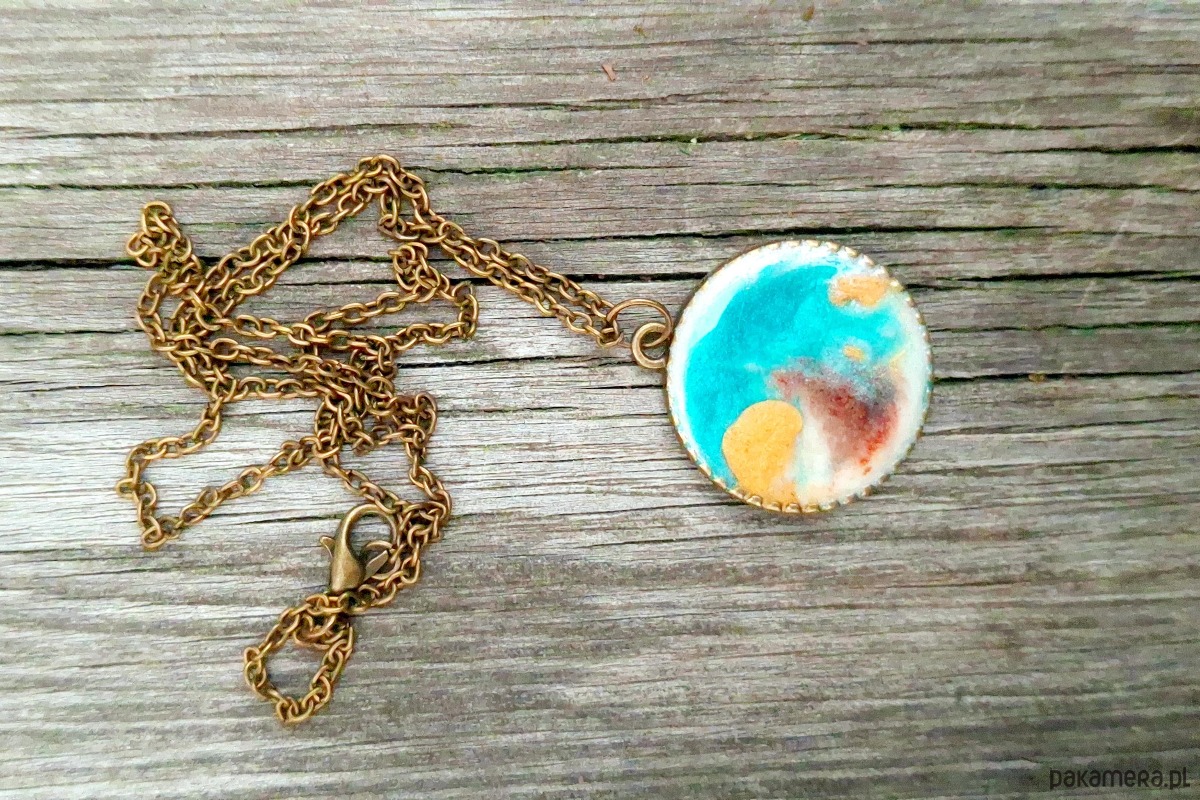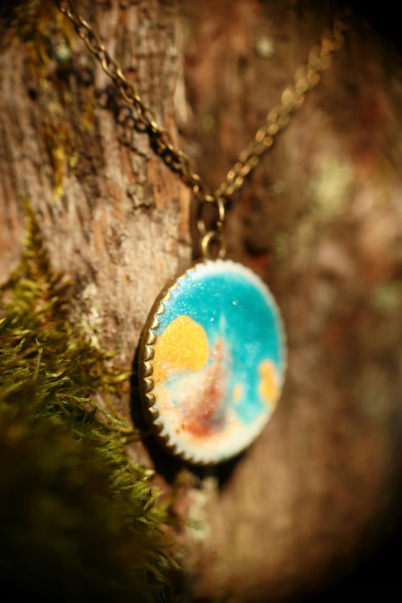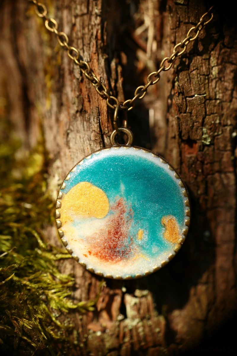 Ten wisiorek to miniaturowy pejzaż zamknięty w krystalicznej głębi. Turkusowa żywica, nasycona subtelnym blaskiem, przywodzi na myśl letnie niebo lub spokojną taflę wody, w której odbijają się pierwsze promienie słońca. Miękkie plamy złota i miedzi przenikają się z mleczną bielą, tworząc wrażenie ruchu – jakby wewnątrz wisiorka właśnie przepływały obłoki lub rozwiewał się poranny pył.