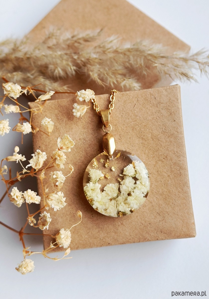Uroczy wisiorek z zatopionymi kwiatami gipsówki i płatkami złota. Wykonany z wysokiej klasy żywicy, która nie zmienia koloru pod wpływem promieniowania uv oraz wysokiej jakości stali chirurgicznej.