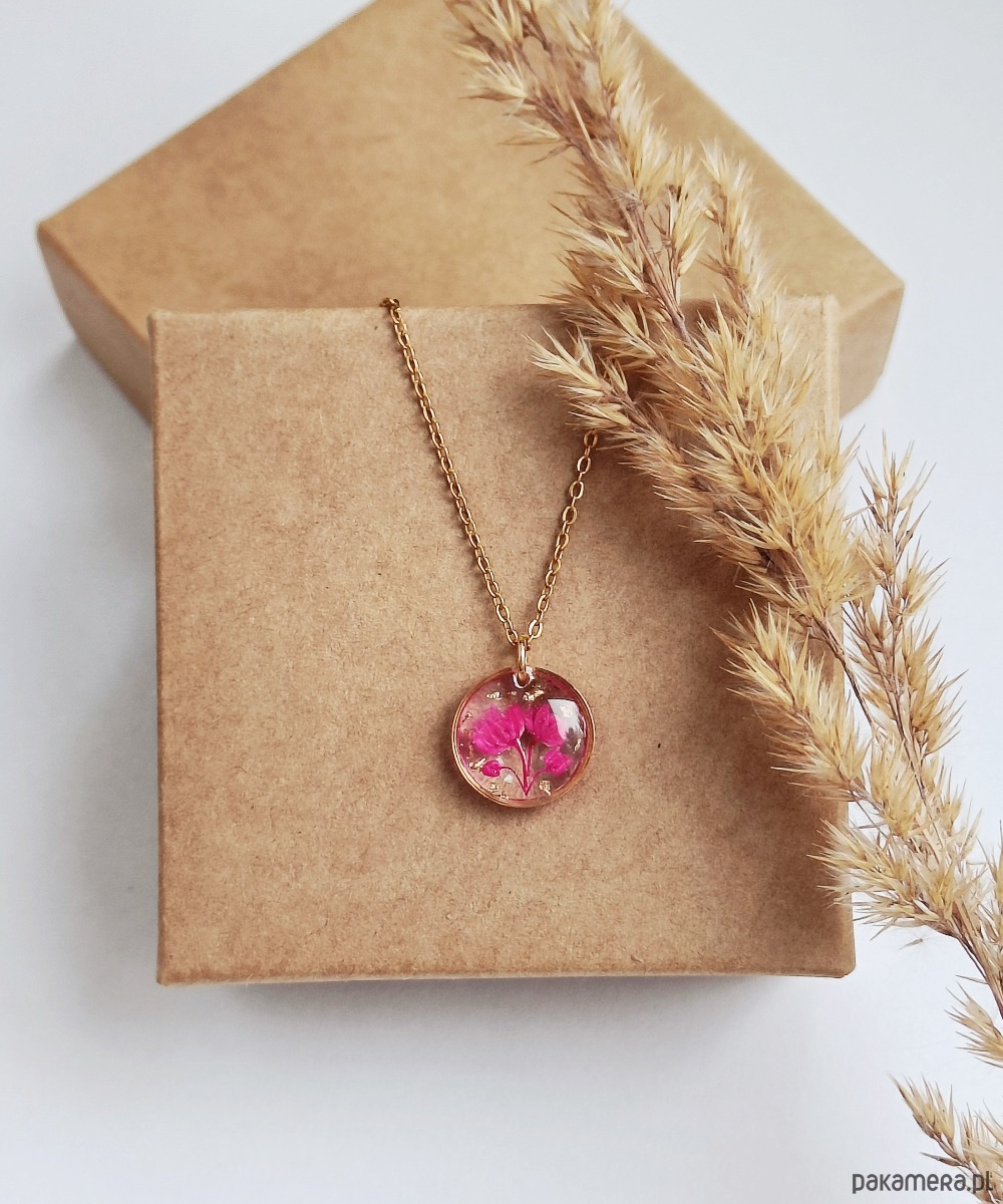Uroczy wisiorek z zatopionymi kwiatami i płatkami złota. Wykonany z wysokiej klasy żywicy, która nie zmienia koloru pod wpływem promieniowania uv oraz wysokiej jakości stali chirurgicznej.