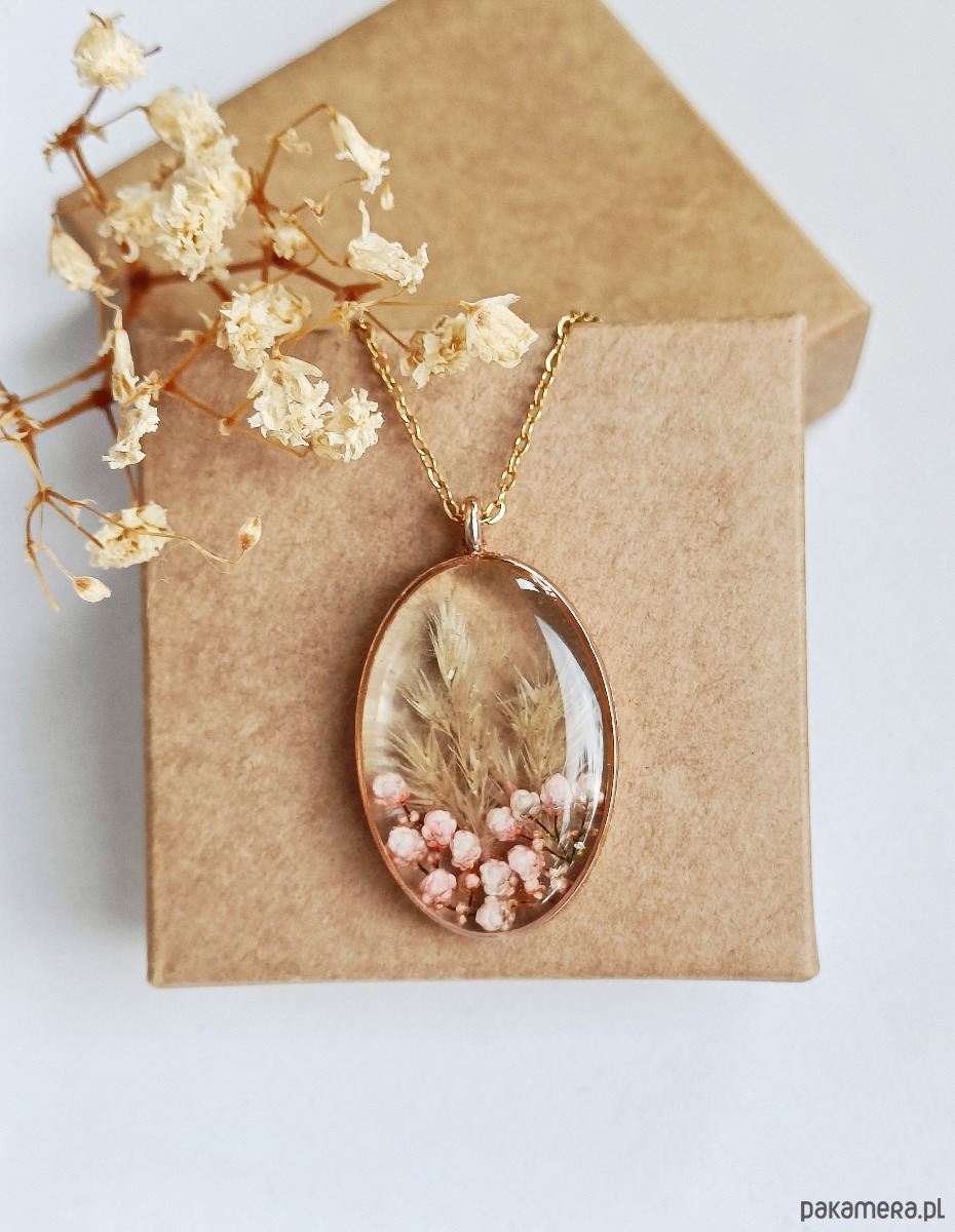 Uroczy wisiorek z zatopionymi suszonymi kwiatami oraz kłosem trawy. Wykonany z wysokiej klasy żywicy, która nie zmienia koloru pod wpływem promieniowania uv oraz wysokiej jakości stali chirurgicznej.