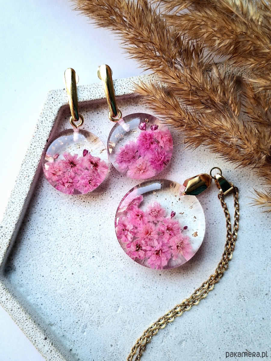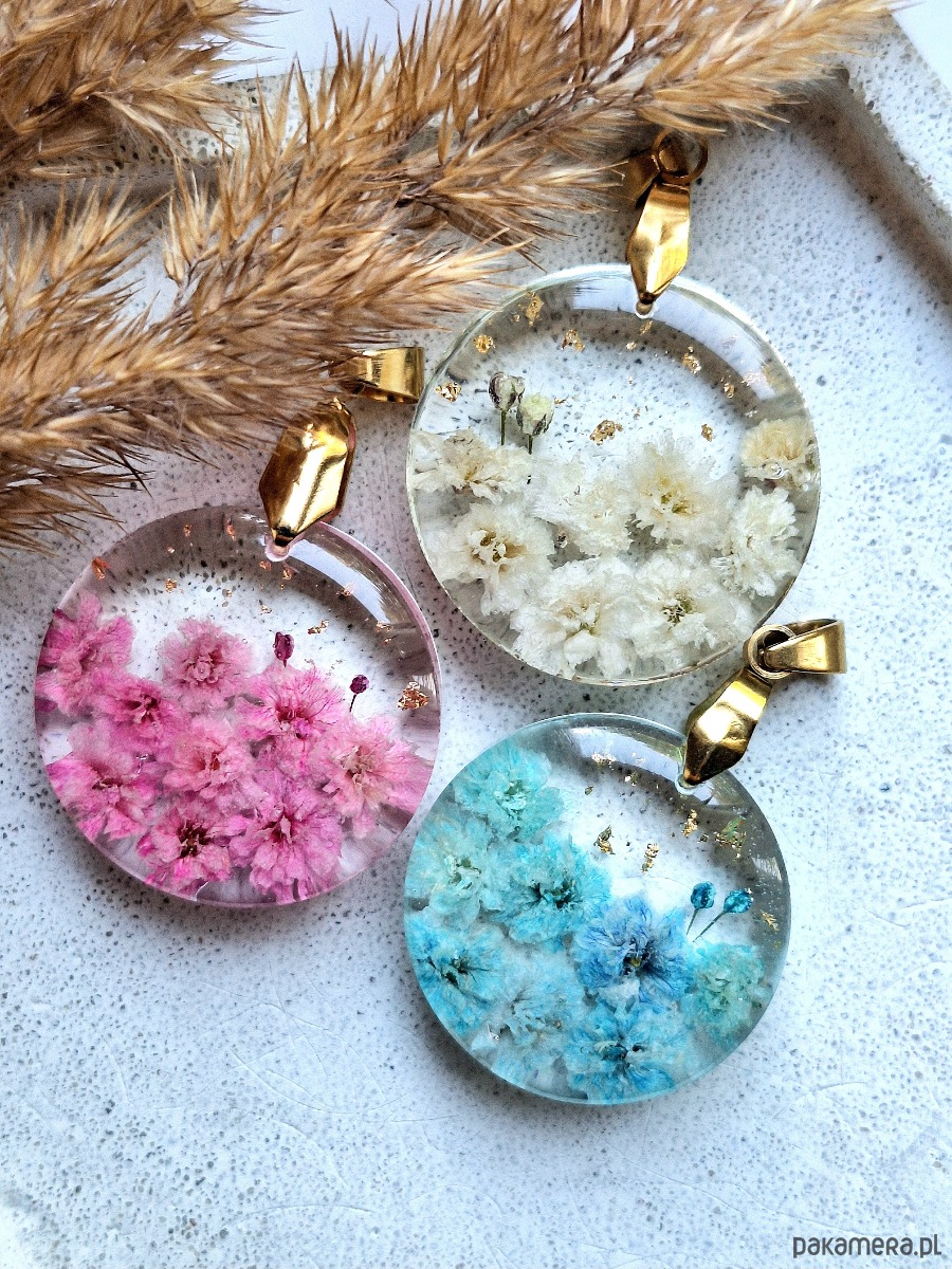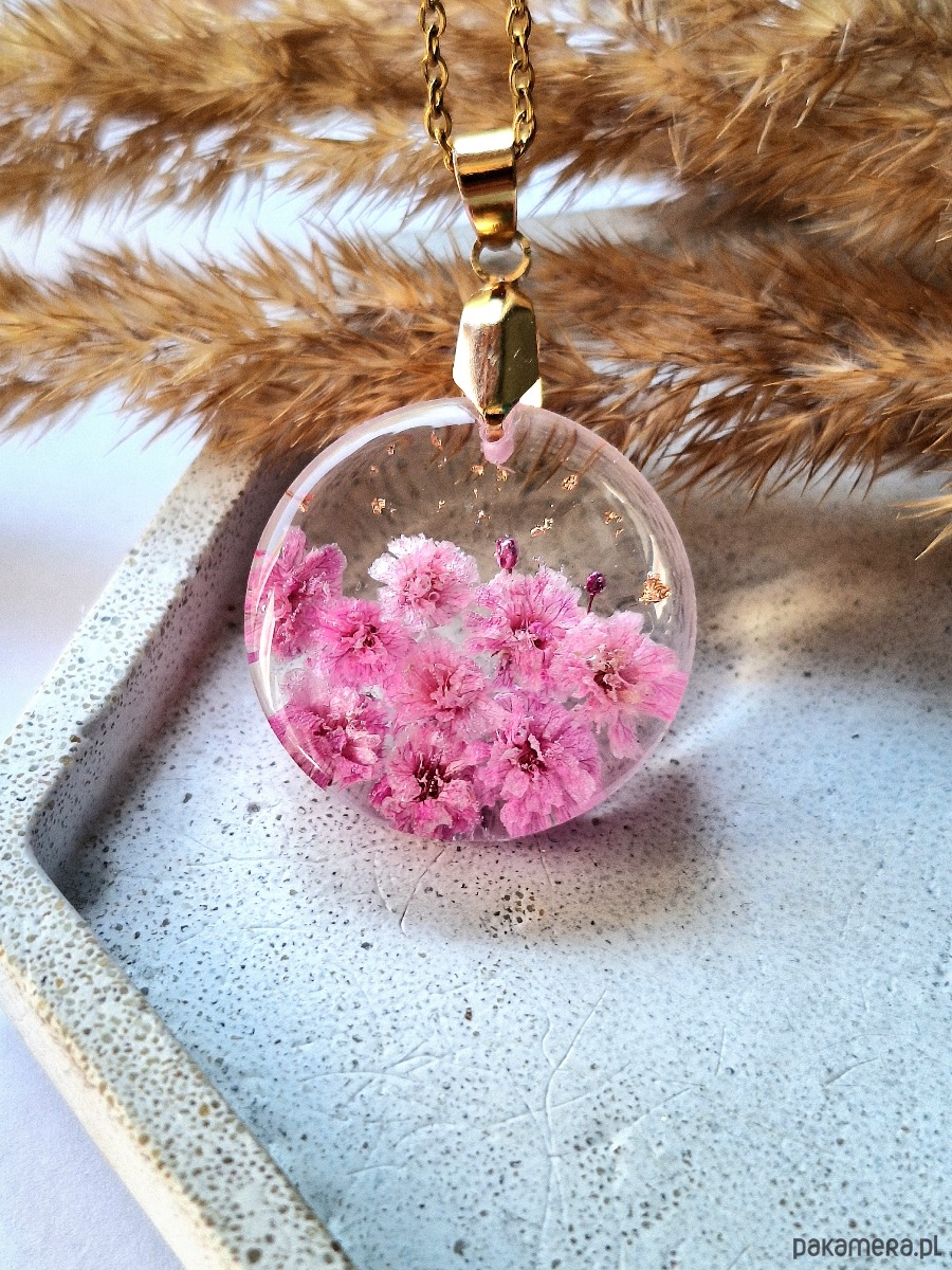 Wisiorek z żywicy z suszonymi kwiatami różowa gipsówka