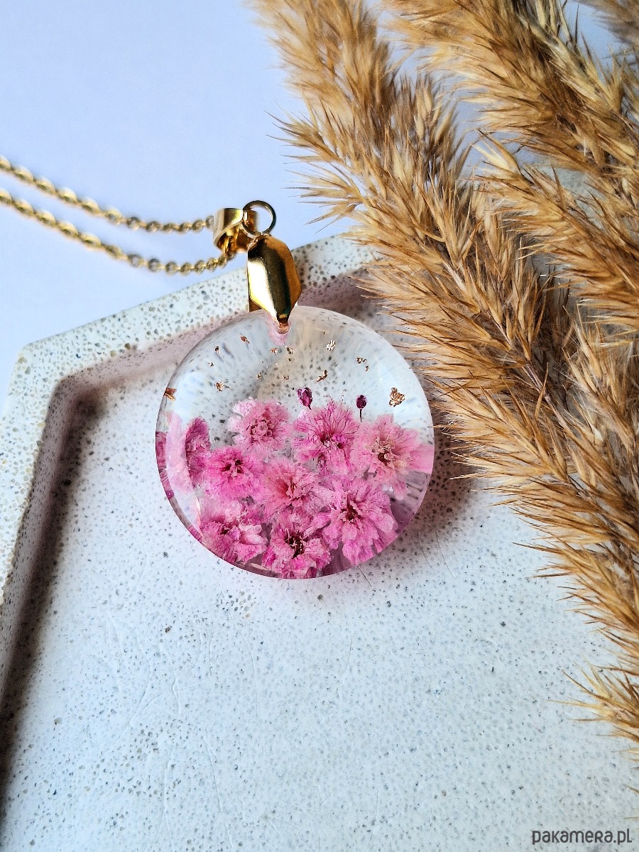 Wisiorek z żywicy z suszonymi kwiatami różowa gipsówka