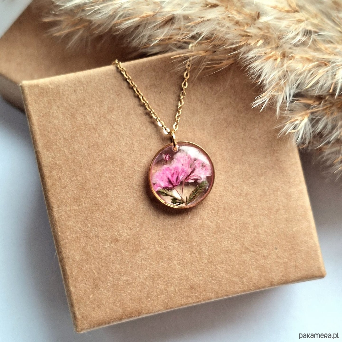Uroczy wisiorek z zatopionymi kwiatami różowej gipsówki. Wykonany z wysokiej klasy żywicy, która nie zmienia koloru pod wpływem promieniowania uv oraz wysokiej jakości stali chirurgicznej.