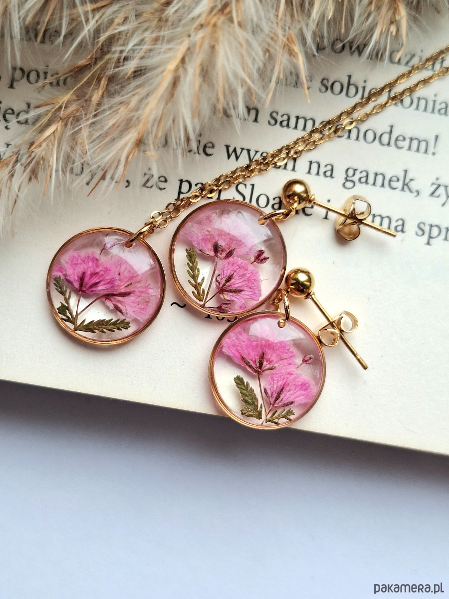 Wisiorek z żywicy z suszonymi kwiatami różowej gipsówki