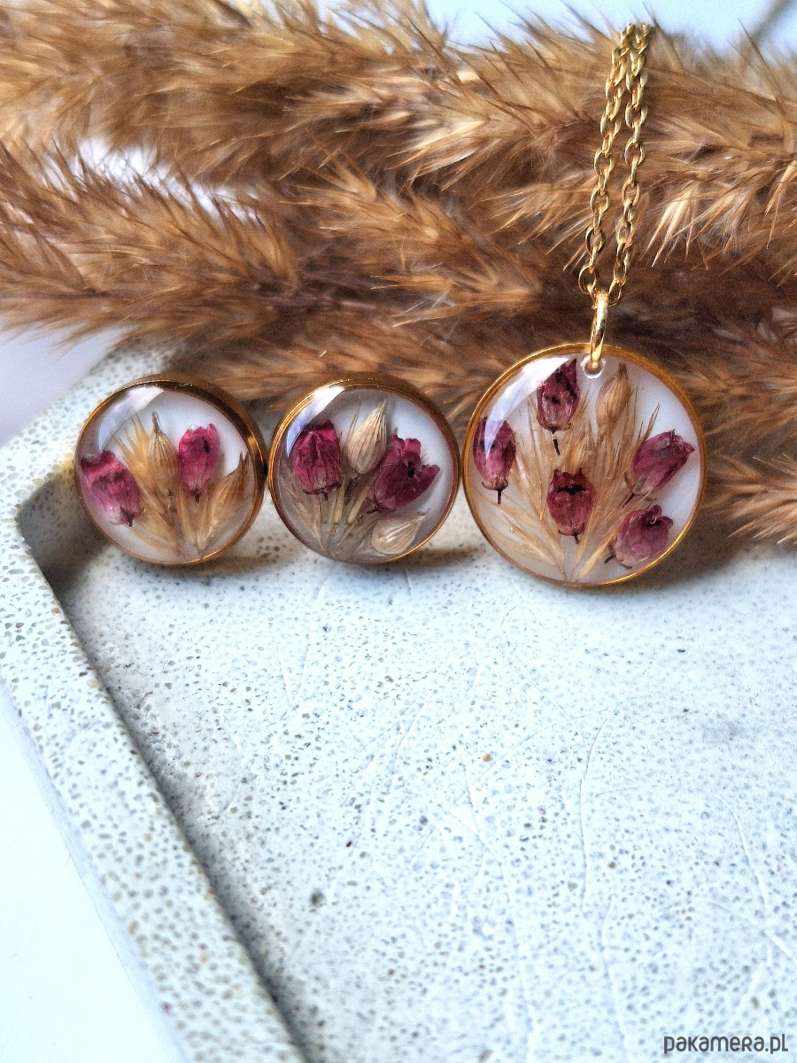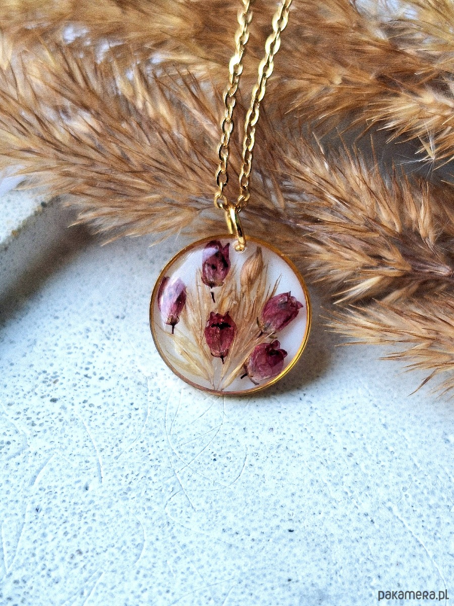 Uroczy wisiorek z zatopionymi kwiatami wrzośca i trawą na białym tle. Wykonany z wysokiej klasy żywicy, która nie zmienia koloru pod wpływem promieniowania uv oraz wysokiej jakości stali chirurgicznej.
