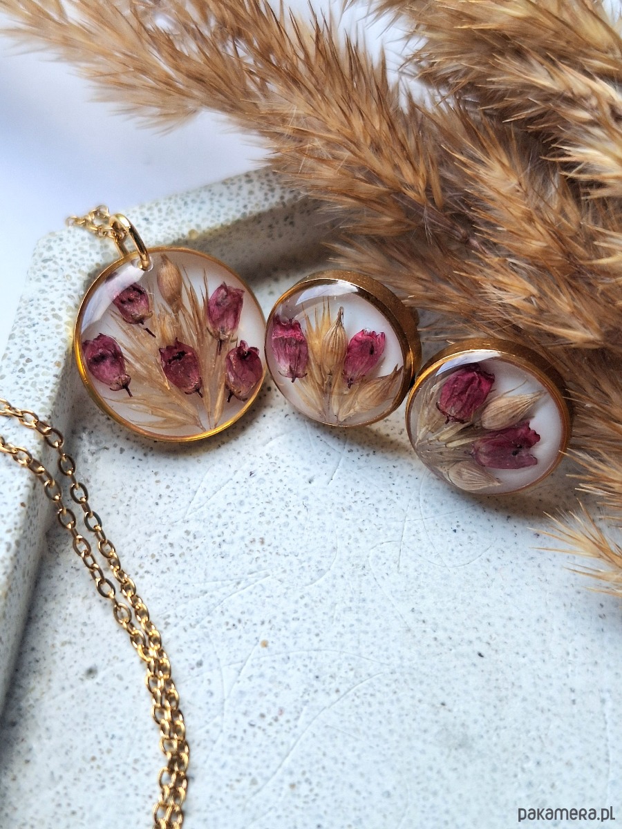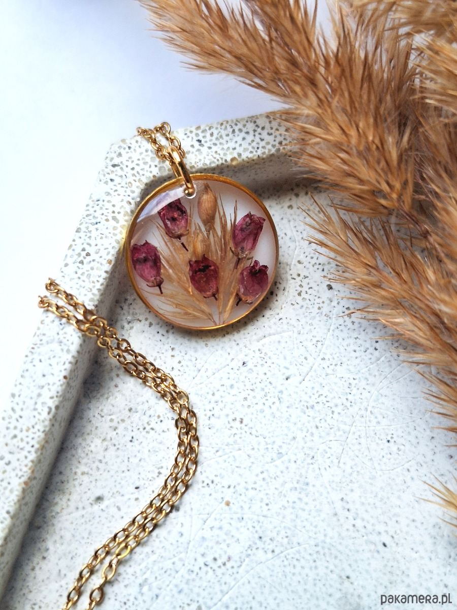 Uroczy wisiorek z zatopionymi kwiatami wrzośca i trawą na białym tle. Wykonany z wysokiej klasy żywicy, która nie zmienia koloru pod wpływem promieniowania uv oraz wysokiej jakości stali chirurgicznej.
