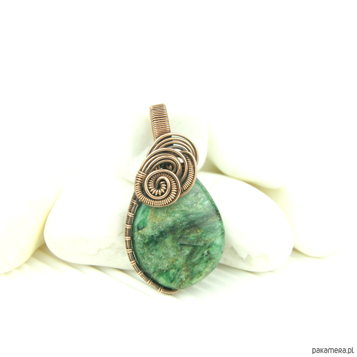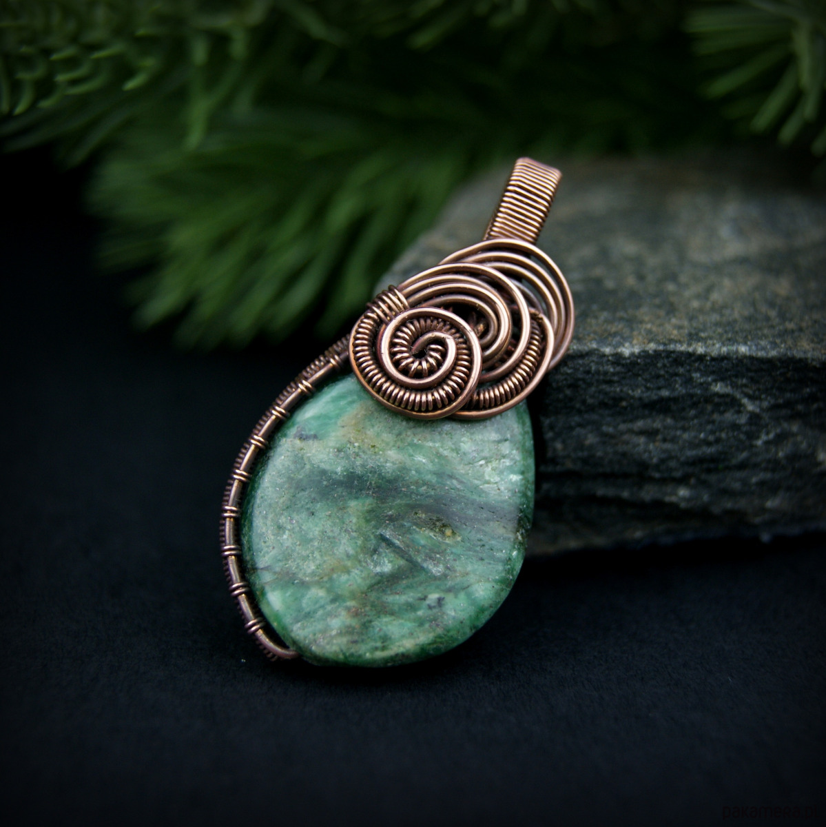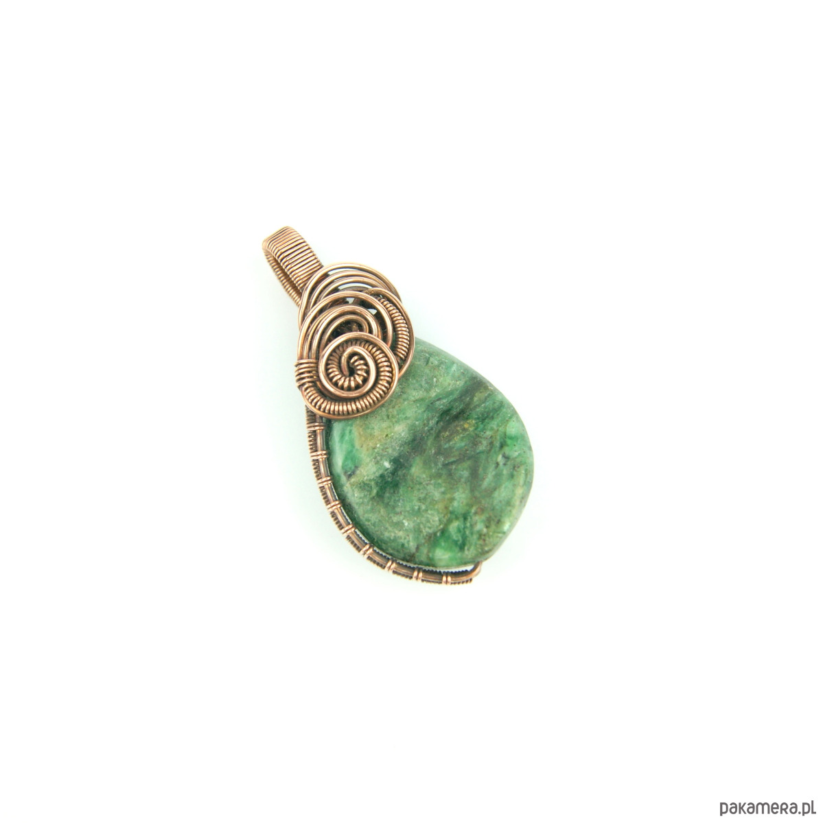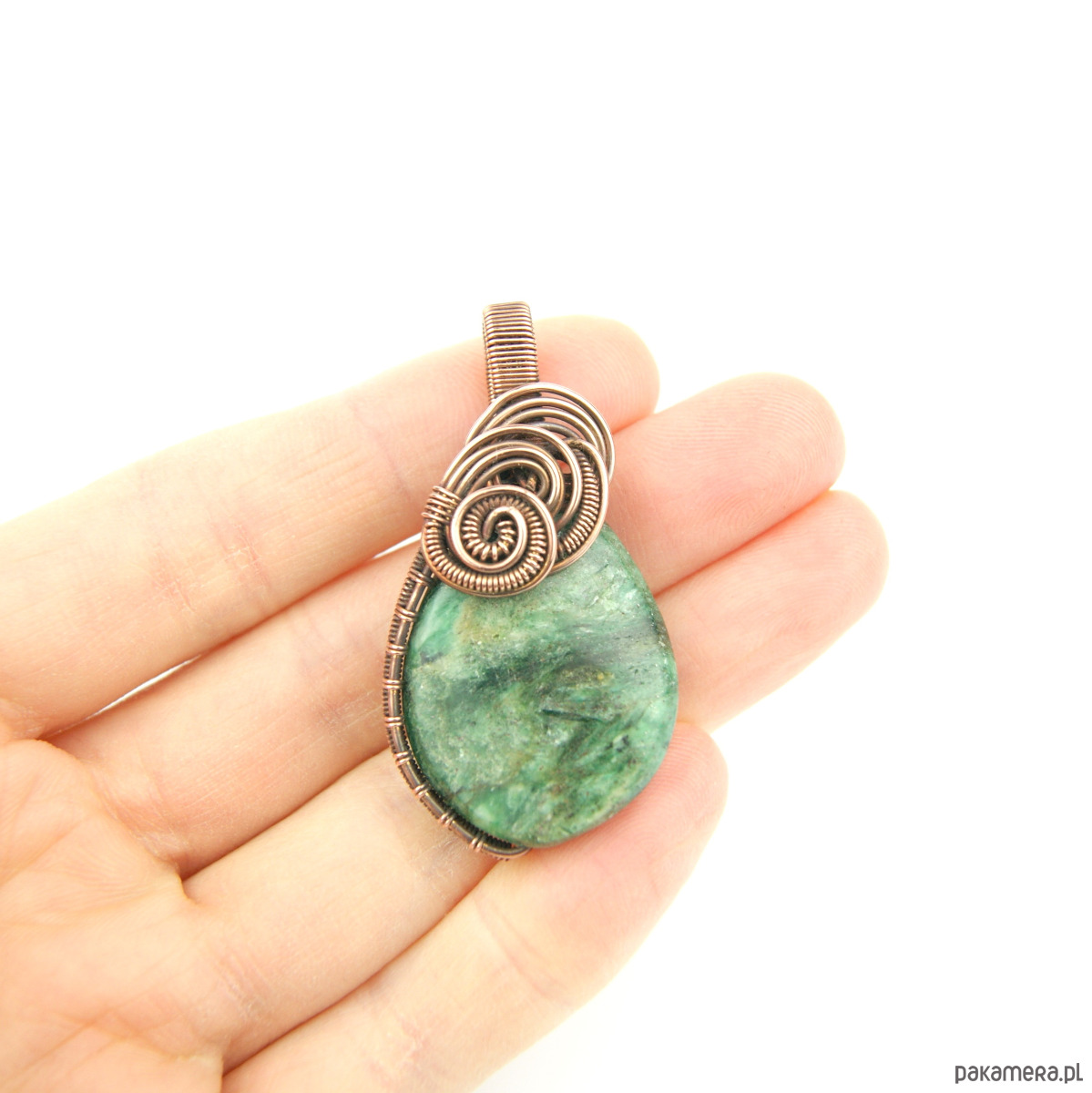 Wisiorek powstał z naturalnego szmaragdu, który został misternie opleciony miedzią.