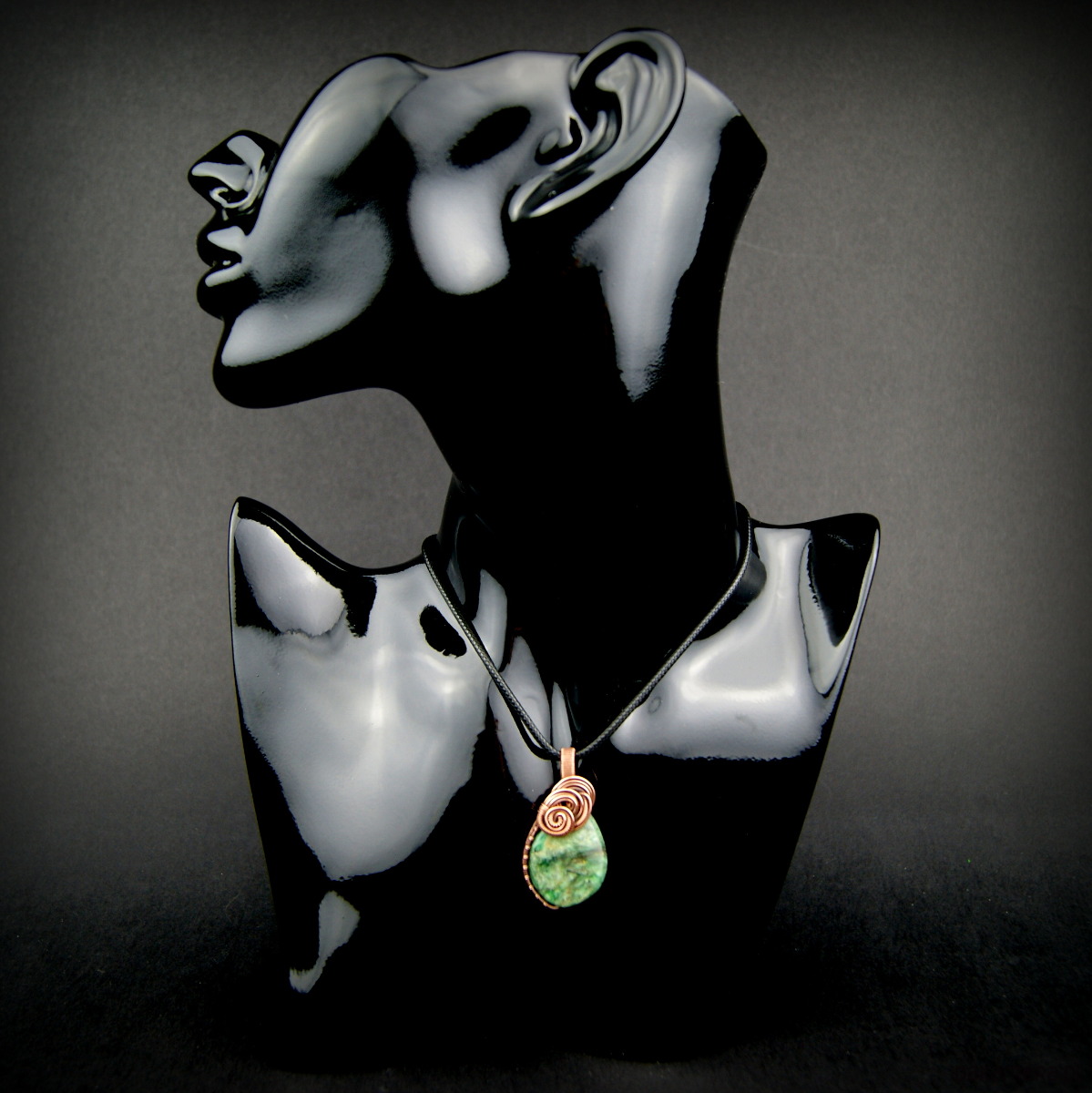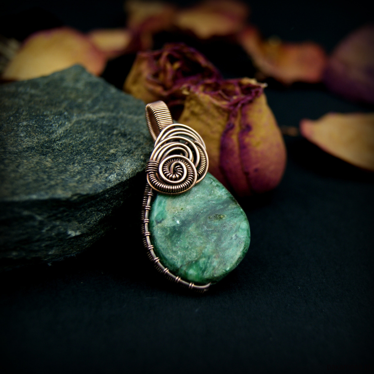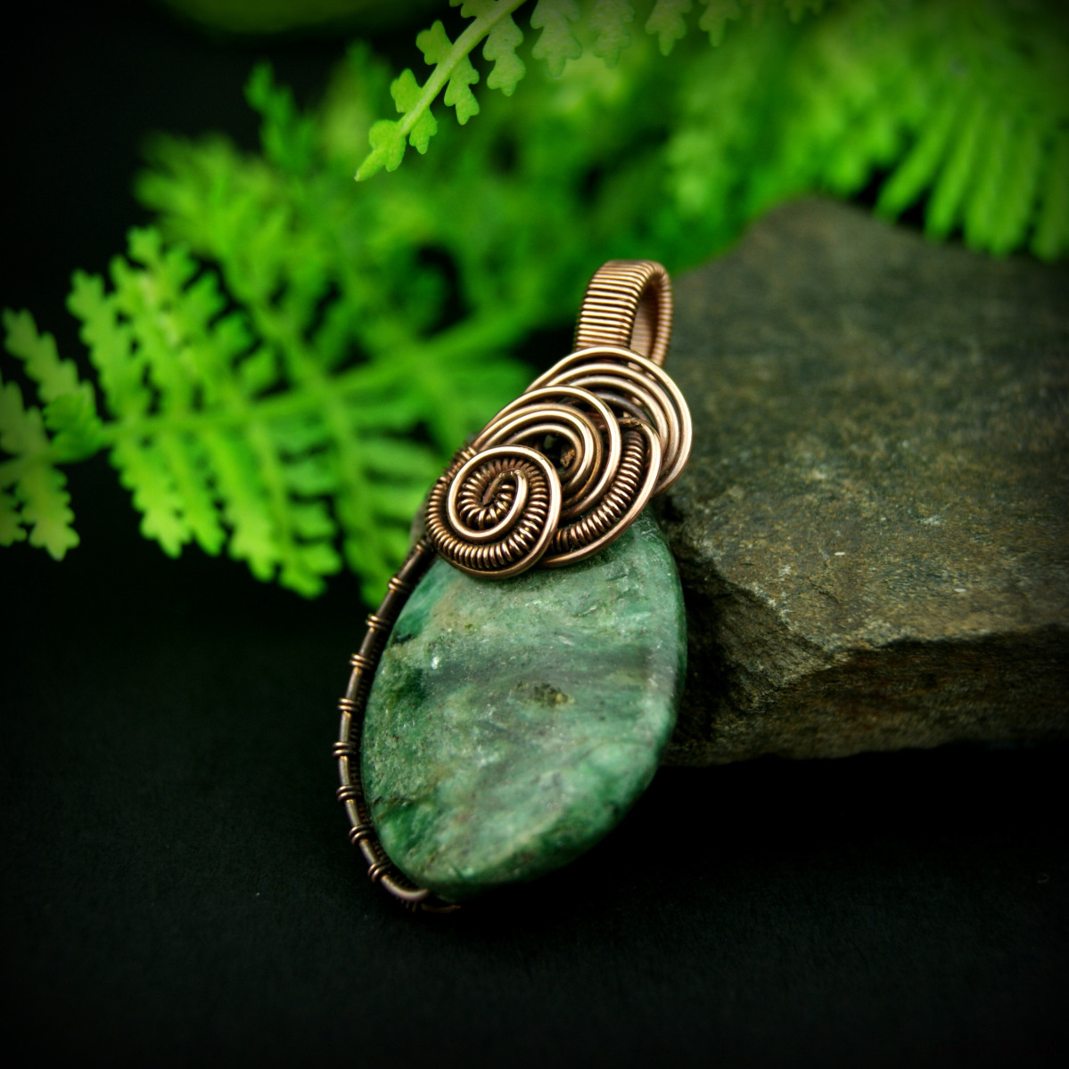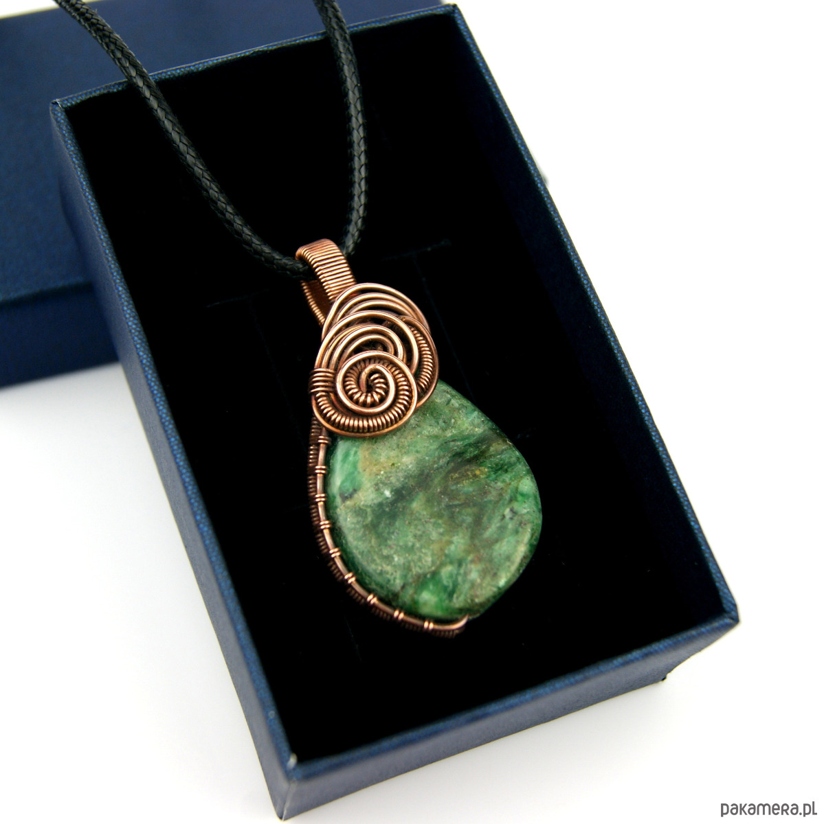 Wisiorek powstał z naturalnego szmaragdu, który został misternie opleciony miedzią.