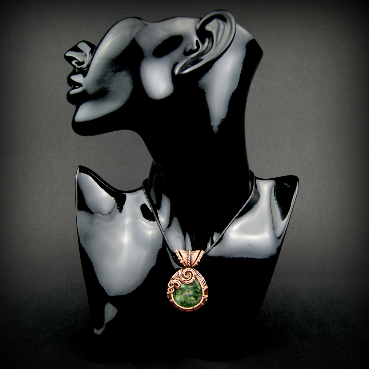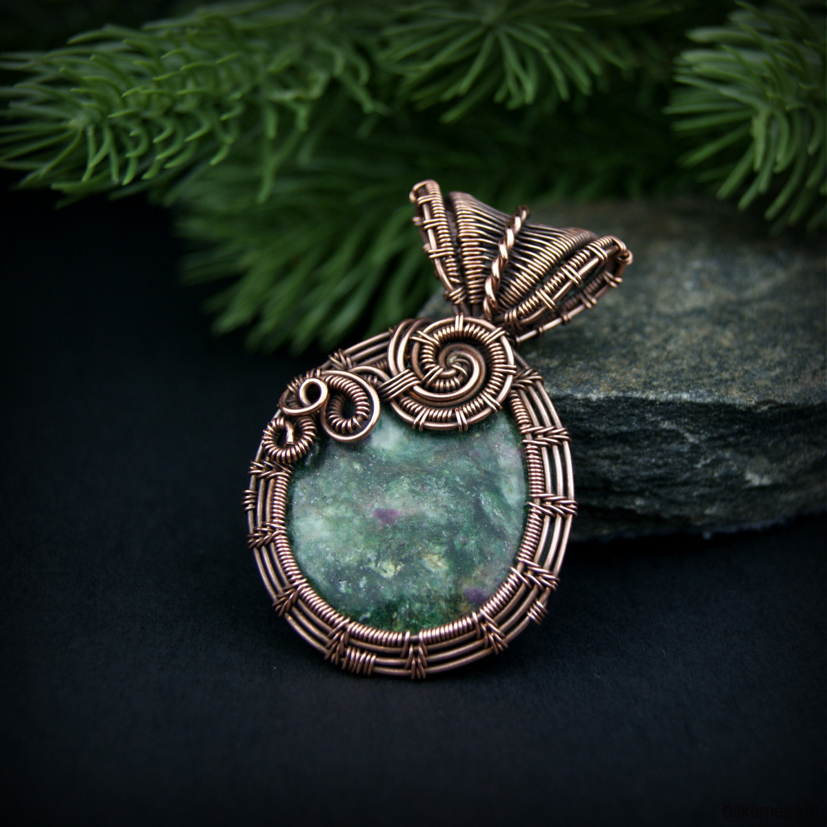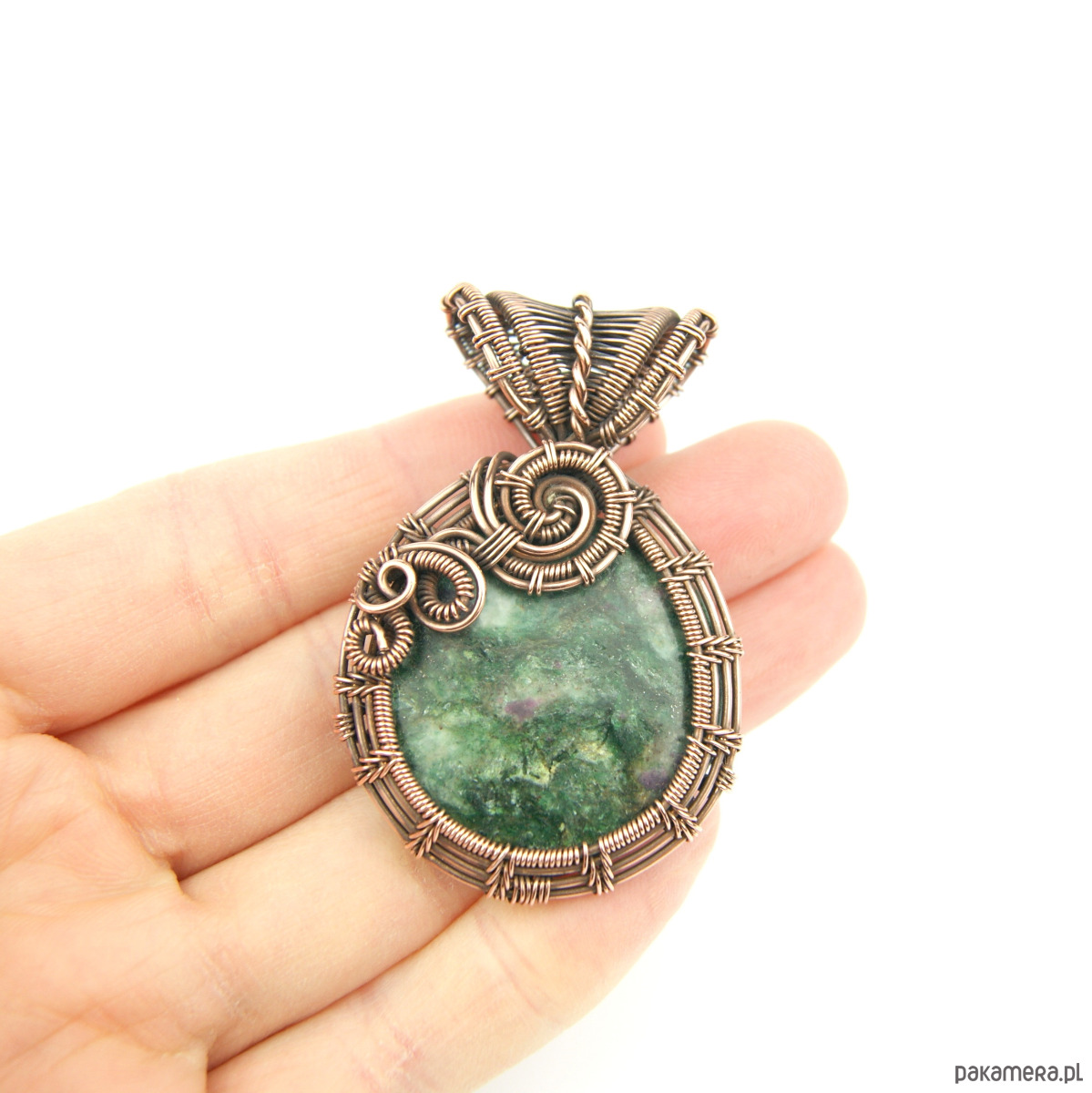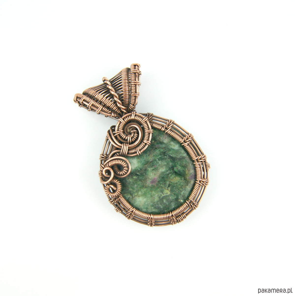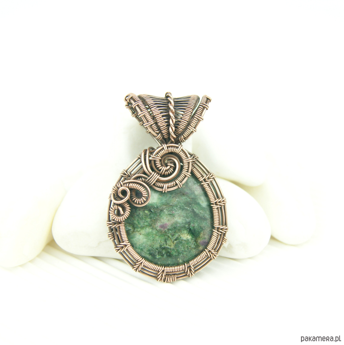 Wisiorek powstał z naturalnego dużego szmaragdu. Całość misternie opleciona miedzią.
