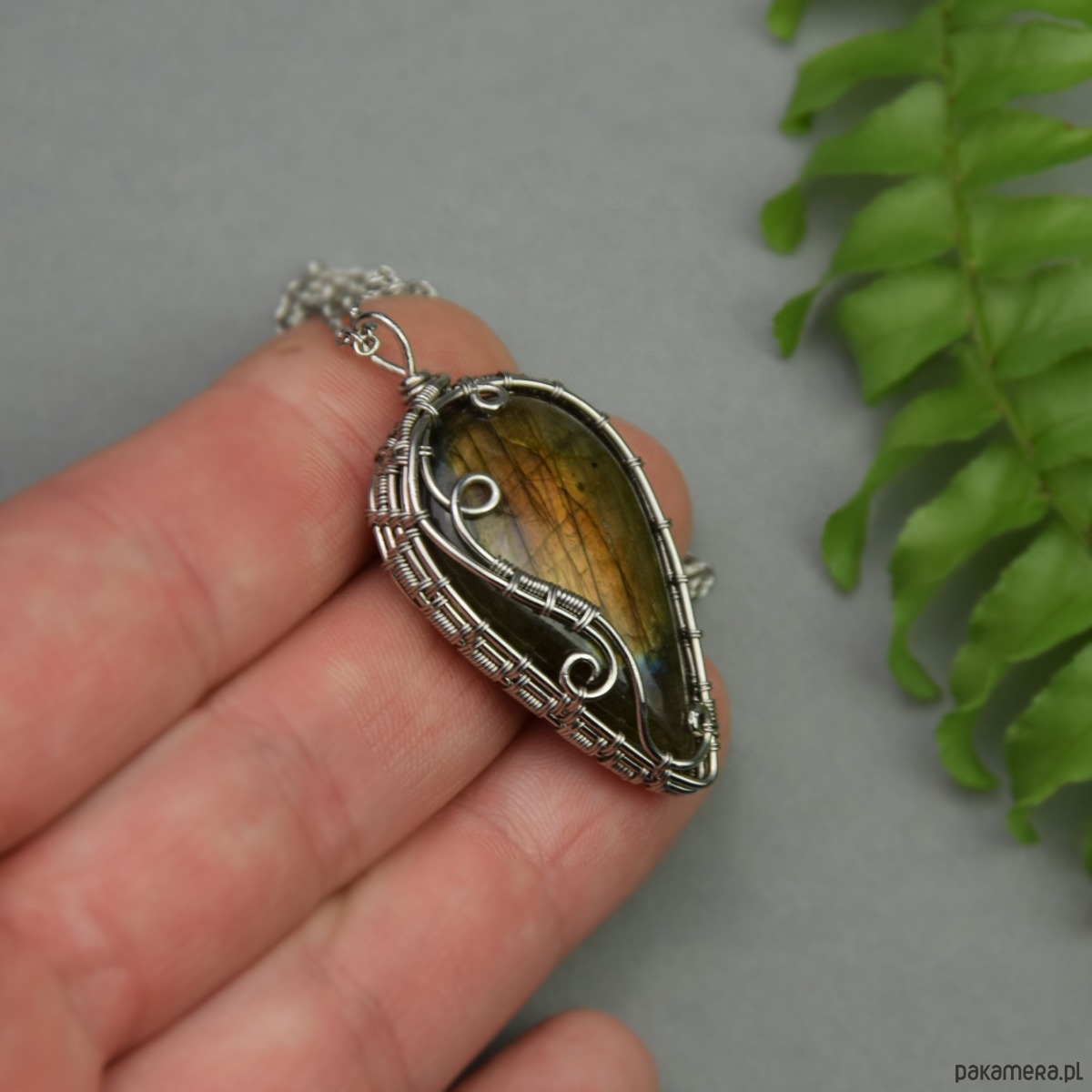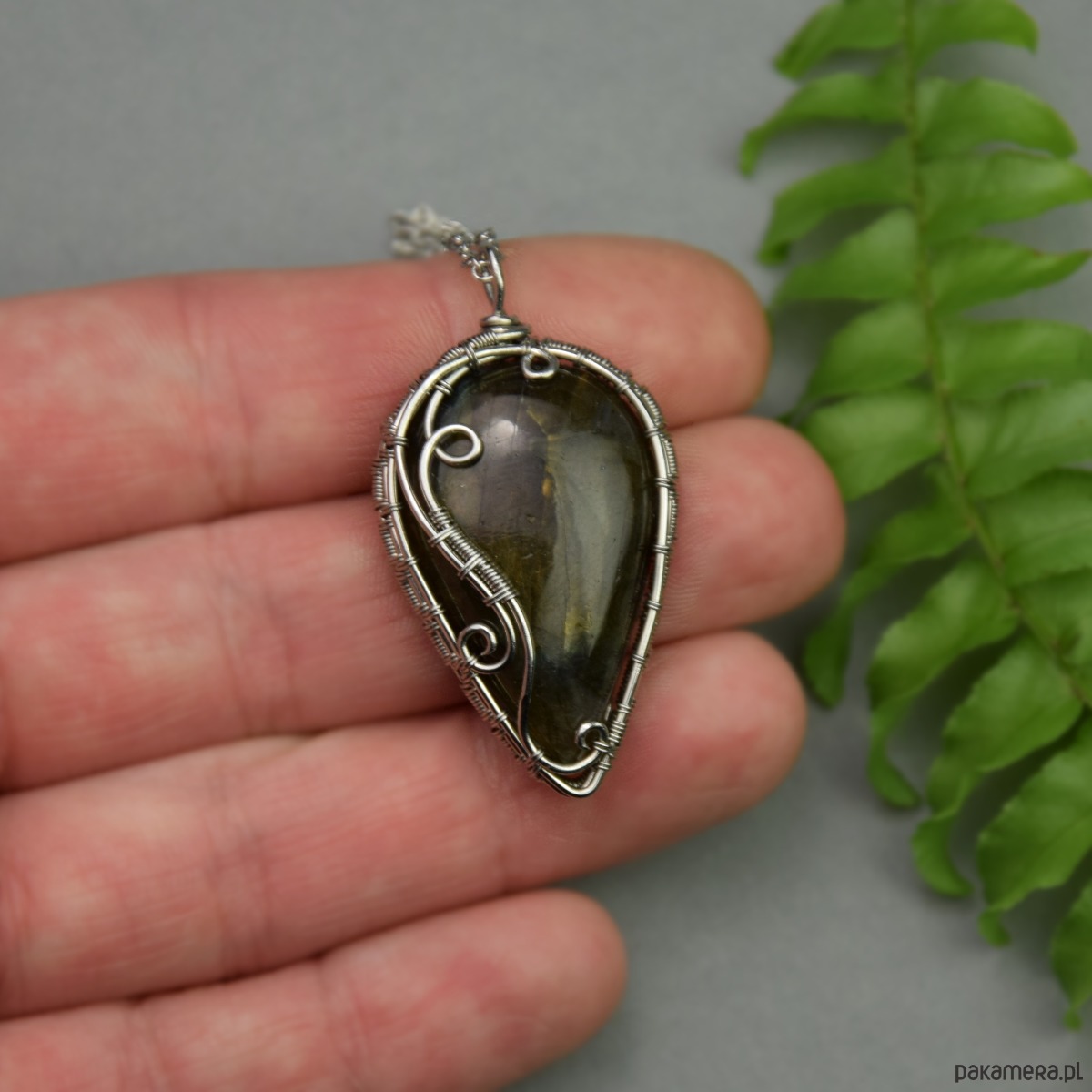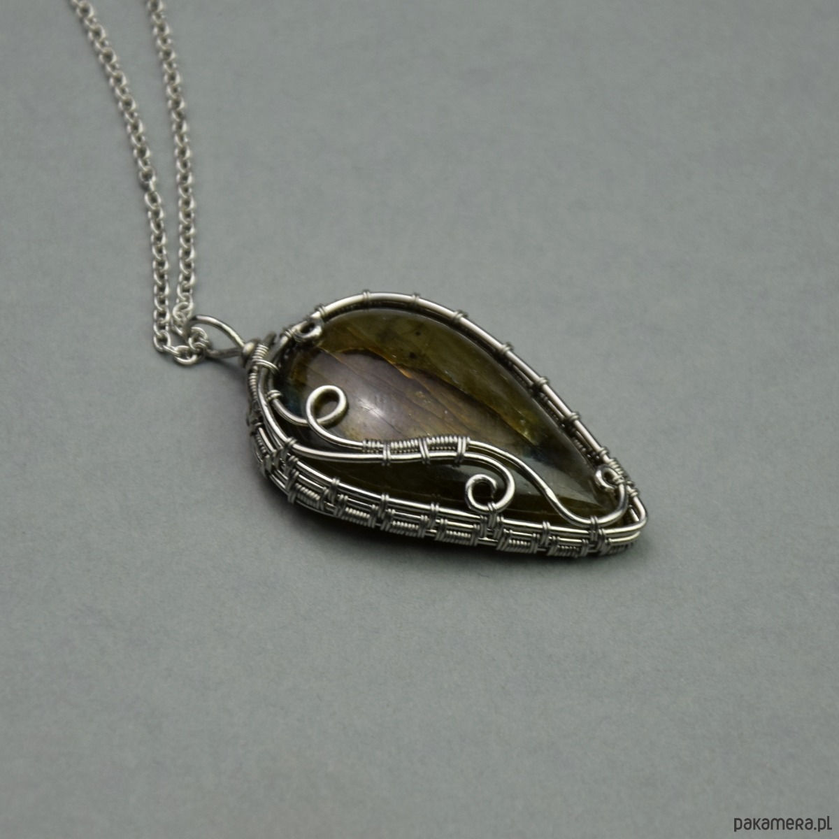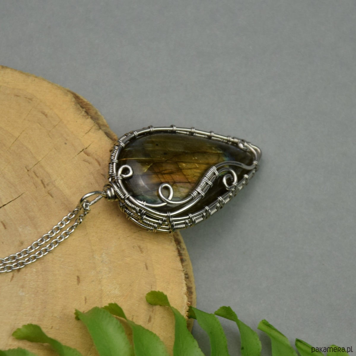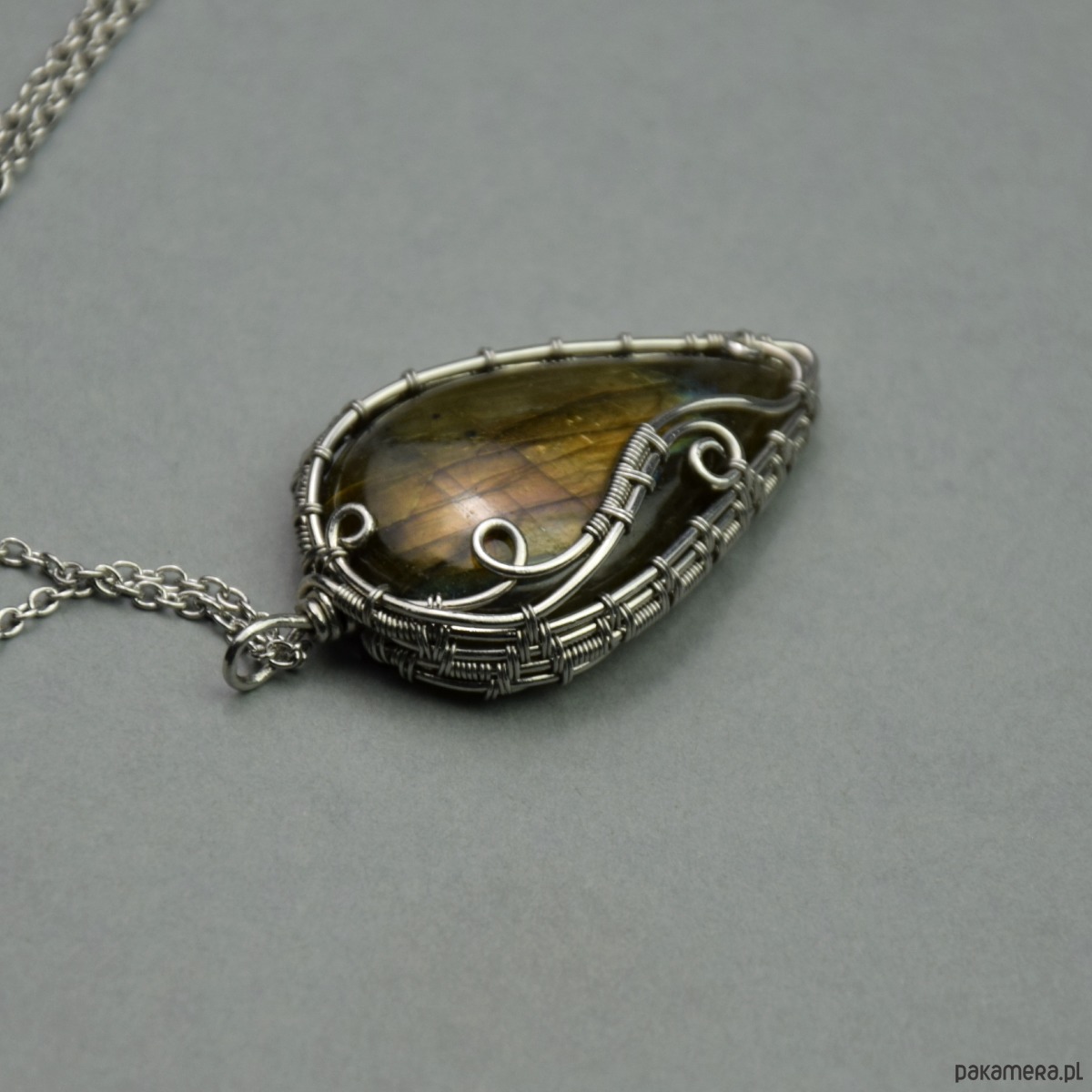 Wisiorek z labradorytem zrobiony ręcznie ze stali chirurgicznej techniką wire wrapping. Labradoryt połyskuje na złoto pod bardzo dużym kątem stąd jego niższa cena.
