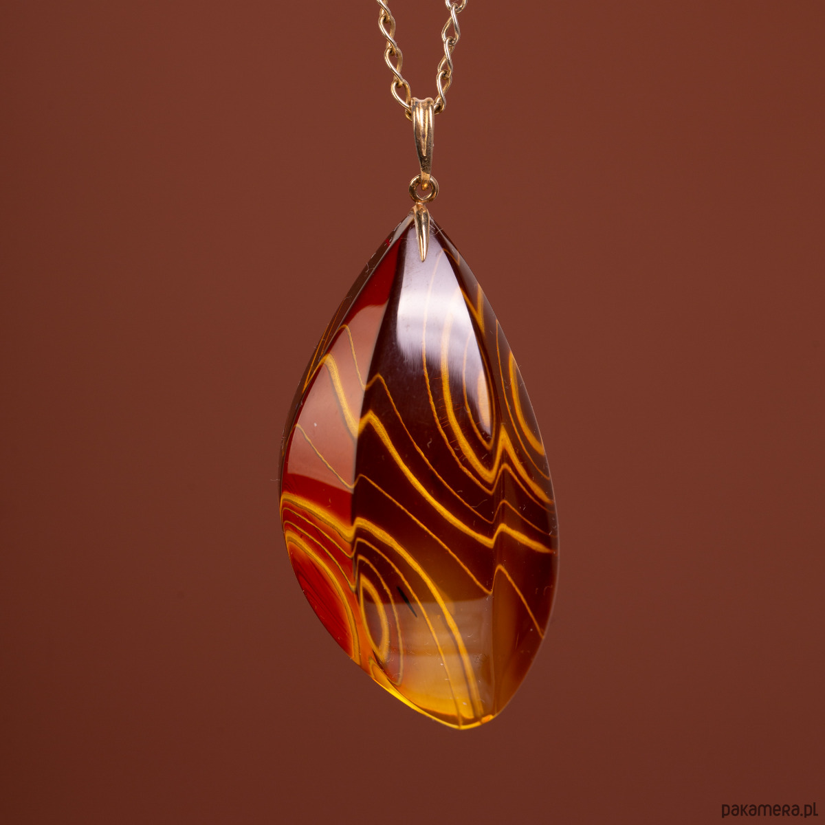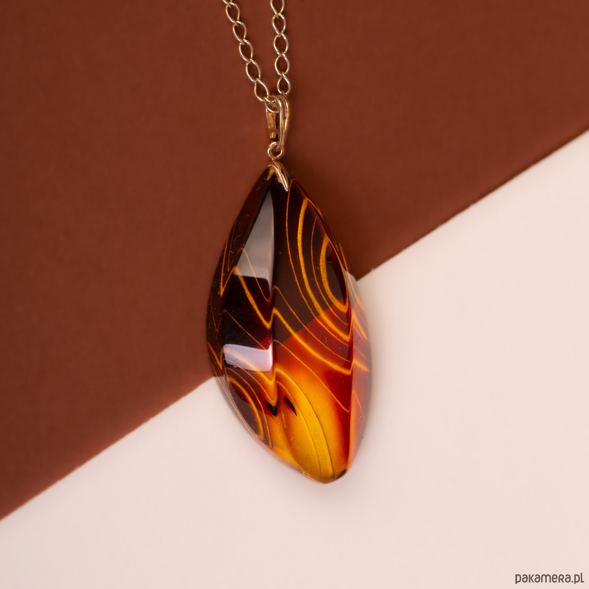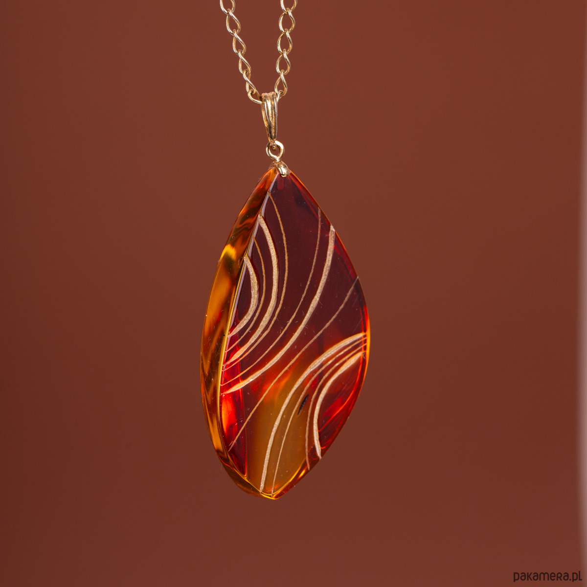 Luksusowy wisiorek wykonany z 14-karatowego złota (próba 585), w którym osadzono unikatowy, rzeźbiony bursztyn bałtycki. Bursztyn został poddany procesowi klarowania, co pozwoliło uzyskać niesamowitą głębię i przejrzystość, a następnie został misternie wyrzeźbiony. Powierzchnię bursztynu zdobią dynamiczne, faliste linie, które w połączeniu z intensywną, miodowo-koniakową barwą tworzą efekt przypominający zastygły płomień.