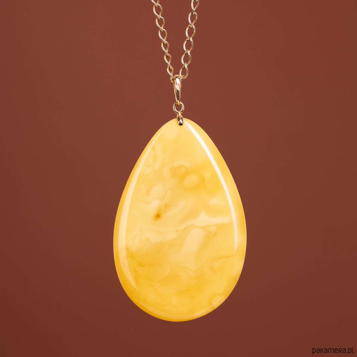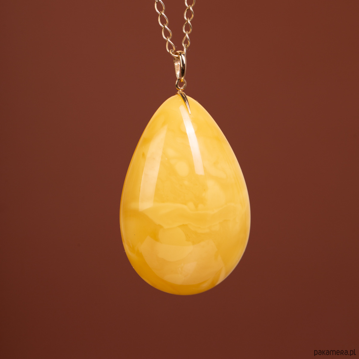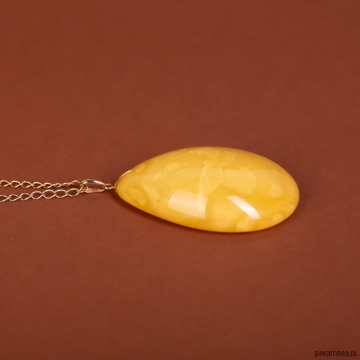 Ekskluzywny wisiorek z naturalnym bursztynem bałtyckim o rzadko spotykanym, mleczno-żółtym odcieniu. Bursztyn o idealnie gładkiej, wypolerowanej powierzchni ma formę dużej, regularnej kropli, która zachwyca naturalnymi, chmurkowymi przejściami barw wewnątrz bryły. Szlachetność bursztynu podkreśla minimalistyczna zawieszka wykonana z 14-karatowego złota (próba 585), co czyni ten projekt ponadczasową inwestycją w elegancję.