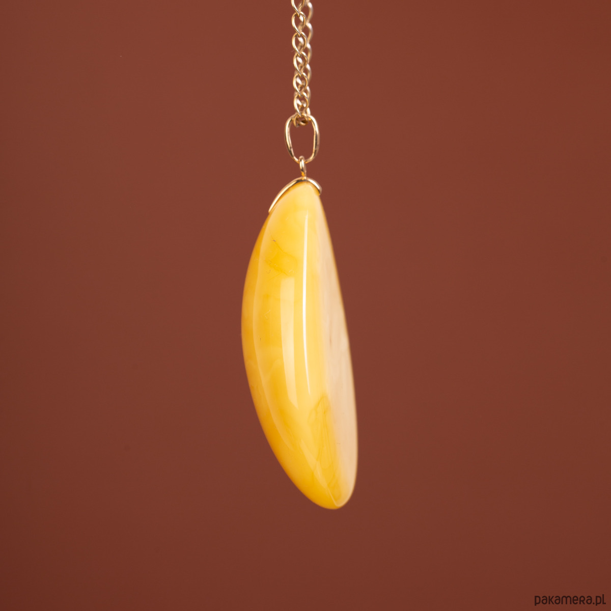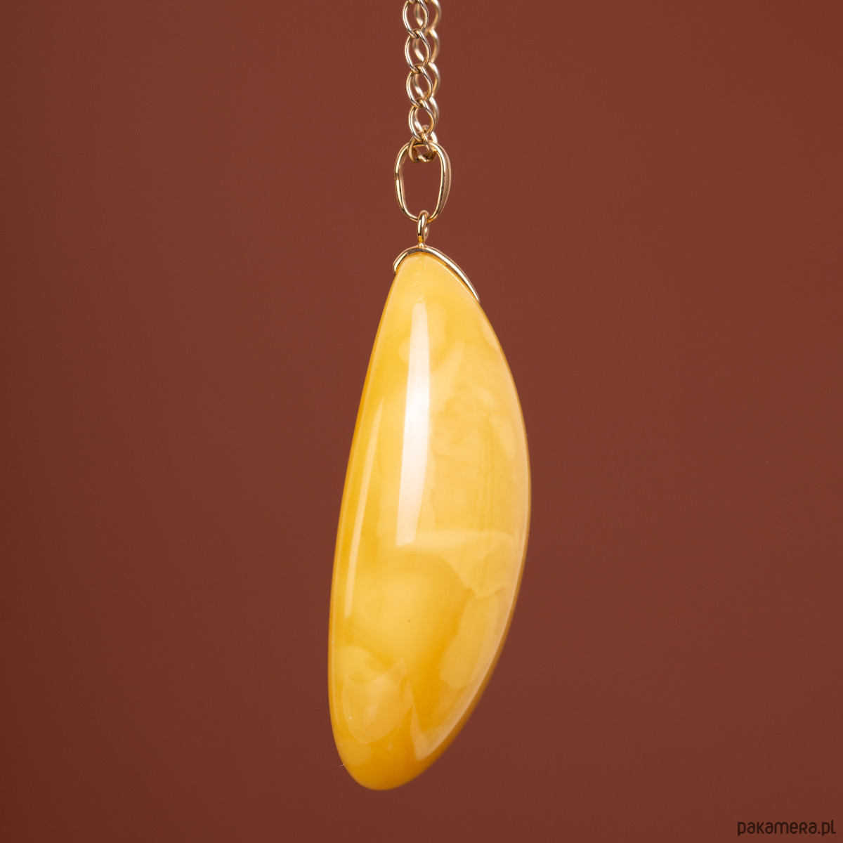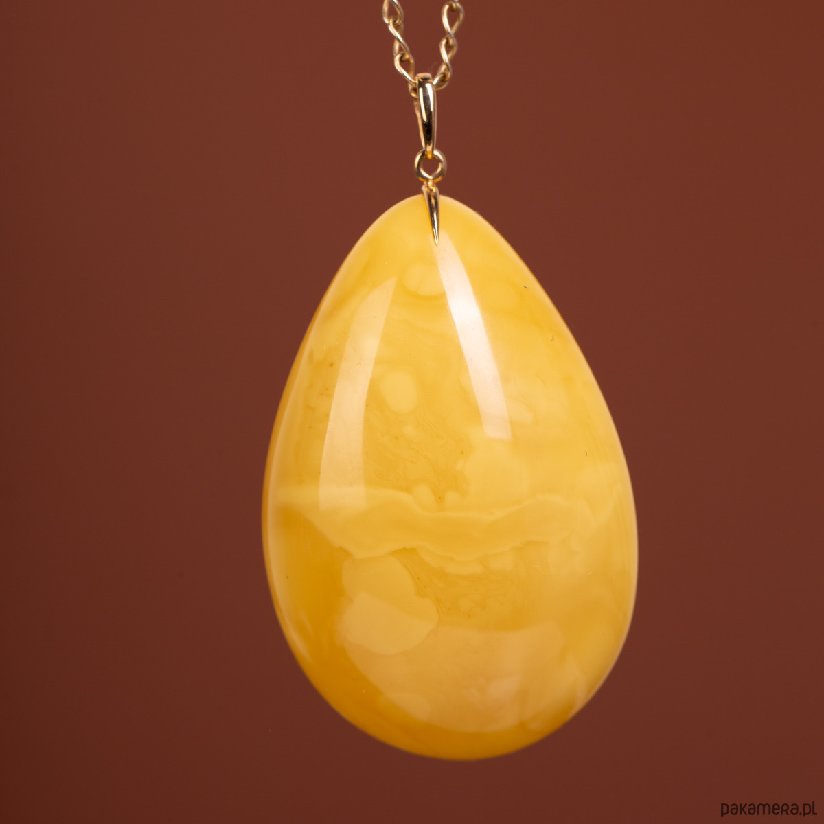 Ekskluzywny wisiorek z naturalnym bursztynem bałtyckim o rzadko spotykanym, mleczno-żółtym odcieniu. Bursztyn o idealnie gładkiej, wypolerowanej powierzchni ma formę dużej, regularnej kropli, która zachwyca naturalnymi, chmurkowymi przejściami barw wewnątrz bryły. Szlachetność bursztynu podkreśla minimalistyczna zawieszka wykonana z 14-karatowego złota (próba 585), co czyni ten projekt ponadczasową inwestycją w elegancję.