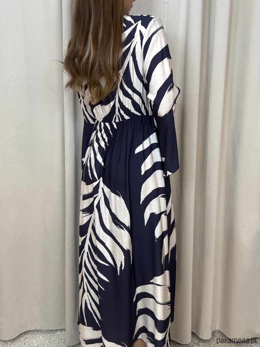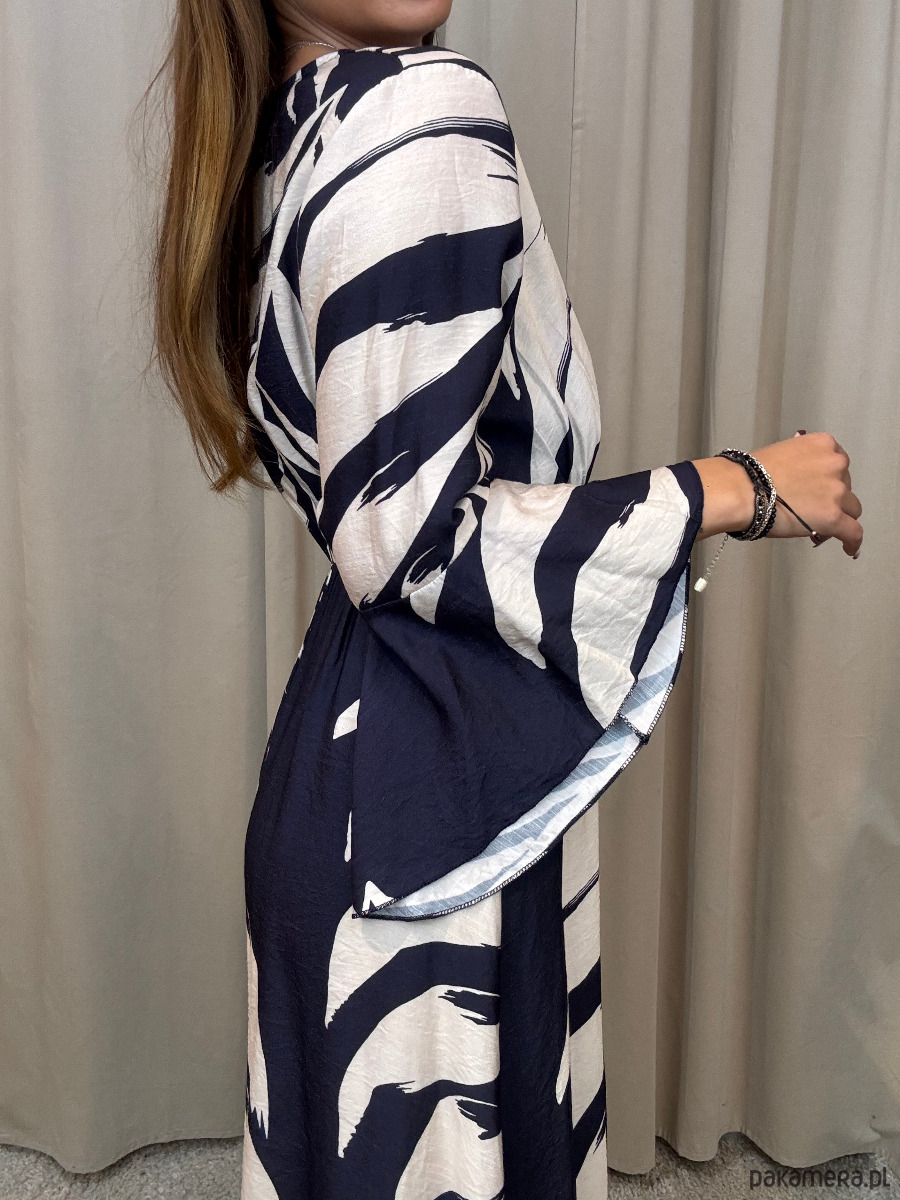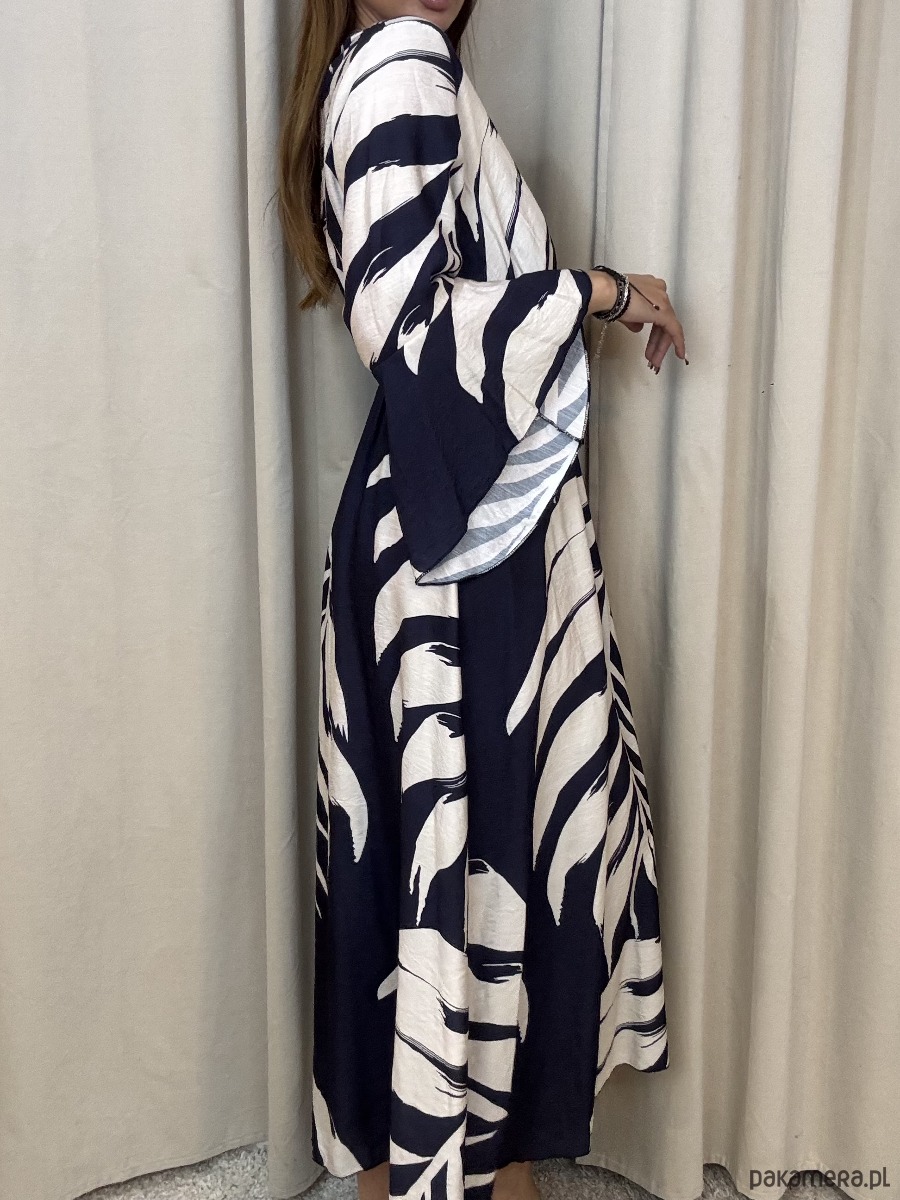 Wiskozowa sukienka o długości maxi w odcieniach granatu i śmietany.