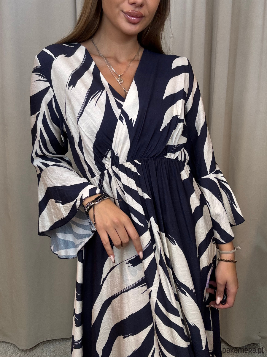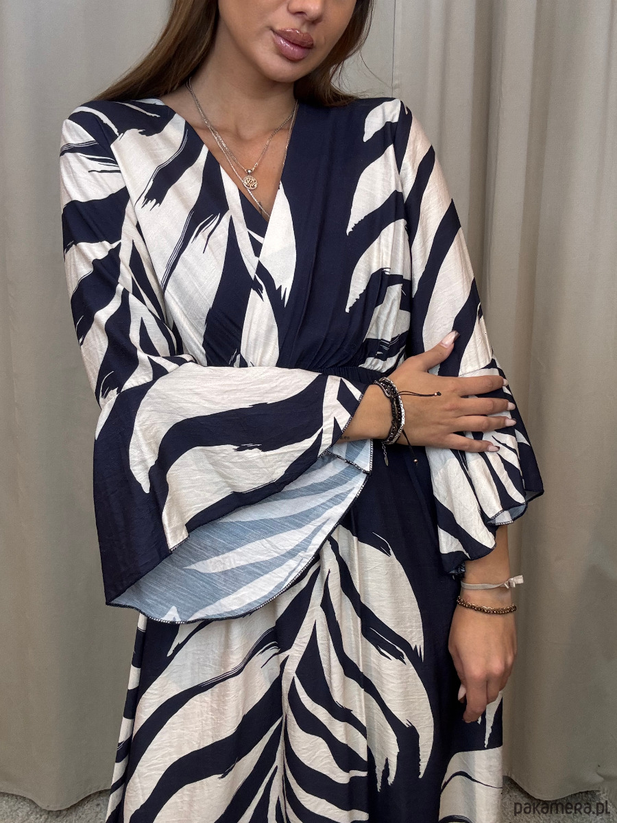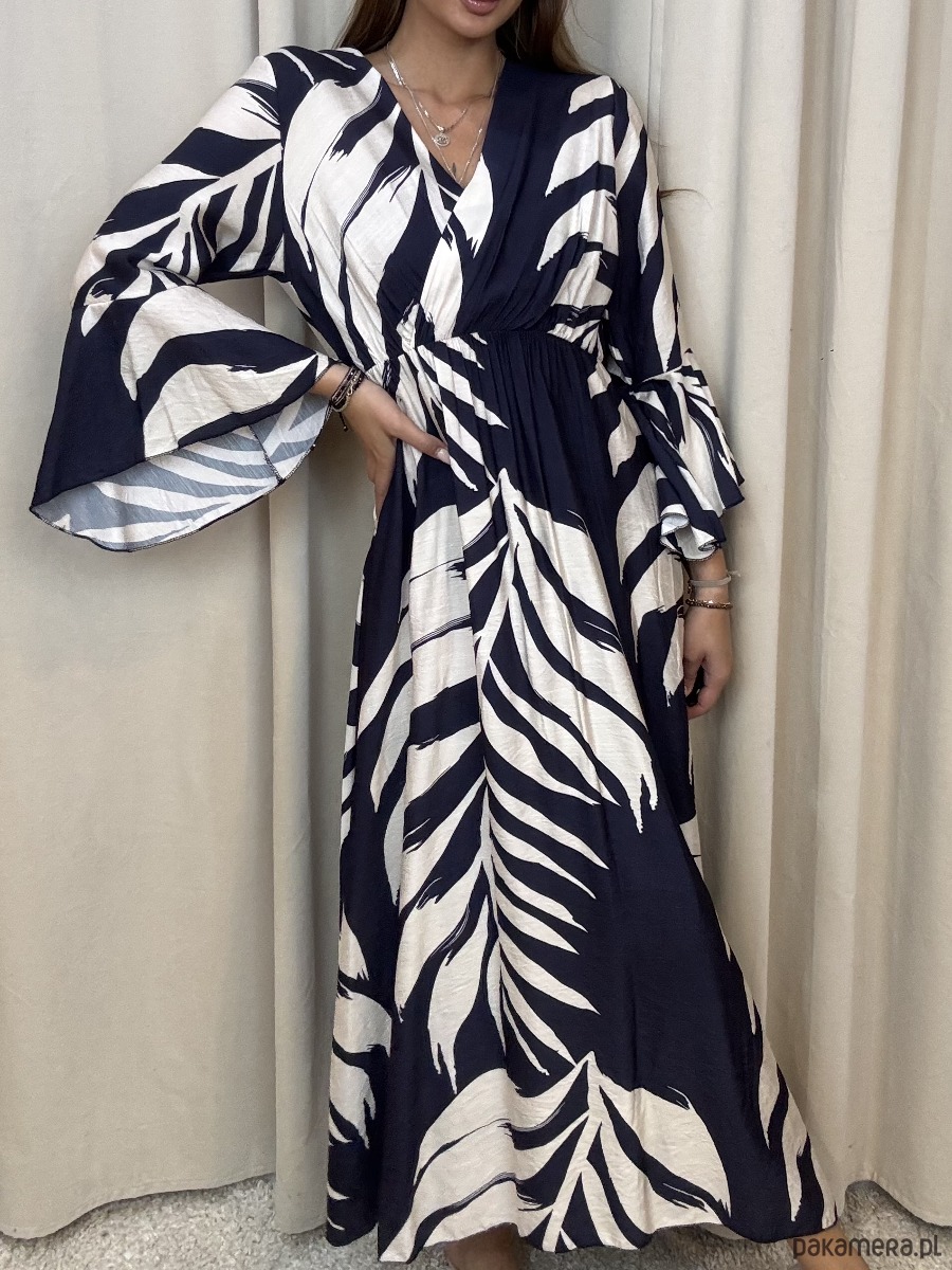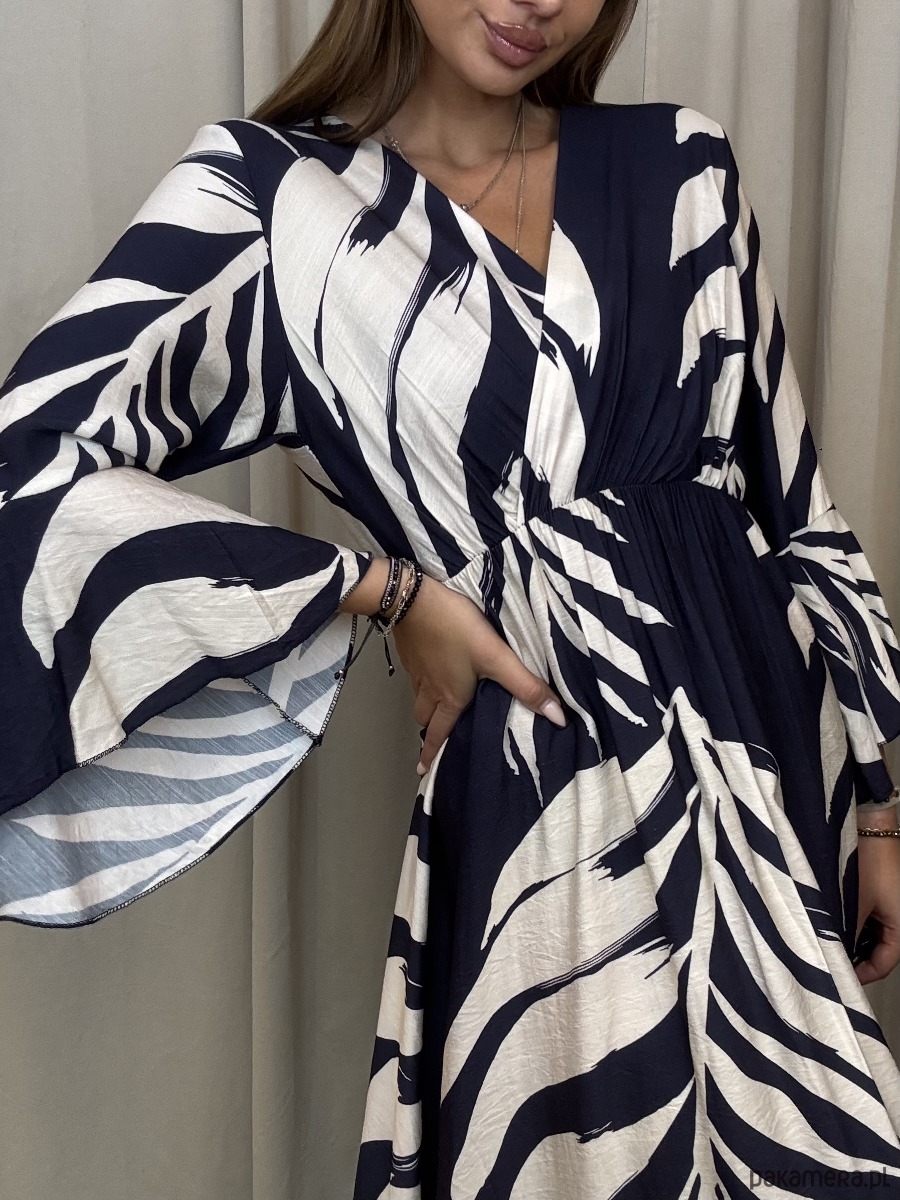 Wiskozowa sukienka o długości maxi w odcieniach granatu i śmietany.