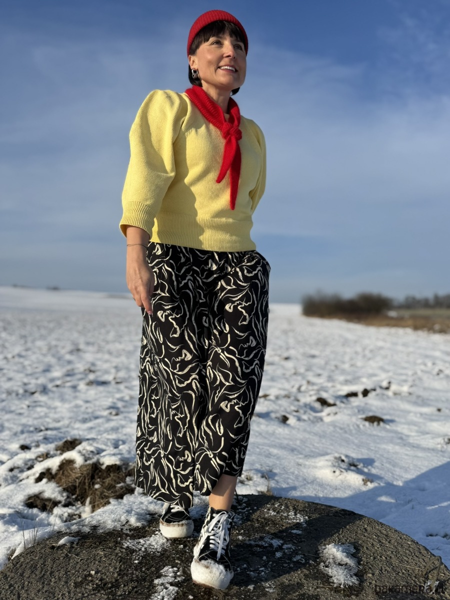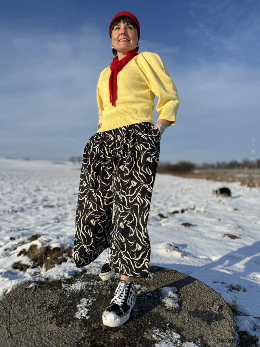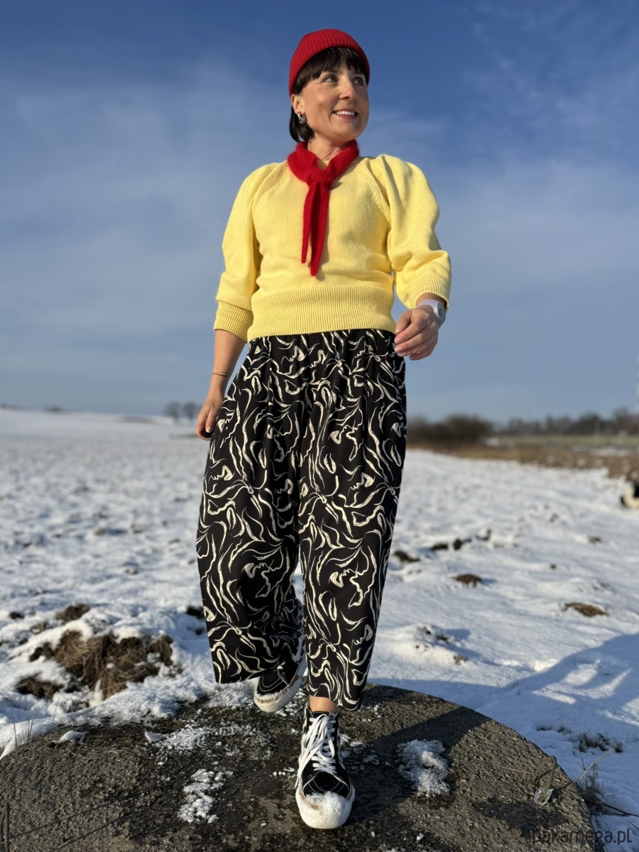 Z przodu trzy zakładki, dzięki którym nogawki są maksymalnie szerokie, a całość faluje przy każdym kroku. W ruchu wyglądają niemal jak spódnica, ale z wygodą spodni.