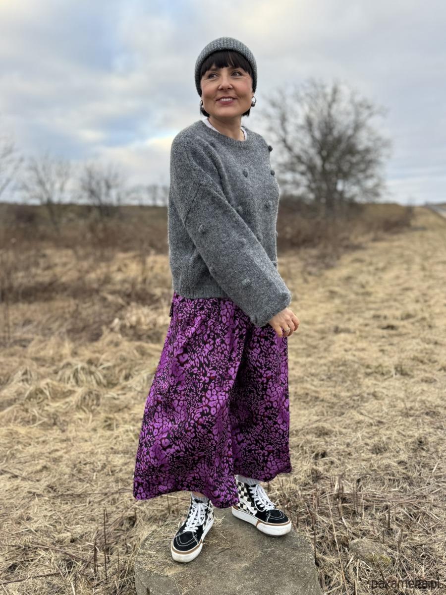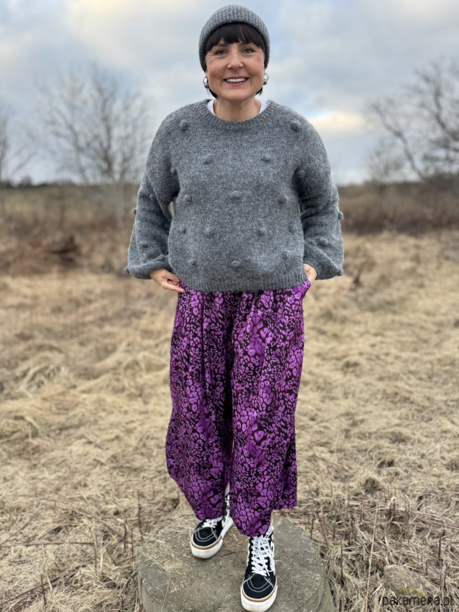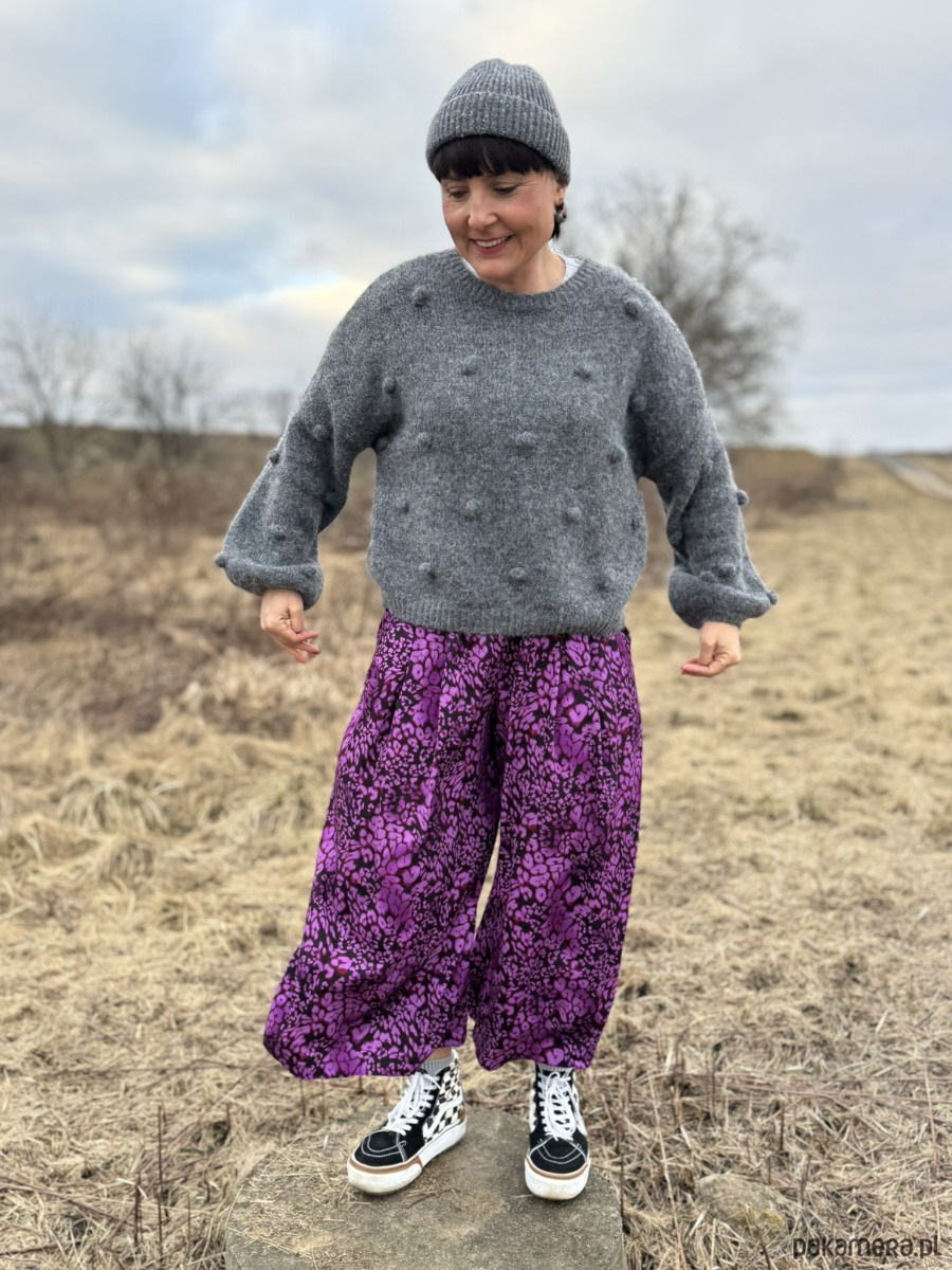 Luźne, szerokie i absolutnie przyciągające spojrzenia. Te wiskozowe spodnie w intensywnym, różowo-fioletowym princie w cętki są dla kobiet, które lubią kolor, energię i odrobinę pazura w stylizacji.