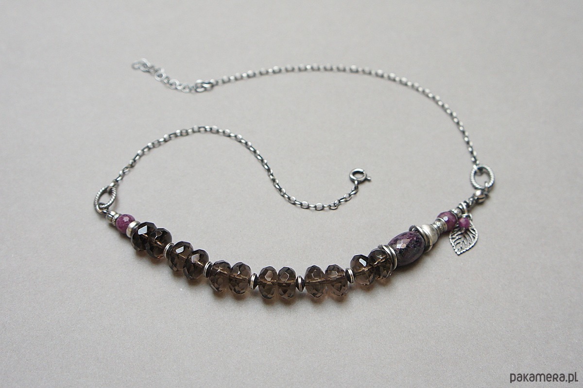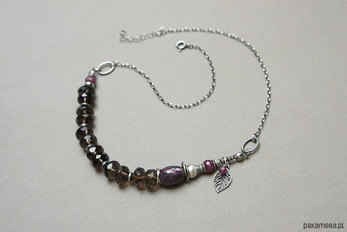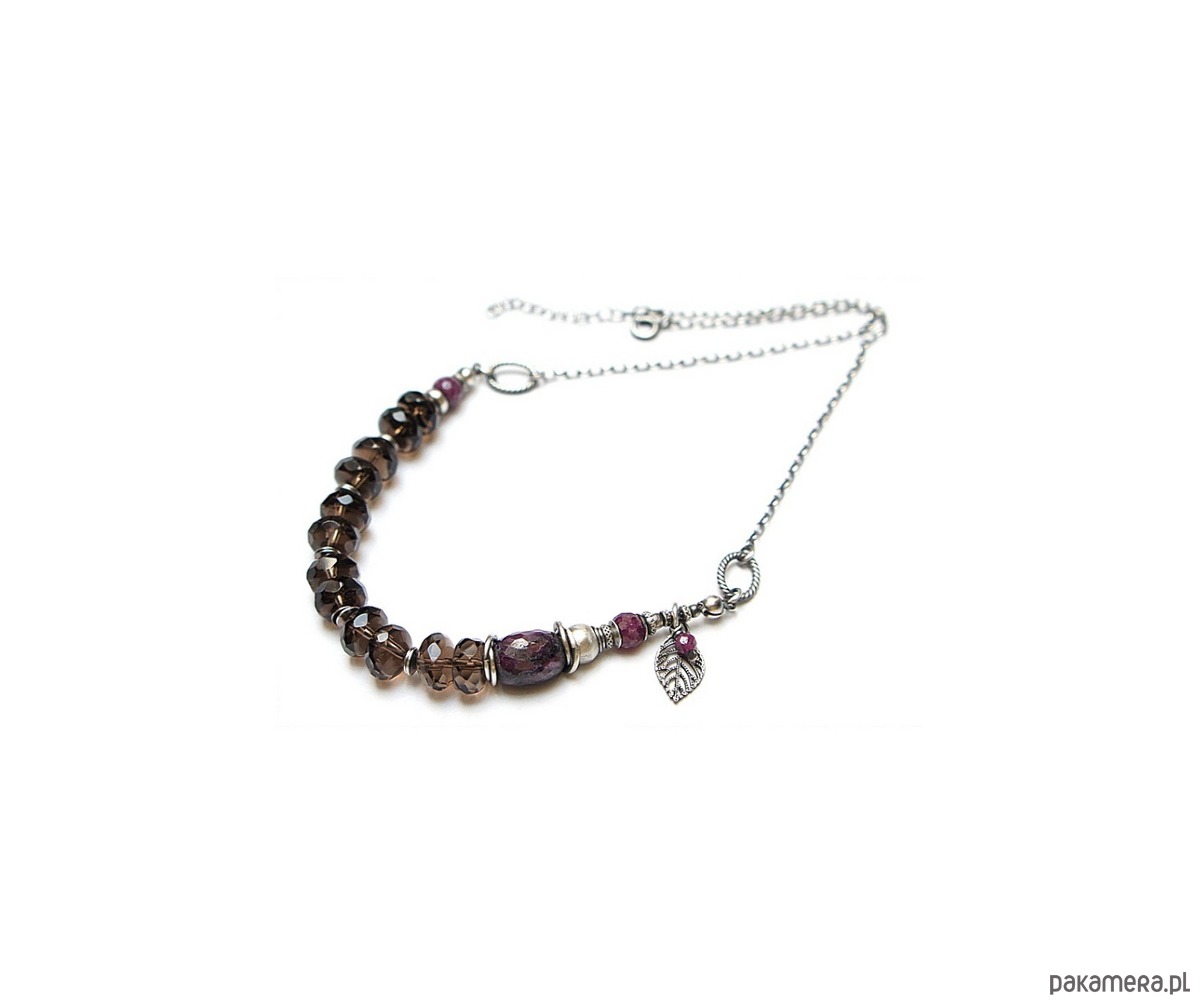 Naszyjnik wykonany ze srebra [pr.925] w połączeniu z oponkami fasetowanymi kwarcu dymnego [10mm], kuleczkami fasetowanymi rubinów [6mm] oraz dużą, fasetowaną oponką rubinu [14mm]. Całość oksydowana i przetarta. Całkowita długość naszyjnika ok. 43,5cm plus przedłużka. Biżuteria ozdobnie zapakowana.
