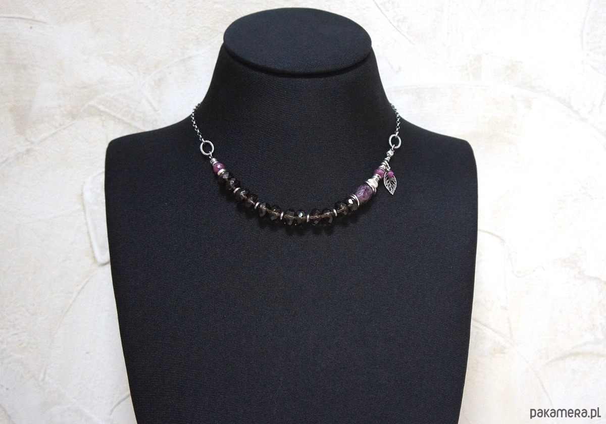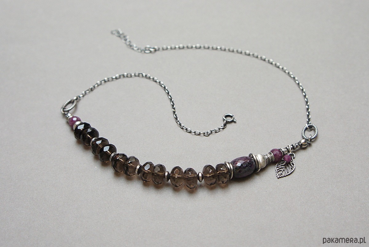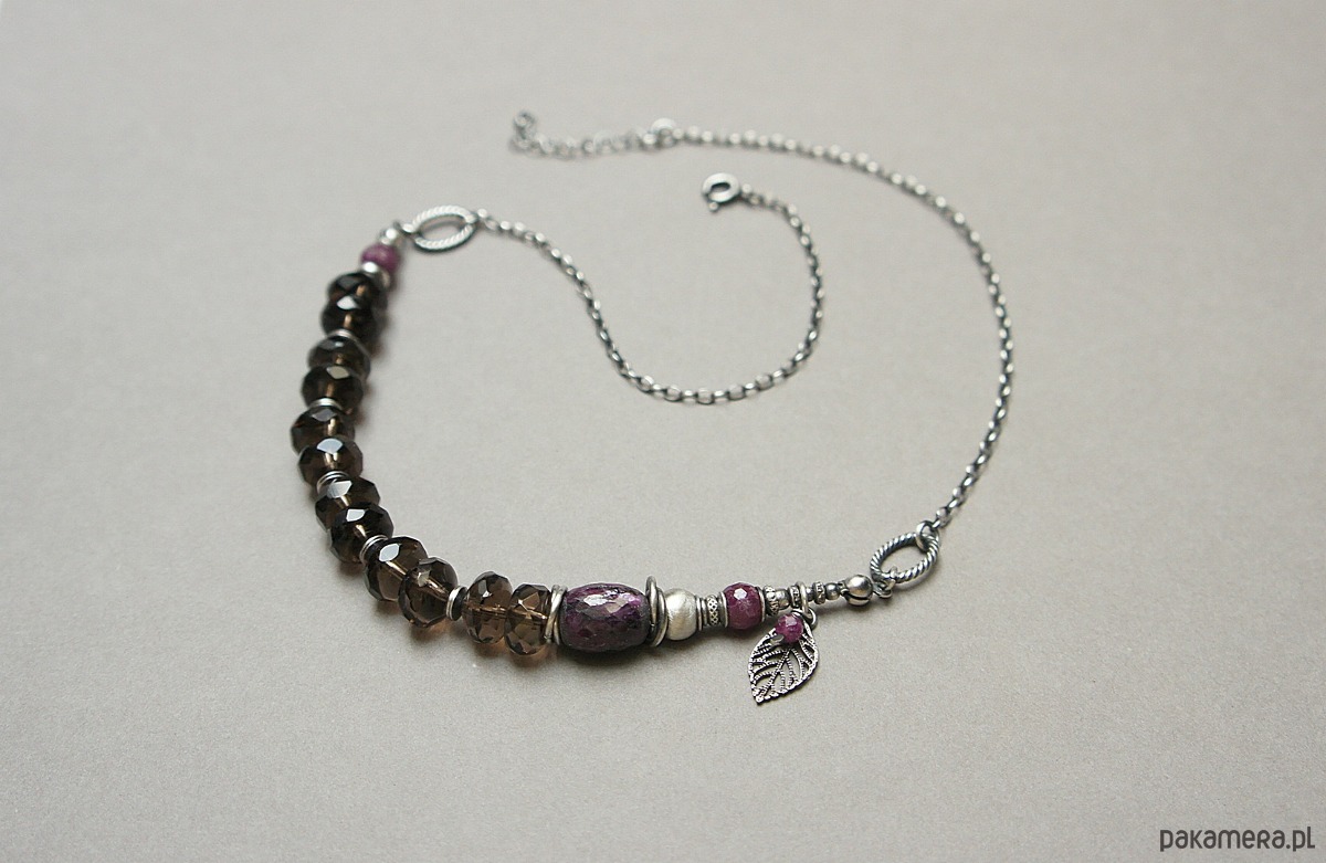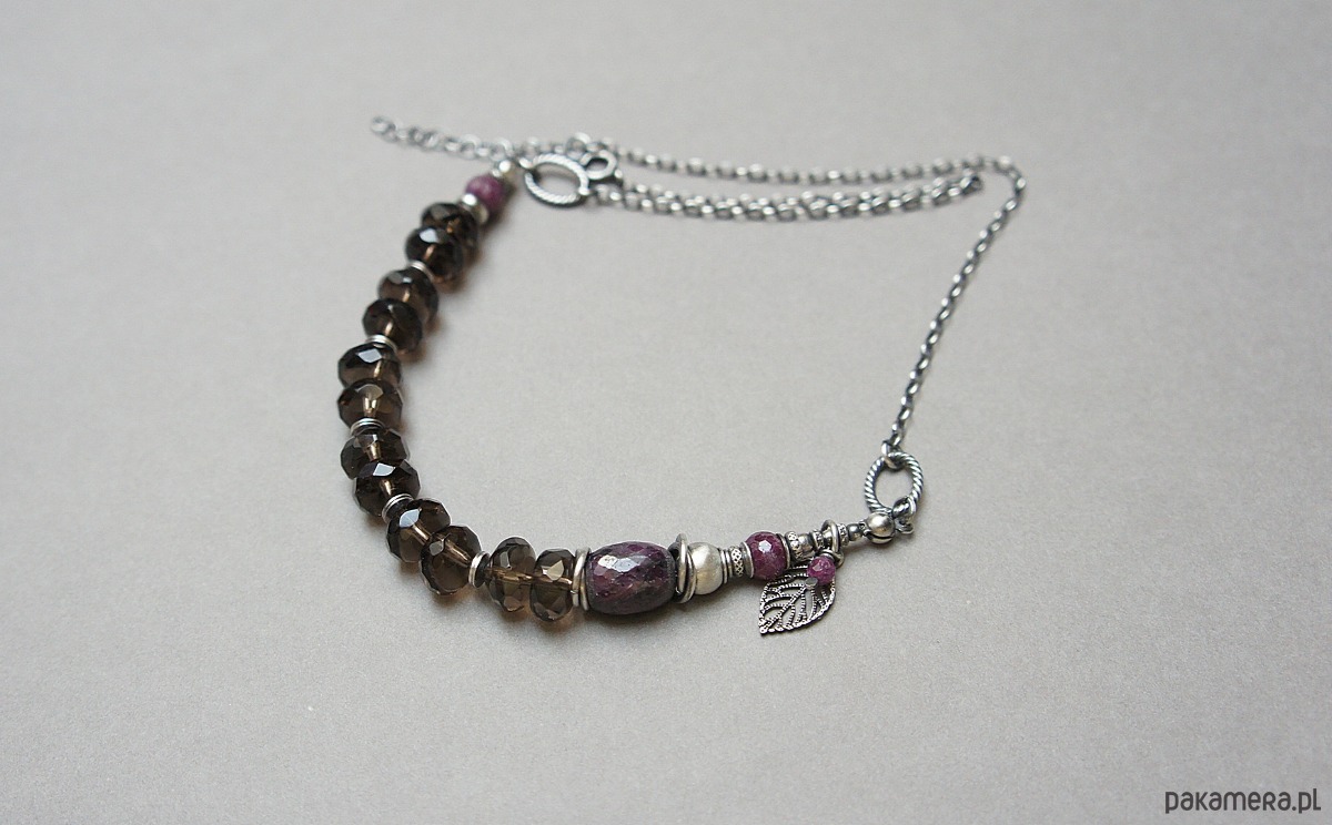 Naszyjnik wykonany ze srebra [pr.925] w połączeniu z oponkami fasetowanymi kwarcu dymnego [10mm], kuleczkami fasetowanymi rubinów [6mm] oraz dużą, fasetowaną oponką rubinu [14mm]. Całość oksydowana i przetarta. Całkowita długość naszyjnika ok. 43,5cm plus przedłużka. Biżuteria ozdobnie zapakowana.