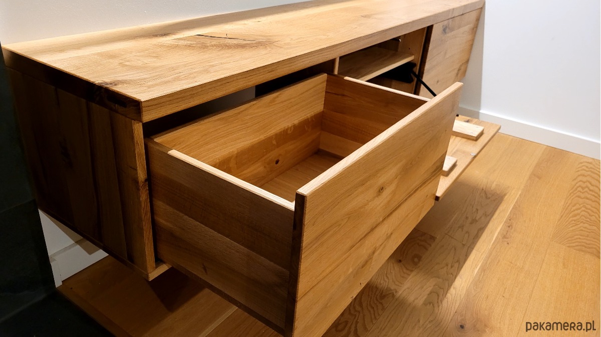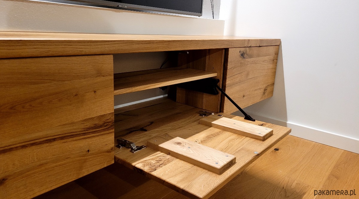 Wszystkie akcesoria meblowe zastosowane w szafce RTV są marki Blum.