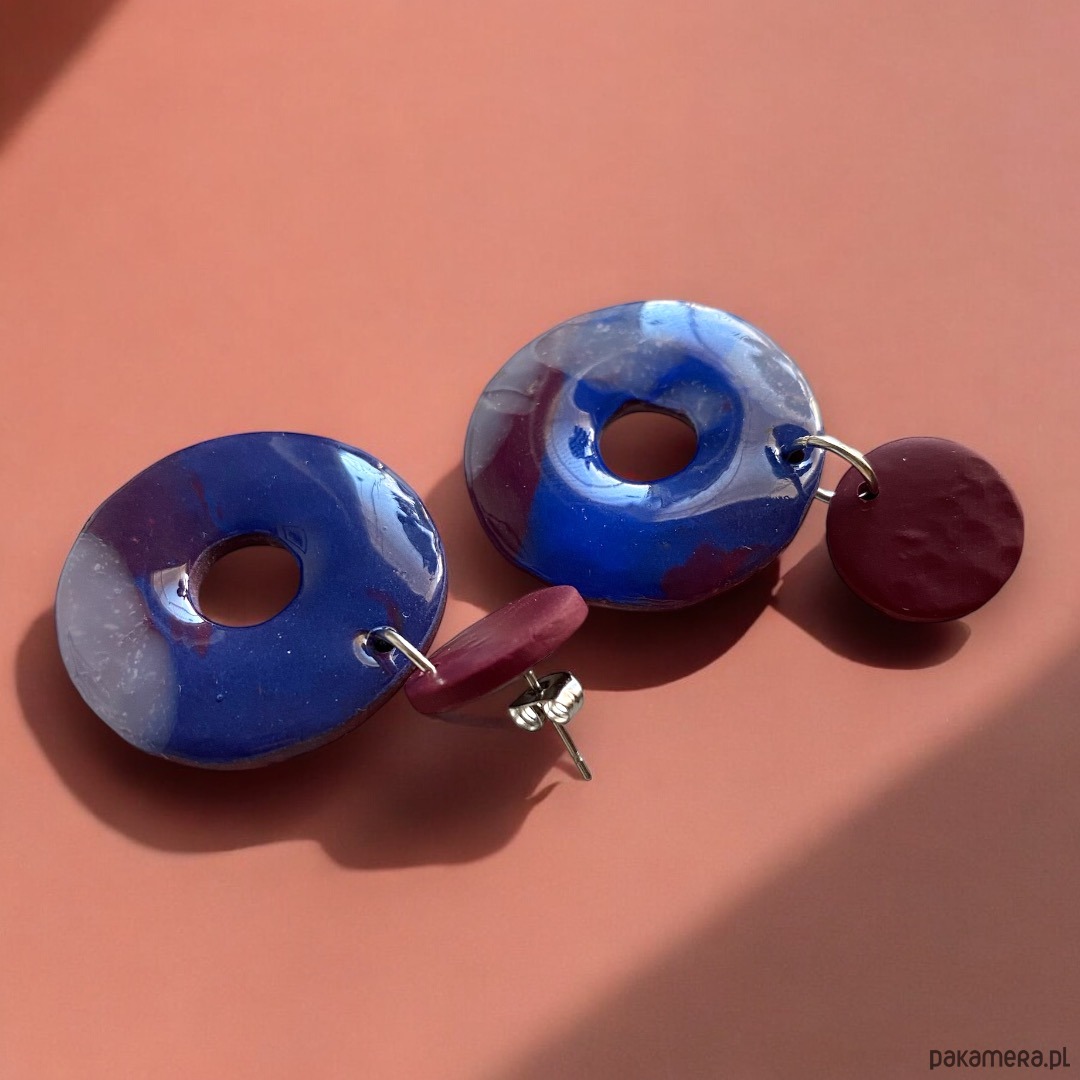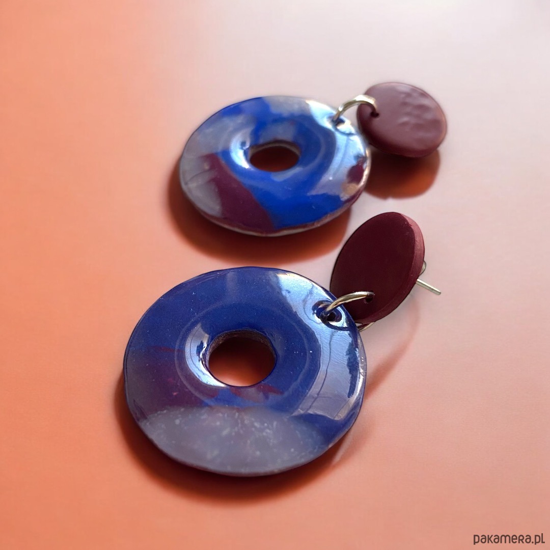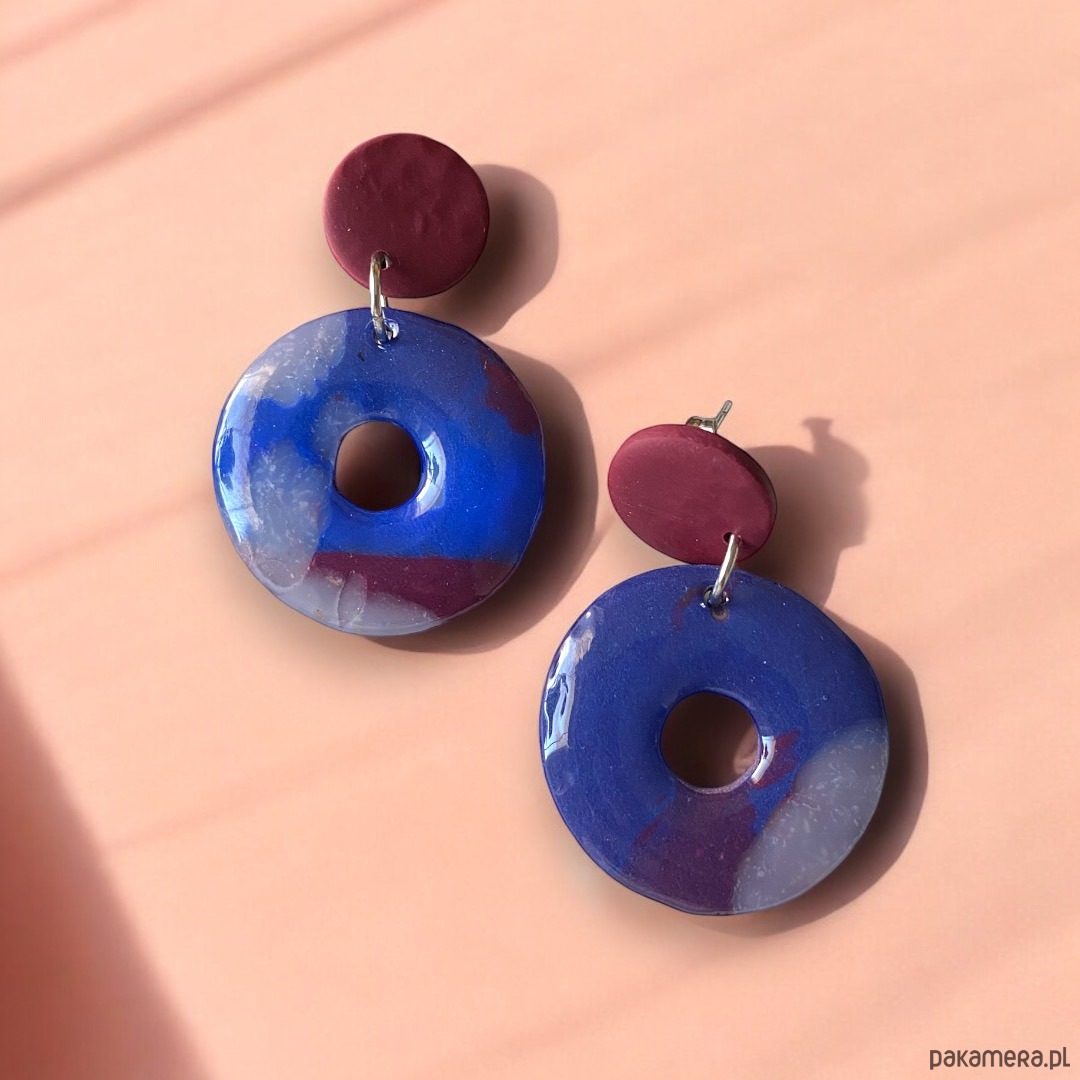 Wiszące kolczyki złożone z 2 kształtów. Duże kółko pokryte żywicą z przodu i z tyłu.