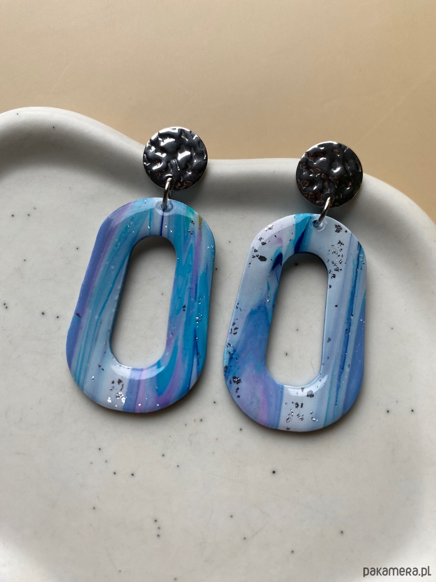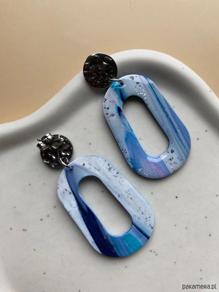 Wiszące kolczyki złożone z 2 kształtów. Z przodu pokryte żywicą. Element z glinki pięknie się błyszczy. Sztyft okrągły z gniecionej stali nierdzewnej.