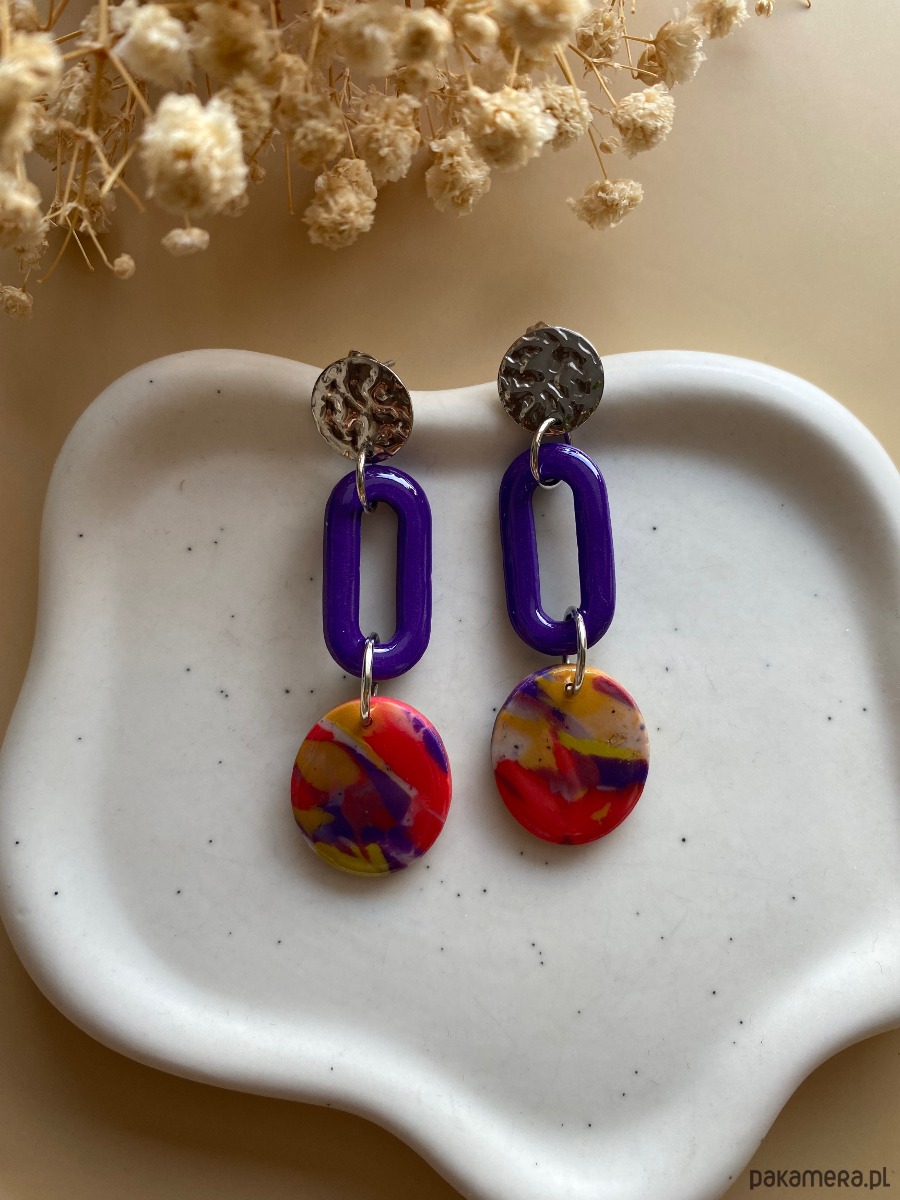 Wiszące kolczyki wielokolorowe. Z przodu i tyłu pokryte żywicą. Sztyft okrągły z wgnieceniami.