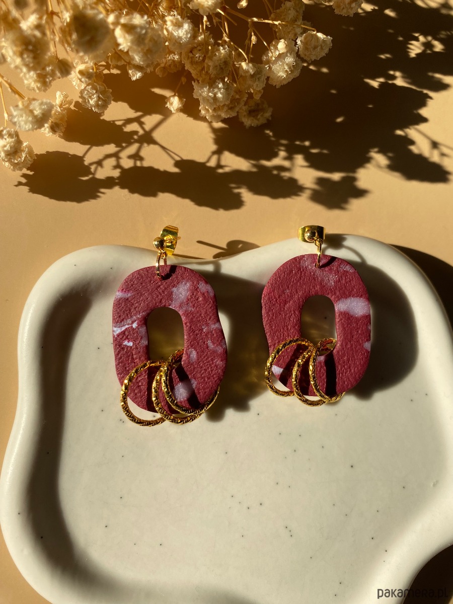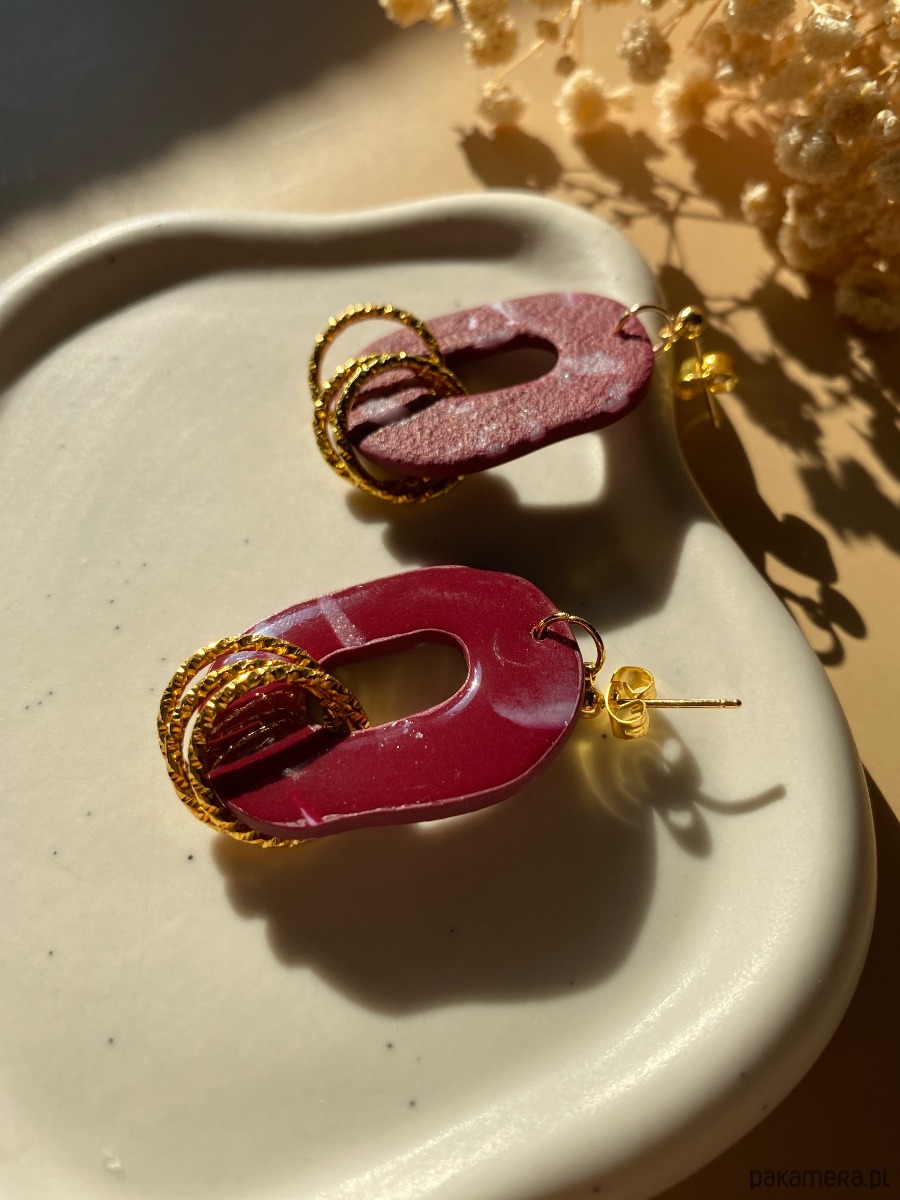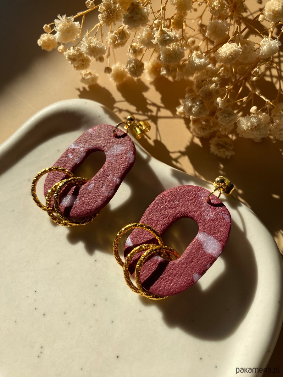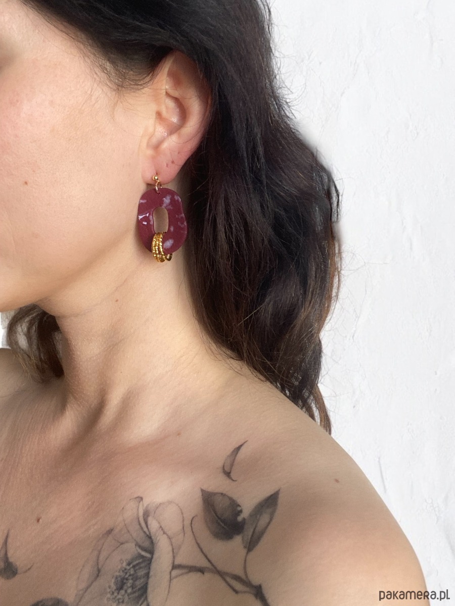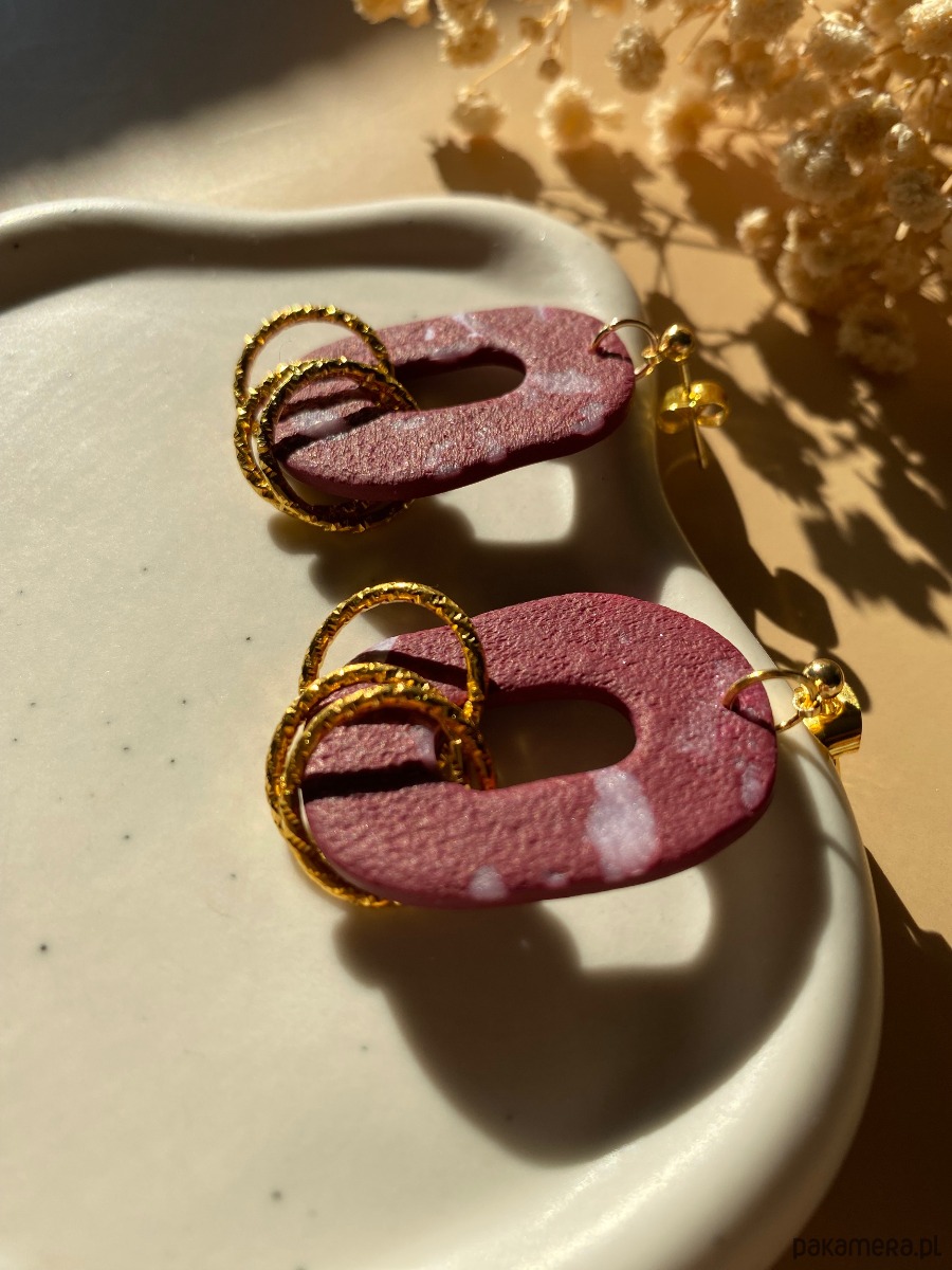 Wiszące kolczyki w kształcie nieregularnego owalu. Z przodu matowe, z tyłu pokryte żywicą. Charakteru dodają im zawieszone 3 złote kółka.