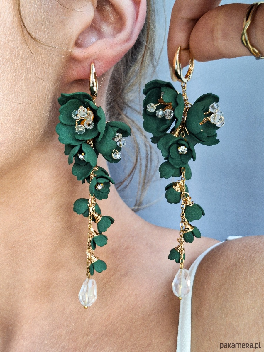 Wyjątkowe, artystyczne kolczyki, które zachwycają swoją lekkością i detalem. Każdy kwiat został wykonany ręcznie, a całość uzupełniają kryształowe akcenty oraz złocone elementy, nadające im elegancji i blasku.