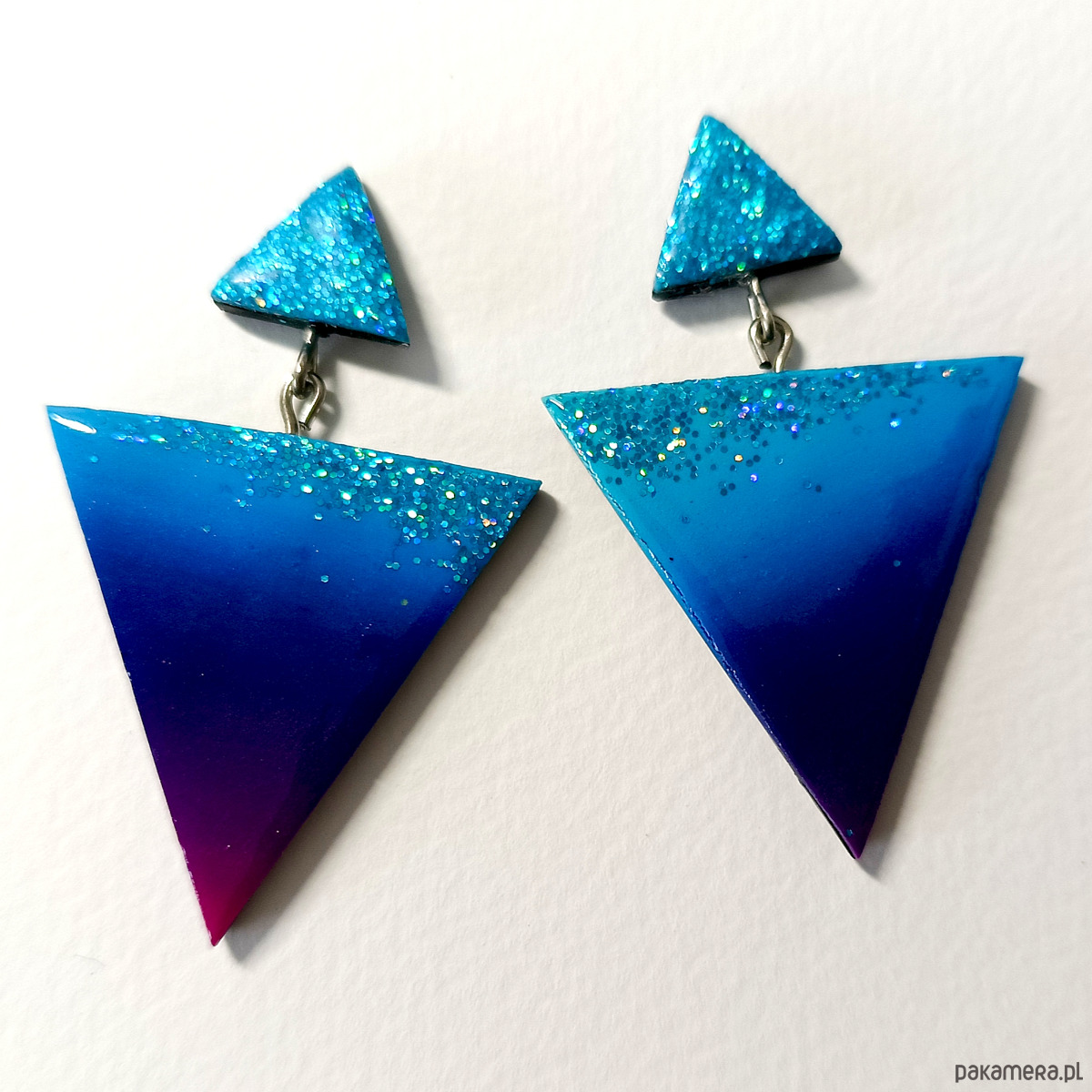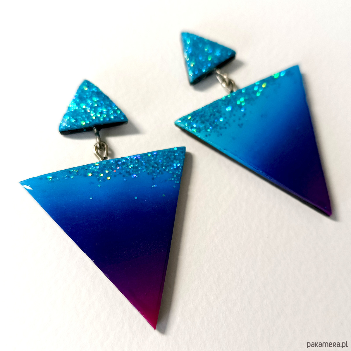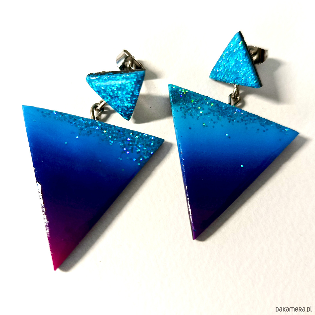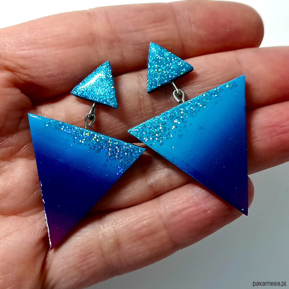 Wiszące kolczyki w stylu retro, inspirowane latami 80. i 90., w kształcie trójkątów w odcieniach niebieskiego i fioletu z brokatowym połyskiem. Całkowita długość kolczyków to 5 cm – dolny trójkąt ma 3 cm, a górny, przy uchu, 12 mm. Elementy metalowe wykonane są ze stali nierdzewnej, co zapewnia trwałość i komfort noszenia. Idealne dla miłośniczek wyrazistej biżuterii i stylu vintage.