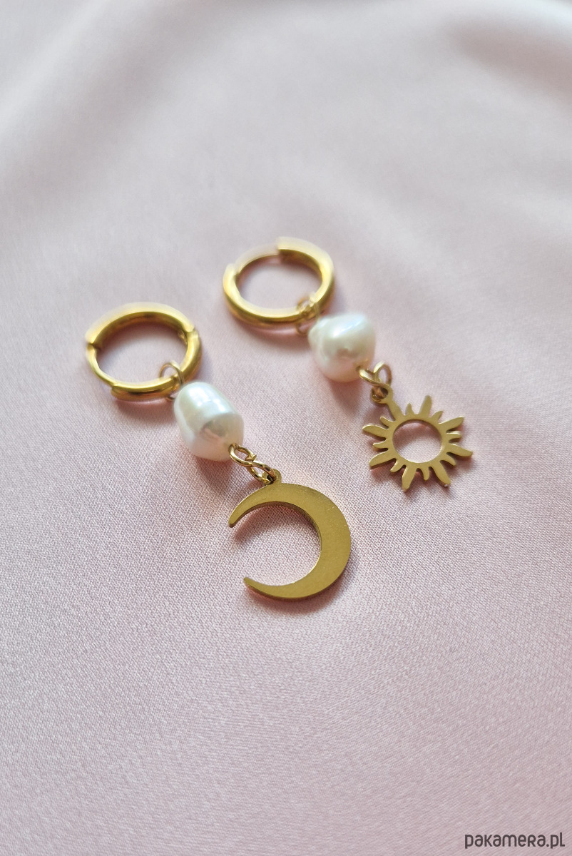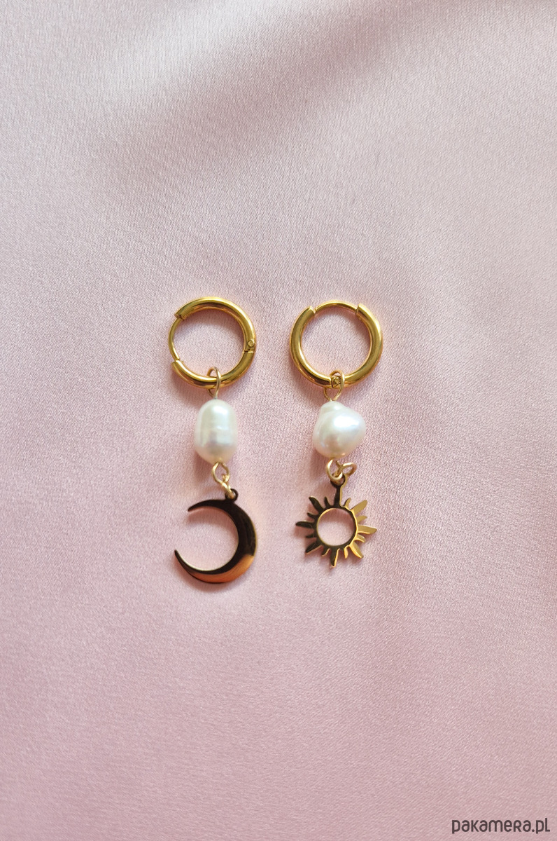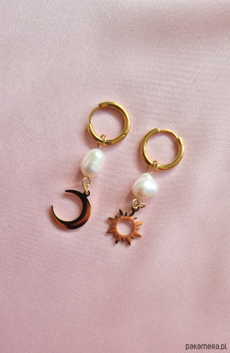 Wiszące kolczyki wykonane z pereł oraz stali chirurgicznej.