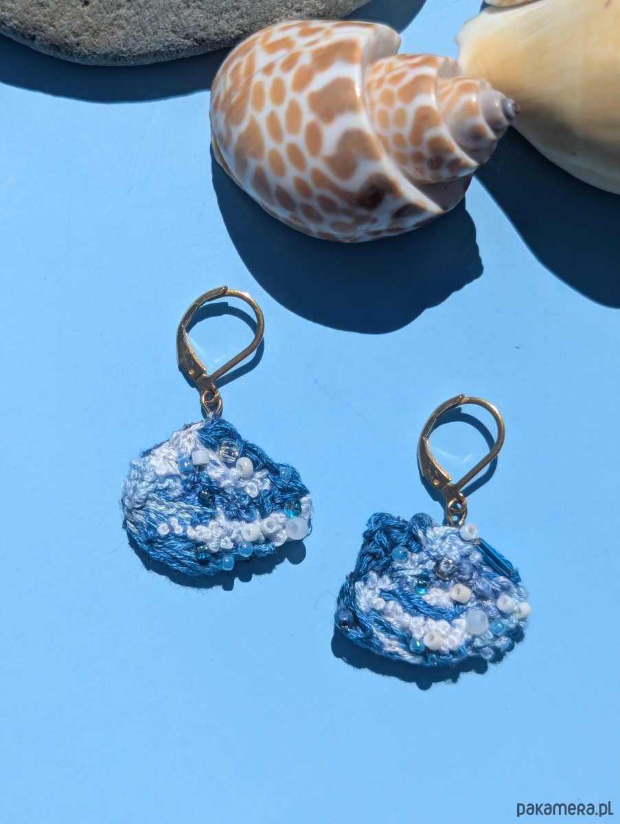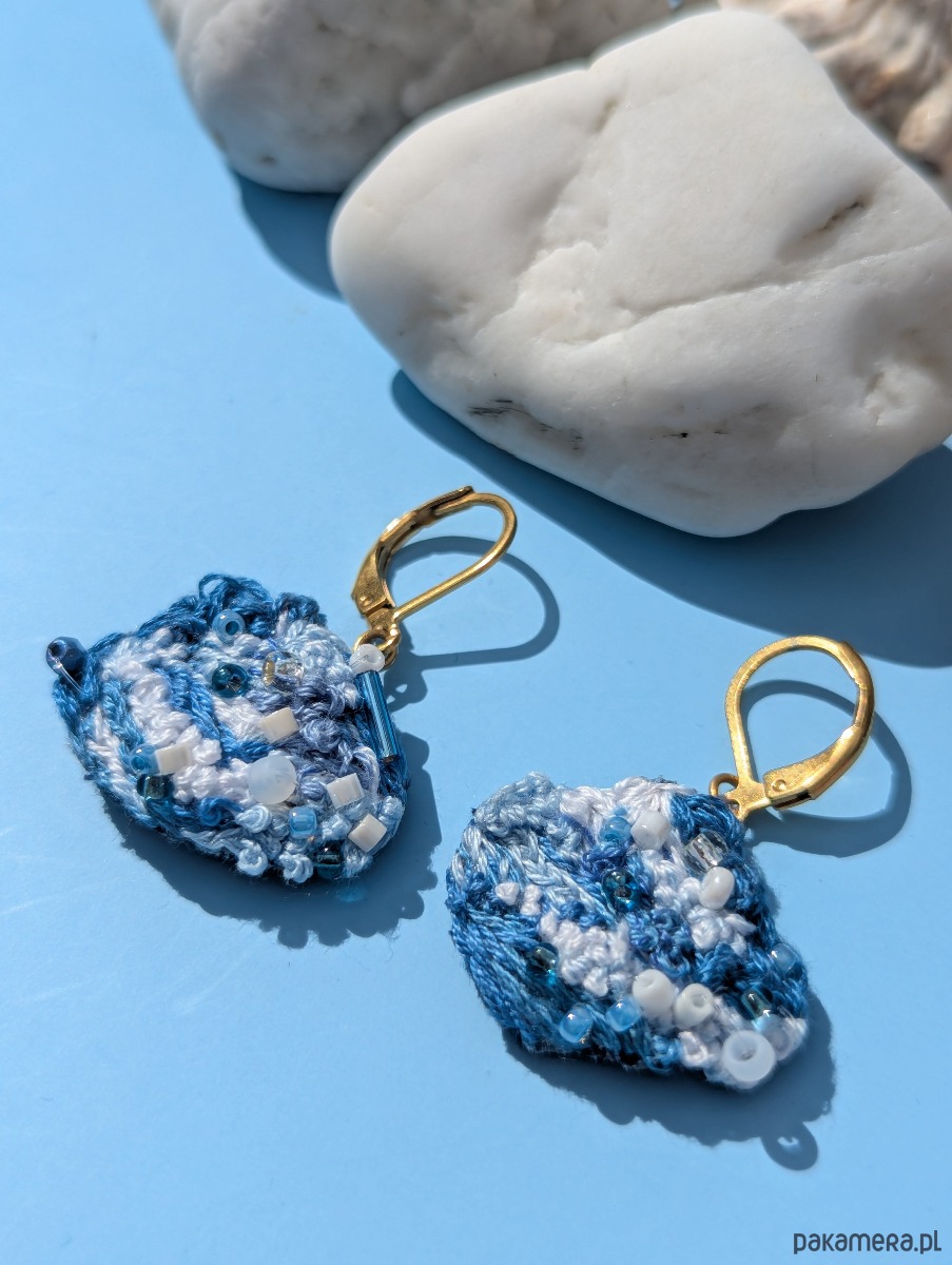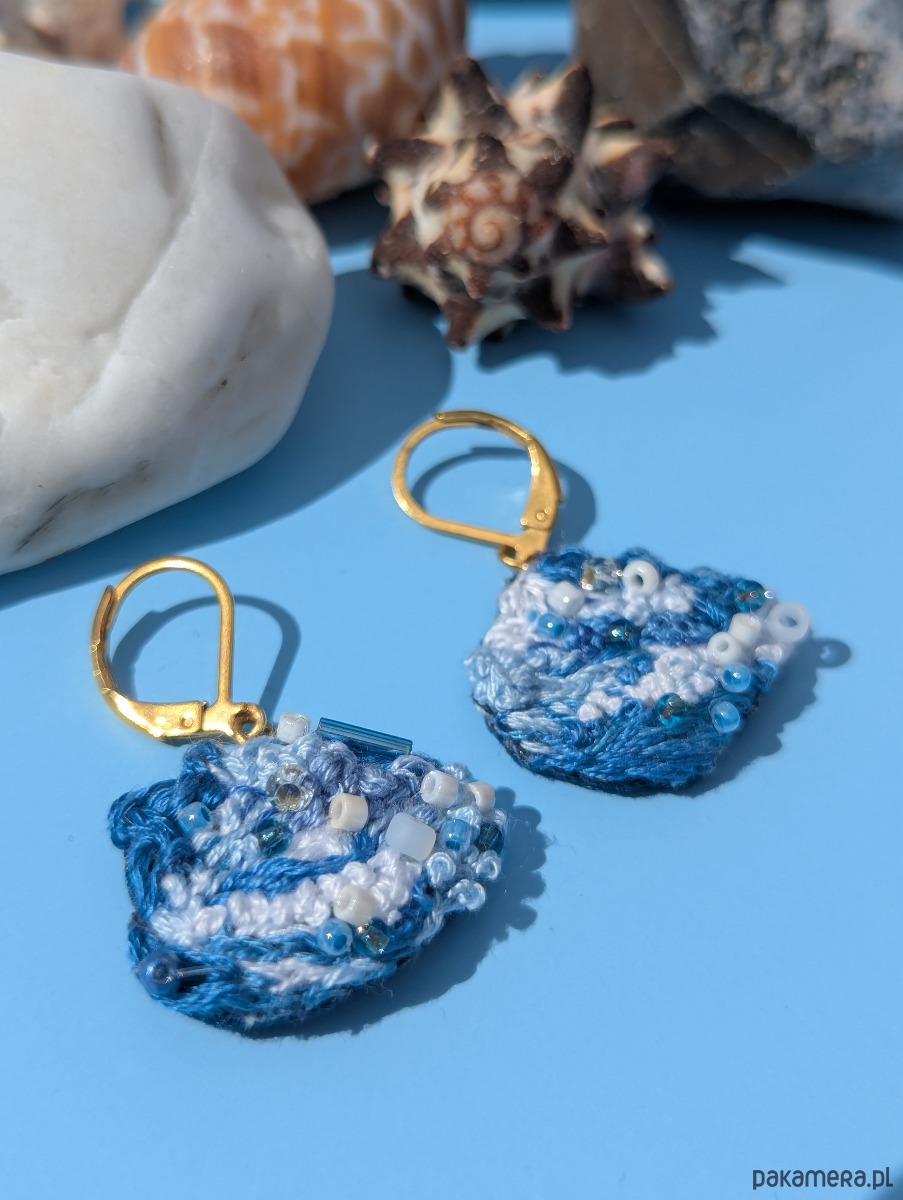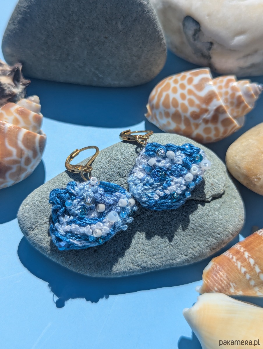 Morze nigdy nie powtarza swoich fal – tak samo jak te kolczyki, które powstały w pojedynczych egzemplarzach. Każda para z kolekcji „Szepty Morza” została ręcznie wyhaftowana w abstrakcyjnych, nieregularnych formach przypominających falującą wodę. Błękity, granaty i biel przeplatają się z połyskiem koralików, które odbijają światło niczym refleksy słońca na tafli morza.