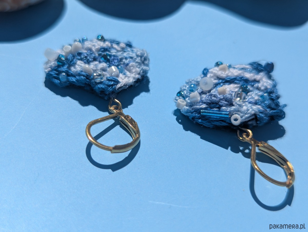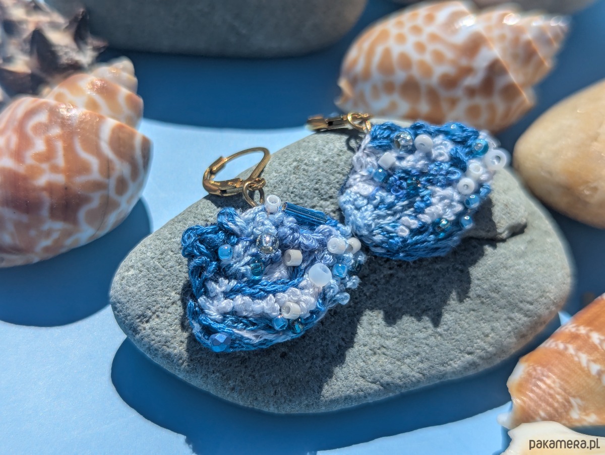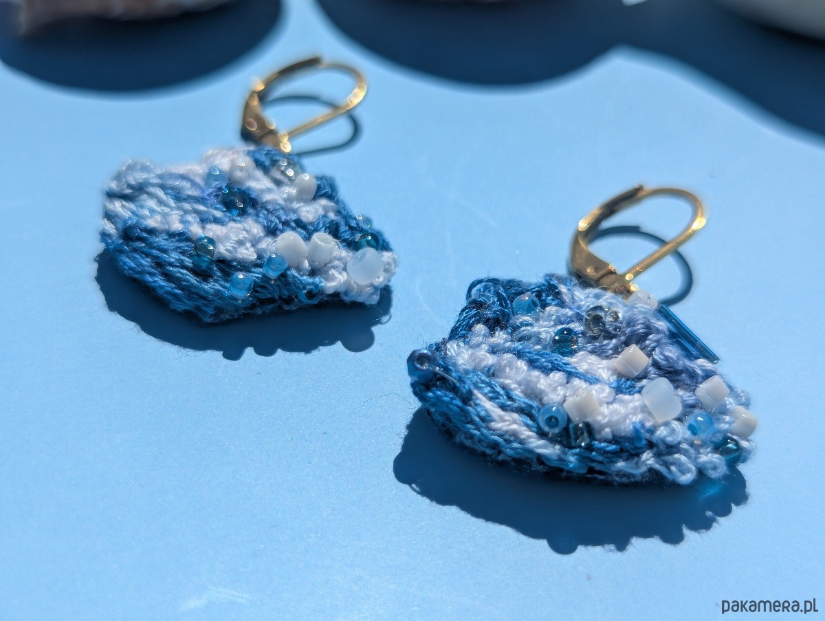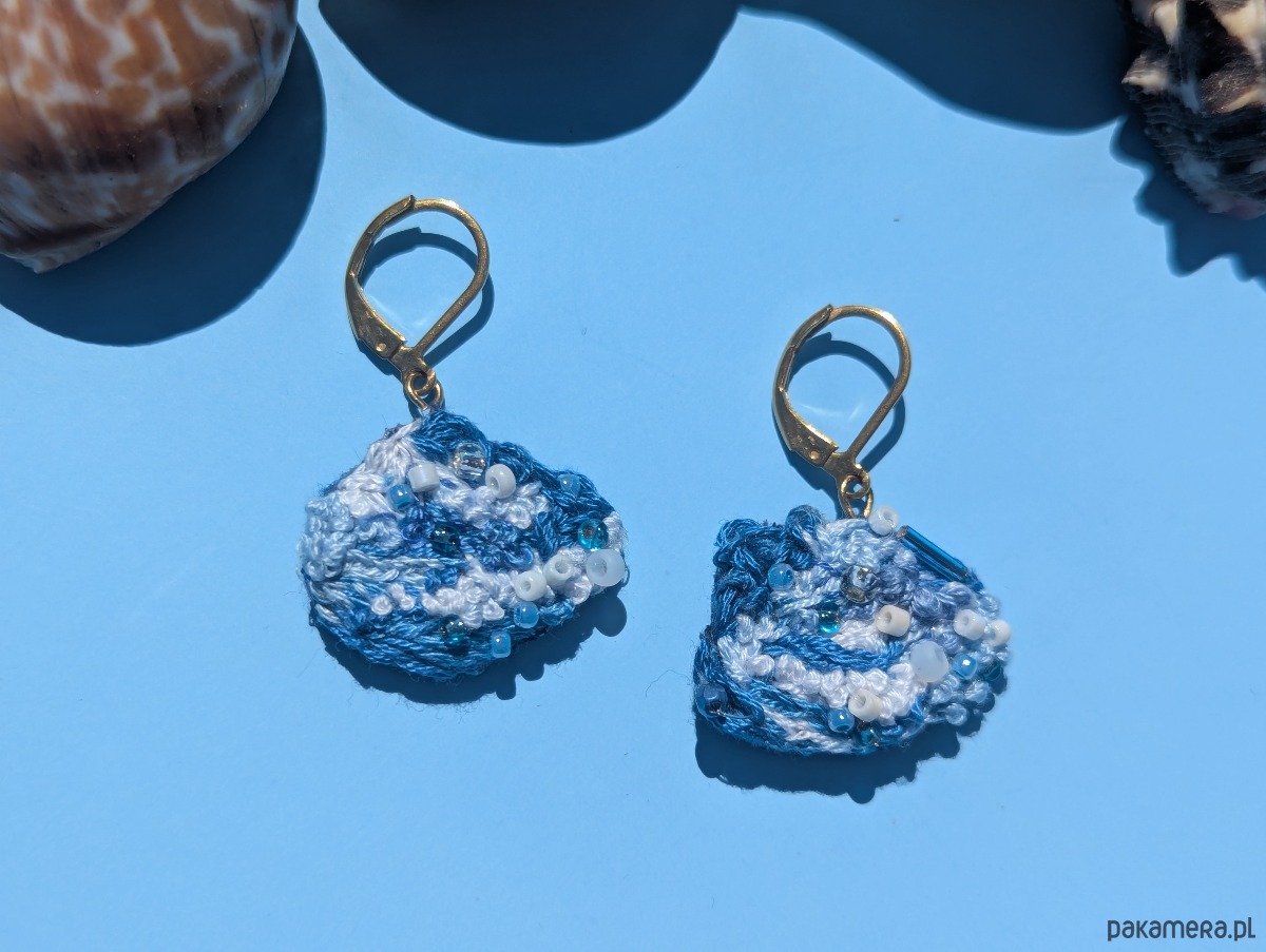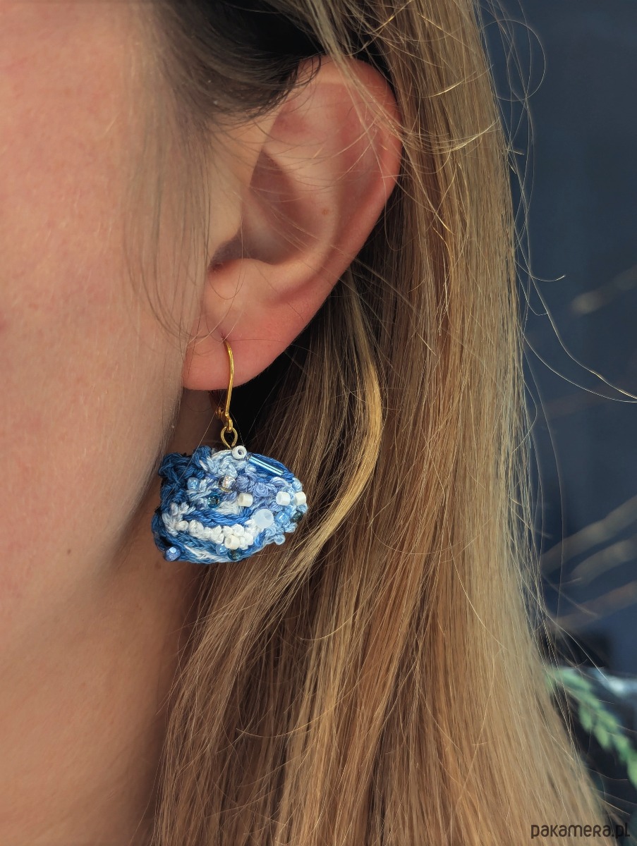 Morze nigdy nie powtarza swoich fal – tak samo jak te kolczyki, które powstały w pojedynczych egzemplarzach. Każda para z kolekcji „Szepty Morza” została ręcznie wyhaftowana w abstrakcyjnych, nieregularnych formach przypominających falującą wodę. Błękity, granaty i biel przeplatają się z połyskiem koralików, które odbijają światło niczym refleksy słońca na tafli morza.