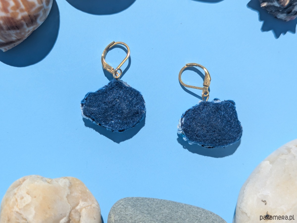 Bawełniana tkanina, bawełniane nici, dekoracje ze szklanych koralików. Kolczyki zawieszone na hipoalergicznych biglach ze stali chirurgicznej w kolorze złotym. Tył wykończony został granatowym filcem.