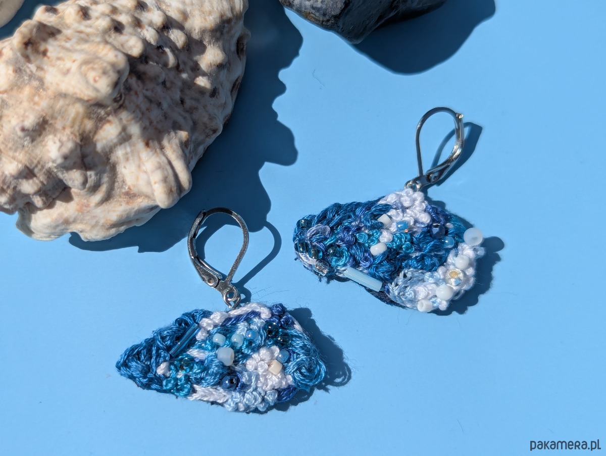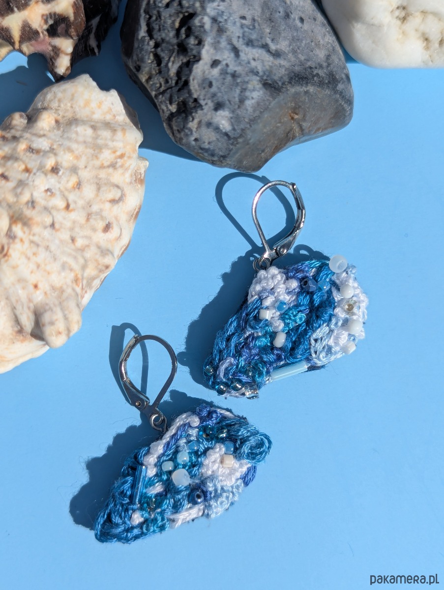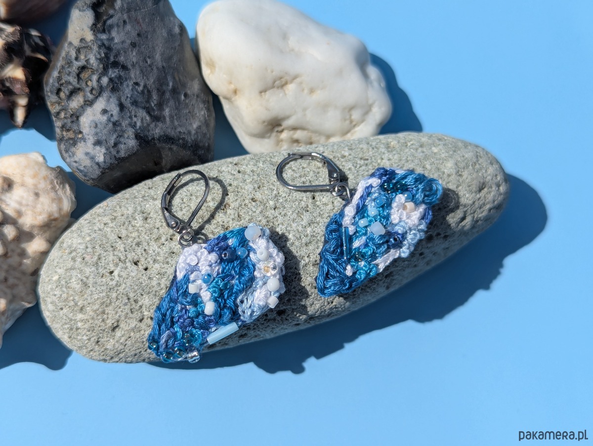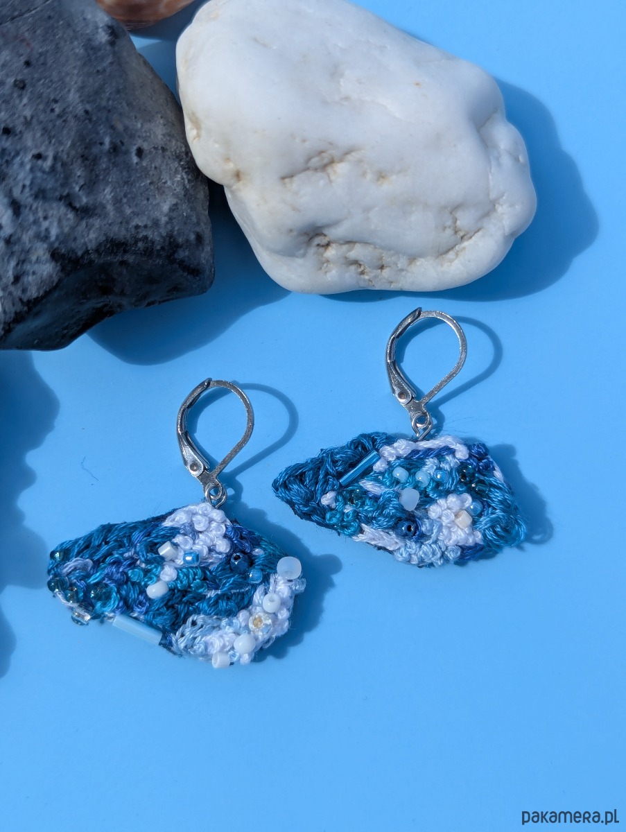 Kolczyki pochodzą z kolekcji „Szepty Morza”. Morze nigdy nie powtarza swoich fal – tak samo jak te kolczyki, które powstały w pojedynczych egzemplarzach. Zostały one ręcznie wyhaftowane w abstrakcyjnych, nieregularnych formach przypominających falującą wodę. Błękity, granaty i biel przeplatają się z połyskiem koralików, które odbijają światło niczym refleksy słońca na tafli morza.