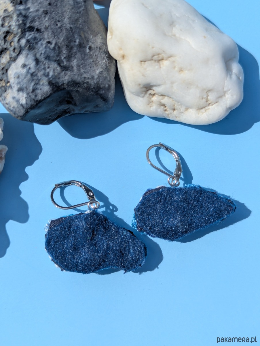 Bawełniana tkanina, bawełniane nici, dekoracje ze szklanych koralików. Kolczyki zawieszone na hipoalergicznych biglach ze stali chirurgicznej w kolorze srebrnym. Tył wykończony został granatowym filcem.