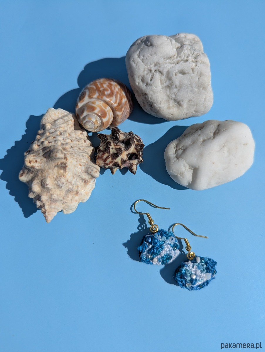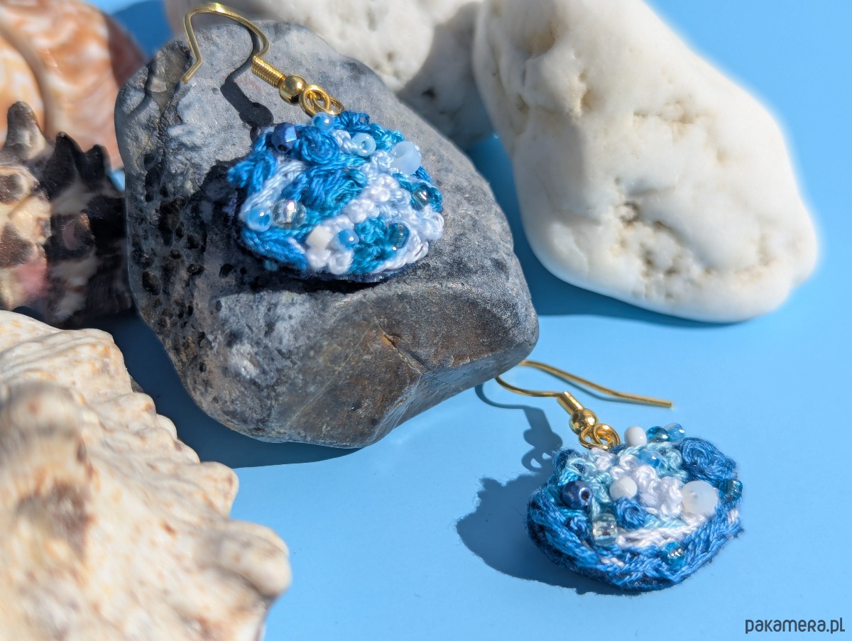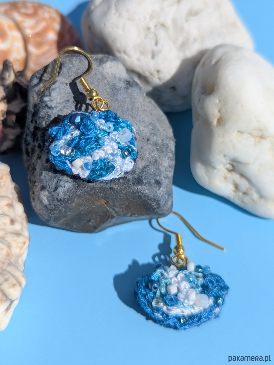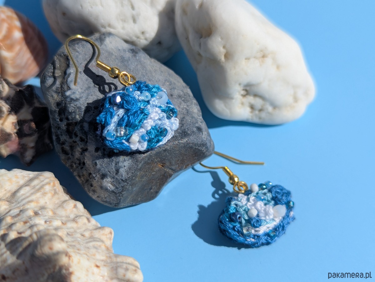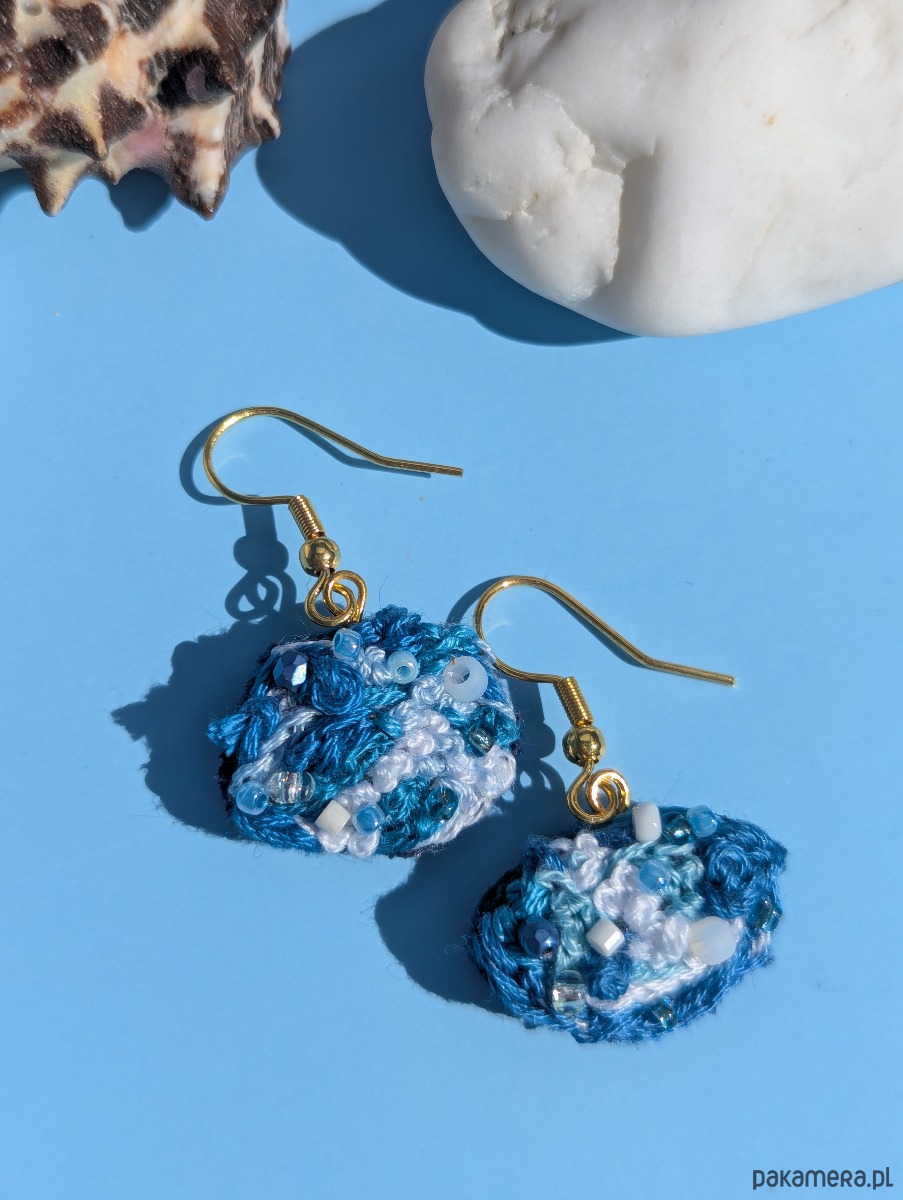 Morze nigdy nie powtarza swoich fal – tak samo jak te kolczyki, które powstały w pojedynczych egzemplarzach. Kolczyki pochodzą z kolekcji „Szepty Morza”. Zostały one ręcznie wyhaftowane w abstrakcyjnych, nieregularnych formach przypominających falującą wodę. Błękity, granaty i biel przeplatają się z połyskiem koralików, które odbijają światło niczym refleksy słońca na tafli morza.
