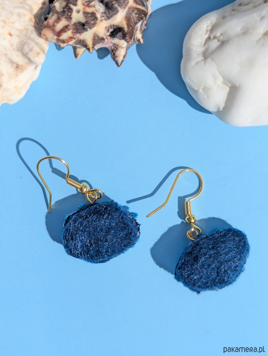 Bawełniana tkanina, bawełniane nici, dekoracje ze szklanych koralików. Kolczyki zawieszone na hipoalergicznych biglach ze stali chirurgicznej w kolorze złotym. Tył wykończony został granatowym filcem.