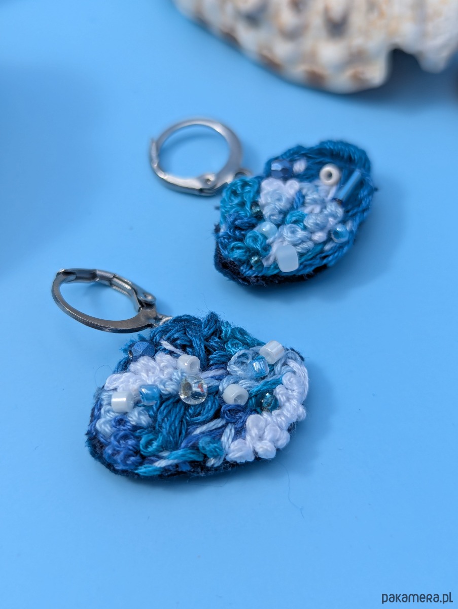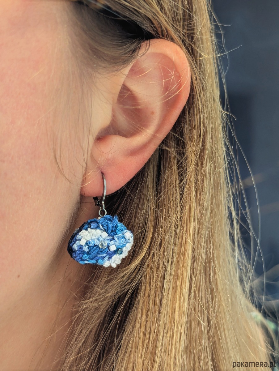 Morze nigdy nie powtarza swoich fal – tak samo jak te kolczyki, które powstały w pojedynczych egzemplarzach. Kolczyki pochodzą z kolekcji „Szepty Morza”. Zostały one ręcznie wyhaftowane w abstrakcyjnych, nieregularnych formach przypominających falującą wodę. Błękity, granaty i biel przeplatają się z połyskiem koralików, które odbijają światło niczym refleksy słońca na tafli morza.