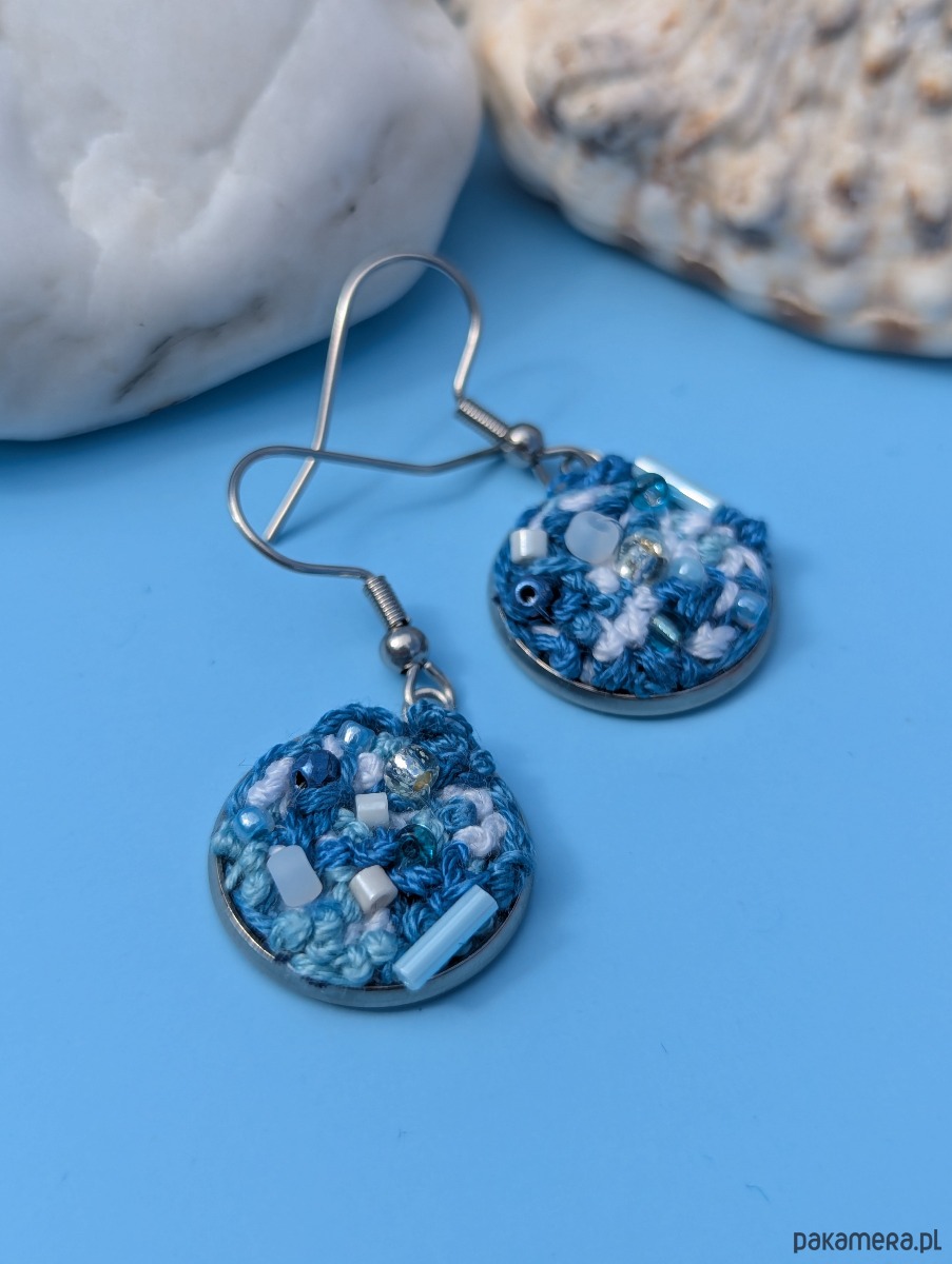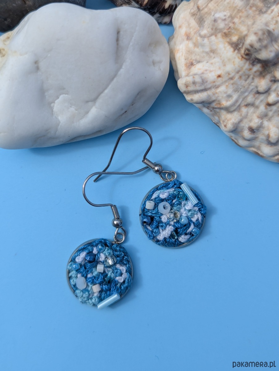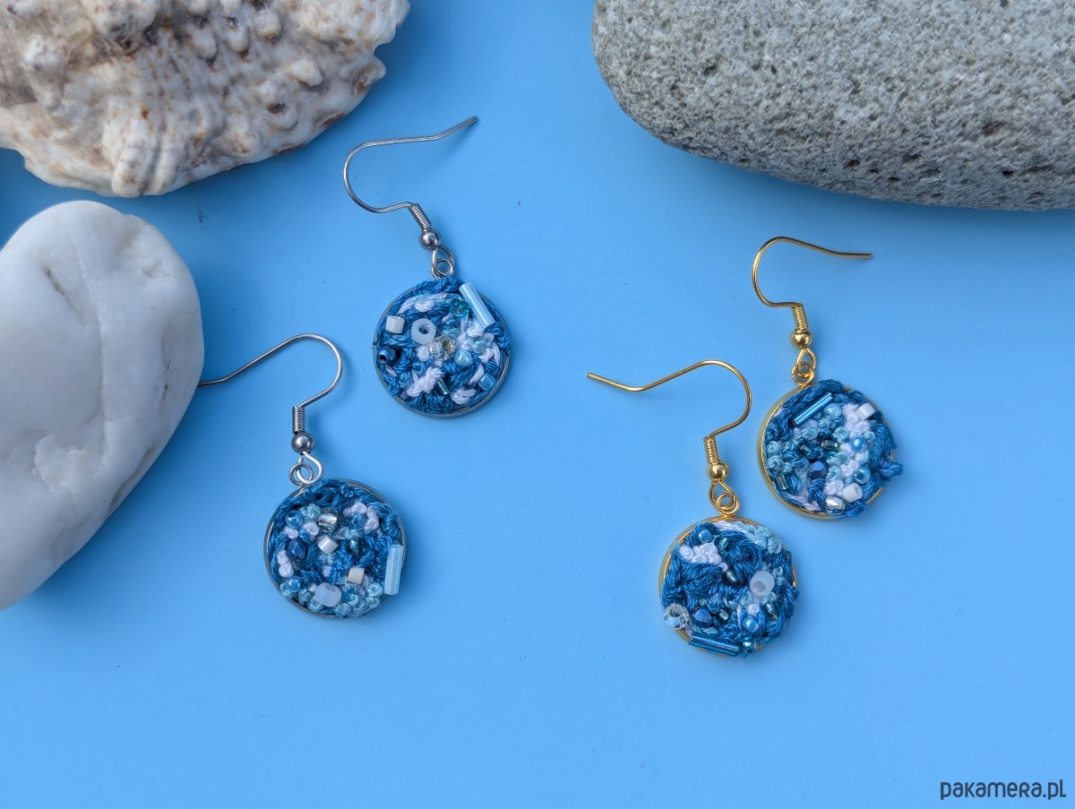 Kolczyki pochodzą z kolekcji „Szepty Morza”. Błękity, granaty i biel przeplatają się z połyskiem koralików, które odbijają światło niczym refleksy słońca na tafli morza. Nie ma dwóch takich samych fal, tak jak nie ma dwóch identycznych par kolczyków w tej kolekcji