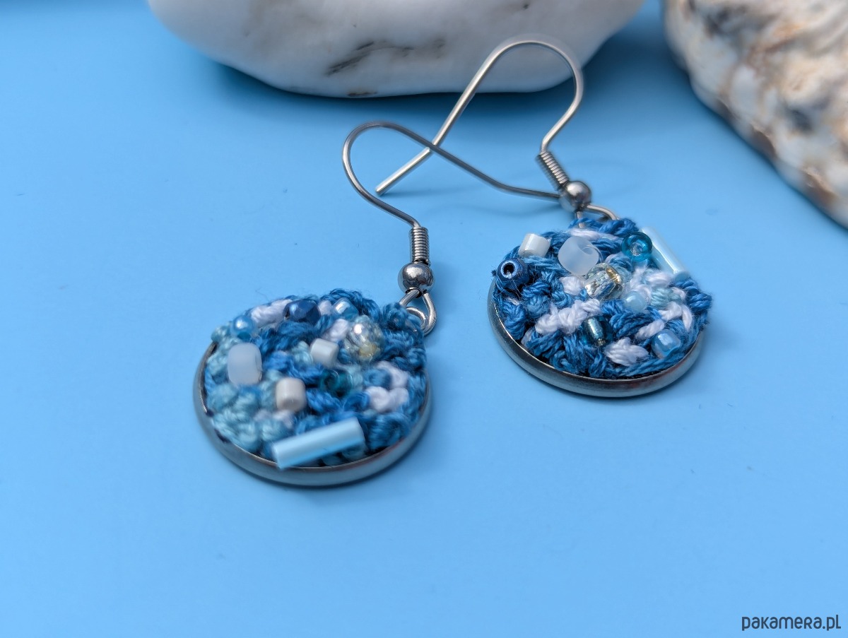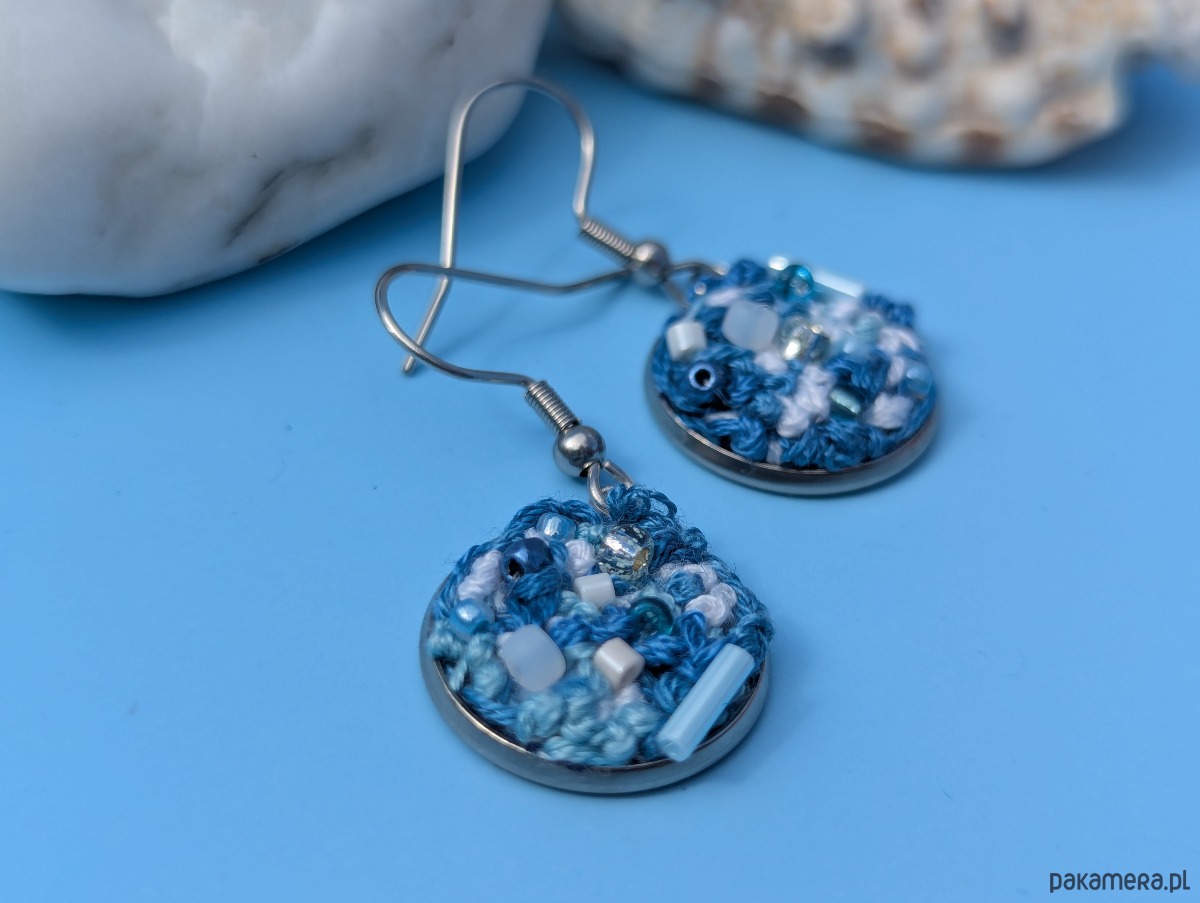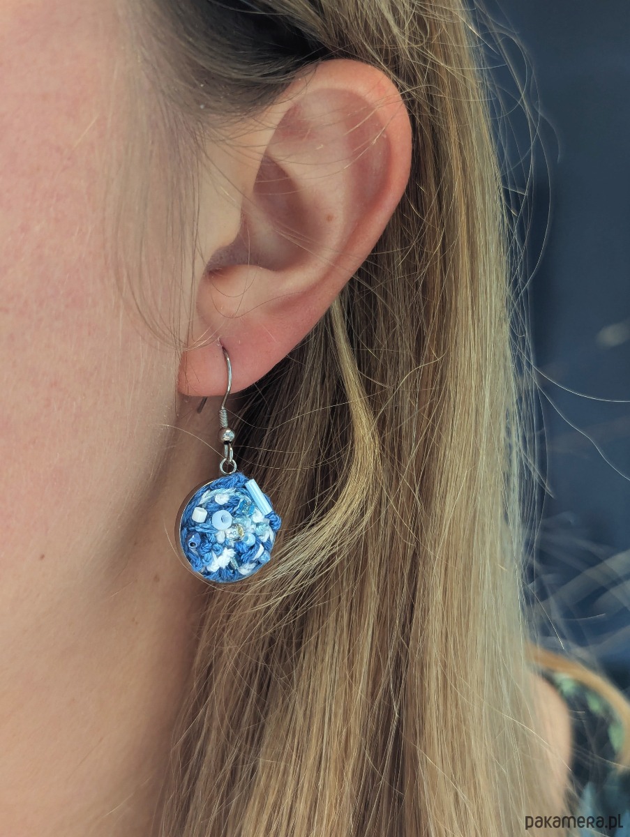 Kolczyki pochodzą z kolekcji „Szepty Morza”. Błękity, granaty i biel przeplatają się z połyskiem koralików, które odbijają światło niczym refleksy słońca na tafli morza. Nie ma dwóch takich samych fal, tak jak nie ma dwóch identycznych par kolczyków w tej kolekcji